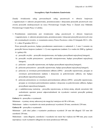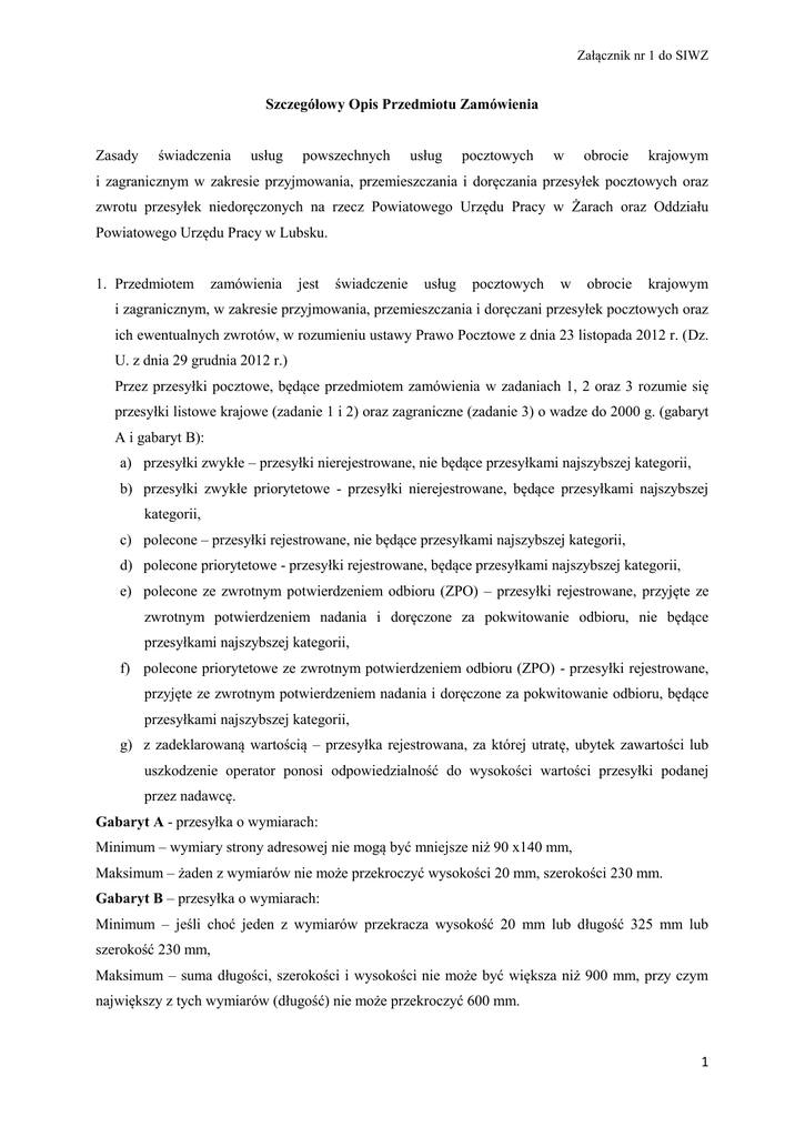 Załącznik nr 1 do SIWZ Szczegółowy Opis Przedmiotu Zamówienia Zasady świadczenia usług powszechnych usług pocztowych w obrocie krajowym i zagranicznym w zakresie przyjmowania, przemieszczania i doręczania przesyłek pocztowych oraz zwrotu przesyłek niedoręczonych na rzecz Powiatowego Urzędu Pracy w Żarach oraz Oddziału Powiatowego Urzędu Pracy w Lubsku. 1. Przedmiotem zamówienia jest świadczenie usług pocztowych w obrocie krajowym i zagranicznym, w zakresie przyjmowania, przemieszczania i doręczani przesyłek pocztowych oraz ich ewentualnych zwrotów, w rozumieniu ustawy Prawo Pocztowe z dnia 23 listopada 2012 r. (Dz. U. z dnia 29 grudnia 2012 r.) Przez przesyłki pocztowe, będące przedmiotem zamówienia w zadaniach 1, 2 oraz 3 rozumie się przesyłki listowe krajowe (zadanie 1 i 2) oraz zagraniczne (zadanie 3) o wadze do 2000 g. (gabaryt A i gabaryt B): a) przesyłki zwykłe – przesyłki nierejestrowane, nie będące przesyłkami najszybszej kategorii, b) przesyłki zwykłe priorytetowe - przesyłki nierejestrowane, będące przesyłkami najszybszej kategorii, c) polecone – przesyłki rejestrowane, nie będące przesyłkami najszybszej kategorii, d) polecone priorytetowe - przesyłki rejestrowane, będące przesyłkami najszybszej kategorii, e) polecone ze zwrotnym potwierdzeniem odbioru (ZPO) – przesyłki rejestrowane, przyjęte ze zwrotnym potwierdzeniem nadania i doręczone za pokwitowanie odbioru, nie będące przesyłkami najszybszej kategorii, f) polecone priorytetowe ze zwrotnym potwierdzeniem odbioru (ZPO) - przesyłki rejestrowane, przyjęte ze zwrotnym potwierdzeniem nadania i doręczone za pokwitowanie odbioru, będące przesyłkami najszybszej kategorii, g) z zadeklarowaną wartością – przesyłka rejestrowana, za której utratę, ubytek zawartości lub uszkodzenie operator ponosi odpowiedzialność do wysokości wartości przesyłki podanej przez nadawcę. Gabaryt A - przesyłka o wymiarach: Minimum – wymiary strony adresowej nie mogą być mniejsze niż 90 x140 mm, Maksimum – żaden z wymiarów nie może przekroczyć wysokości 20 mm, szerokości 230 mm. Gabaryt B – przesyłka o wymiarach: Minimum – jeśli choć jeden z wymiarów przekracza wysokość 20 mm lub długość 325 mm lub szerokość 230 mm, Maksimum – suma długości, szerokości i wysokości nie może być większa niż 900 mm, przy czym największy z tych wymiarów (długość) nie może przekroczyć 600 mm. 1 Załącznik nr 1 do SIWZ 2. Przez paczki pocztowe będące przedmiotem zamówienia w zadaniach 1, 2 oraz 3 rozumie się paczki pocztowe krajowe (zadanie 1 i 2) o wadze do 10 000 g (Gabaryt A i B) oraz paczki zagraniczne (zadanie nr 3) o wadze do 20 000 g: a) zwykłe – paczki rejestrowane nie będące paczkami najszybszej kategorii, b) priorytetowe – paczki rejestrowane, będące przesyłkami najszybszej kategorii, c) zwykłe ze zwrotnym potwierdzeniem odbioru (ZPO) – paczki rejestrowane, przyjęte ze zwrotnym potwierdzeniem nadania i doręczone za pokwitowanie odbioru, nie będące przesyłkami najszybszej kategorii, d) priorytetowe ze zwrotnym potwierdzeniem odbioru (ZPO) - paczki rejestrowane, przyjęte ze zwrotnym potwierdzeniem nadania i doręczone za pokwitowanie odbioru, będące przesyłkami najszybszej kategorii, e) z zadeklarowaną wartością – przesyłki rejestrowane nie będące przesyłkami najszybszej kategorii z zadeklarowaną wartością, Gabaryt A –przesyłka o wymiarach: Minimum – wymiary strony adresowej nie mogą być mniejsze niż 90 x 140 mm, Maksimum – żaden z wymiarów nie może przekroczyć długości 600 mm, szerokość 500 mm, wysokość 300 mm. Gabaryt B –przesyłka o wymiarach: Minimum – jeśli choć jeden z wymiarów przekracza długość 600 mm lub szerokość 500 mm lub wysokość 300 mm, Maksimum – suma długości i największego obwodu mierzonego w innym kierunku niż długość nie może być większa niż 3000 mm, przy czym największy wymiar nie może przekroczyć 1500 mm. 3. Wykonawca zobowiązany jest do odbioru raz dziennie przesyłek przygotowanych do wyekspediowania z Sekretariatu Powiatowego Urzędu Pracy w Żarach, zlokalizowanego w siedzibie Zamawiającego w Żarach, przy ul. Mieszka I 15, od poniedziałku do piątku w godzinach między 1130 -1200 oraz z Sekretariatu Oddziału Powiatowego Urzędu Pracy w Lubsku, przy ul. Pokoju 1C, od poniedziałku do piątku w godzinach między 1130 -1200. Odbioru dokonywać będzie upoważniony przedstawiciel Wykonawcy po okazaniu upoważnienia. Odbiór przesyłek przygotowanych do wyekspediowania będzie każdorazowo dokumentowany przez Wykonawcę pieczęcią, podpisem i datą w pocztowej książce nadawczej (dla przesyłek rejestrowanych) oraz na zestawieniu ilościowym przesyłek wg poszczególnych kategorii wagowych (dla przesyłek zwykłych). 4. Wykonawca zobowiązany będzie do stałego odbioru listów i paczek z miejsc wskazanych przez Zamawiającego. 5. Zamawiający zobowiązuje się do umieszczenia na przesyłce listowej lub paczce nazwy odbiorcy wraz z jego adresem (podany jednocześnie w pocztowej książce nadawczej), określając rodzaj przesyłki (zwykła, polecona, priorytet czy ze zwrotnym poświadczeniem odbioru – ZPO) oraz 2 Załącznik nr 1 do SIWZ umieszczania na stronie adresowej każdej nadawanej przesyłki nadruku (pieczątki) określającej pełną nazwę i adres Zamawiającego. 6. Zamawiający zobowiązuje się do właściwego przygotowania przesyłek oraz sporządzania zestawień dla przesyłek. 7. Zamawiający zobowiązuje się do nadawania przesyłek w stanie uporządkowanym, przez co należy rozumieć: a) dla przesyłek rejestrowanych – wpisanie każdej przesyłki do pocztowej książki nadawczej w dwóch egzemplarzach, z których oryginał będzie przeznaczony dla Wykonawcy w celach rozliczeniowych, a kopia stanowić będzie dla Zamawiającego potwierdzenie nadania danej partii przesyłek, b) dla przesyłek zwykłych – zestawien