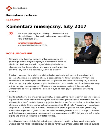 Komentarze rynkowe 15.02.2017 Komentarz miesięczny, luty 2017 Pierwsze pięć tygodni nowego roku okazało się dla polskiego rynku akcji najlepszym początkiem roku od pięciu lat... Jarosław Niedzielewski DYREKTOR DEPARTAMENTU INWESTYCJI PODSUMOWANIE • Pierwsze pięć tygodni nowego roku okazało się dla polskiego rynku akcji najlepszym początkiem roku od pięciu lat. Jeśli dodamy do tego świetną końcówkę ubiegłego roku, to podobnej siły połączonych efektów grudnia i stycznia nie odnotowywano od dekady. • Trzeba przyznać, że w obliczu wielomiesięcznej słabości naszych największych spółek, stawianie na polskie akcje, a szczególnie na firmy z indeksu WIG20, nie mieściło się w rynkowym konsensusie. Większość zachodnich strategów, a wraz z nimi zarządzających zagranicznymi funduszami, traktowała nasz kraj jako najgorszy wśród rynków wschodzących. Dlatego przez znaczną część minionego roku warszawski parkiet pozostawał daleko w tyle za rosnącymi giełdami emerging markets. • Bardziej łaskawa dla krajowego parkietu, a szczególnie największych spółek okazała się końcówka roku. Dziwnym zbiegiem okoliczności, pierwsza fala wzrostów WIG20 zbiegła się z dość zaskakującą decyzją banku Goldman Sachs, który umieścił polskie akcje na krótkiej liście czołowych rekomendacji na 2017 rok. Prawdziwym impulsem do powrotu na GPW zagranicznych inwestorów stał się jednak dopiero grudniowy wystrzał europejskich giełd po zakończeniu włoskiego referendum i niespodziewane podniesienie perspektywy naszego ratingu przez agencję S&P (tej samej, która dała się na we znaki w styczniu ubiegłego roku). • Oczekiwanie dalszej słabości polskiego rynku akcji na tle rynków wschodzących wydaje się nie mieć już podstaw. W końcu nawet Goldman Sachs dał zielone światło do powrotu naszego rynku na światowe salony. Ryzyka dla krajowego parkietu zostały już zidentyfikowane i w dużej mierze uwzględnione w cenach spółek, szczególnie tych większych. Natomiast potencjał gospodarczy, związany z siłą konsumpcji oraz kolejną (i ostatnią tak hojną) perspektywą wydatków unijnych, pozwala na optymistyczne spojrzenie na fundamenty polskich spółek w 2017 roku. • Ważnym wsparciem dla krajowej gospodarki i tym samym dla rynku akcji w dalszym ciągu będzie konsument i jego siła zakupowa wynikająca z niskiego bezrobocia oraz coraz bardziej widocznej presji na wzrost wynagrodzeń. • Co istotne, w reakcji na 15-proc. wzrost głównych indeksów GPW, w ciągu zaledwie dwóch miesięcy przebudzili się indywidualni inwestorzy kupując w styczniu jednostki funduszy akcyjnych po raz pierwszy od dwóch lat. Jeśli tegoroczny powrót inwestorów na rynek akcji miałby przypominać poprzednie tego typu zrywy, to fala napływów ma szansę potrwać co najmniej kilka miesięcy. • W takich warunkach mniejsze spółki (sWIG80) mają szansę wygrać tegoroczny wyścig, zarówno z dużymi, jak i średnimi firmami. Bez takiego wsparcia o pierwsze miejsce na podium będzie trudno. Trzeba też pamiętać, że tegoroczne maksima na najważniejszych giełdach zagranicznych mogą zostać osiągnięte wcześniej niż pod koniec roku. Dlatego spieszmy się korzystać z hossy na rynku akcji dopóki sprzyja jej gospodarczy klimat. Interesują Cię analizy i prognozy rynku kapitałowego? Zapraszamy do zapoznania się z opiniami i prognozami rynkowymi Dyrektora Departamentu Inwestycji w Investors TFI w formie comiesięcznych przekrojowych raportów oraz bieżących komentarzy. Publikacje Dyrektora Departamentu Inwestycji ukazują się także regularnie w mediach ekonomicznych, m.in. w Gazecie Giełdy Parkiet. Komentarze Dyrektora Departamentu Inwestycji