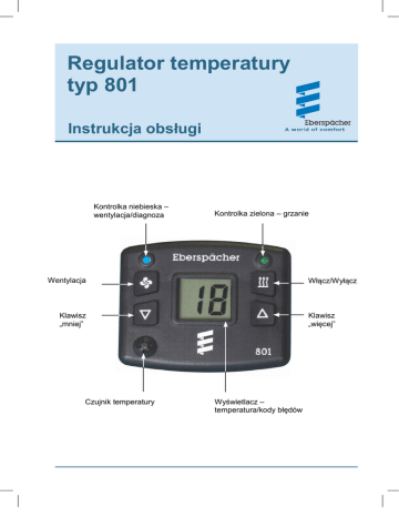 Regulator temperatury typ 801 Instrukcja obsługi Kontrolka niebieska – wentylacja/diagnoza Kontrolka zielona – grzanie Wentylacja Włącz/Wyłącz Klawisz „mniej” Czujnik temperatury Klawisz „więcej” Wyświetlacz – temperatura/kody błędów Numer katalogowy: 801 10 001 Regulator z ograniczonym czasem pracy (do jednej godziny) Numer katalogowy: 801 10 003 Regulator standardowy Wprowadzenie Regulator typu 801 pozwala na ręczną i cyfrową regulację temperatury w ogrzewaniach typu Airtronic. Włączanie grzania (ręczne) Nacisnąć klawisz Na wyświetlaczu zostanie wyświetlony komunikat „ON”. Ogrzewanie uruchomi się w trybie grzania. commence its start up cycle. Ponadto zapali się zielona kontrolka, a wyświetlacz przełączy się na wyświetlanie temperatury otoczenia (mierzonej wewnętrznym czujnikiem regulatora). Uwaga: wersja 801 10 001 działa tylko przez jedną godzinę. O O Temperatura otoczenia jest wyświetlana w zakresie od -9 C do +59 C. Wyłączanie grzania (ręczne). Ogrzewanie może zostać w dowolnej chwili wyłączone poprzez naciśnięcie klawisza Czas studzenia ogrzewania wynosi trzy minuty. Przed odłączeniem akumulatorów należy odczekać aż wentylator ogrzewania zatrzyma się. Regulacja temperatury. Naciskając klawisze i zmieniamy żądaną temperaturę, która jest pokazywana na wyświetlaczu. Wartość nastawionej temperatury może być zmieniona w dowolnej chwili i będzie pamiętana przez regulator także po wyłączeniu. Jeżeli nie naciskamy żadnego z klawiszy do wskazania temperatury otoczenia. lub wyświetlacz wraca O O Temperaturę wnętrza można nastawić w zakresie od 5 C do 32 C. Odczyt kodów błędów. Włączyć ogrzewanie, ponownie nacisnąć przycisk i trzymać go wciśniętego aż na wyświetlaczu pojawi się komunikat „dA”. Niebieska kontrolka powinna rozbłysnąć. Zwolnić przycisk. Na wyświetlaczu pojawi się kod aktualnego błędu. Przyciskając klawisz „więcej” można przeglądać pamięć ostatnich pięciu błędów. Typowe kody błędów. 10 11 12 52 = = = = zbyt wysokie napięcie zasilania za niskie napięcie zasilania przegrzanie urządzenia grzewczego brak zapłonu paliwa W przypadku pojawienia się innych kodów błędów należy skontaktować się z autoryzowanym serwisem Eberspächer. Jednoczesne naciśnięcie klawiszy i powoduje skasowanie pamięci błędów. Potwierdzeniem jest komunikat „EE”. Aby wyjść z trybu diagnozy nacisnąć klawisz . Jeżeli zapamiętane błędy nie mogą zostać skasowane należy skontaktować się z autoryzowanym serwisem Eberspächer. Wentylacja. Aby uruchomić funkcję wentylacji nacisnąć klawisz . Niebieska kontrolka zaświeci się, a wyświetlacz będzie pokazywać obracające się znaki. Uwaga: wersja 801 10 001 działa tylko przez jedną godzinę. Aby wyłączyć wentylację należy nacisnąć ponownie klawisz . Niebieska kontrolka zgaśnie, a wyświetlacz powróci do wyświetlania temperatury otoczenia. Dane techniczne Wymiary (mm) 65(szer.) x 55(wys.) x 17(grub.) Waga 60 g Zakres nastawianej temp. 5°C do 32°C Maksymalny prąd wyjścia 1 A Napięcie zasilania 12 / 24 V DC Zakres temperatur pracy -30°C do +85°C Złącze elektryczne Wiązka o długości 250mm ze stykami AMP Junior. Zestaw części do wykonania złącza. Producent: Eberspächer (UK) Ltd. Dystrybutor: Eberspaecher Sp. z o.o., Wysogotowo, ul. Okrężna 17 62-081 Przeźmierowo www.eberspaecher.pl