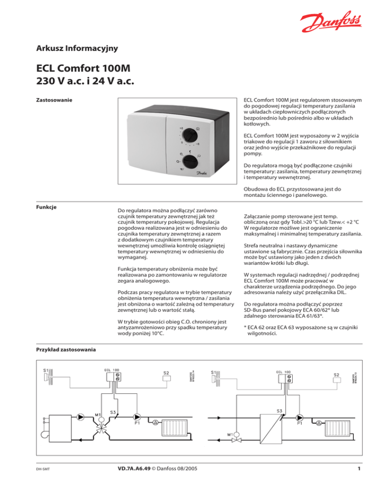 Arkusz Informacyjny ECL Comfort 100M 230 V a.c. i 24 V a.c. Zastosowanie ECL Comfort 100M jest regulatorem stosowanym do pogodowej regulacji temperatury zasilania w układach ciepłowniczych podłączonych bezpośrednio lub pośrednio albo w układach kotłowych. ECL Comfort 100M jest wyposażony w 2 wyjścia triakowe do regulacji 1 zaworu z siłownikiem oraz jedno wyjście przekaźnikowe do regulacji pompy. Do regulatora mogą być podłączone czujniki temperatury: zasilania, temperatury zewnętrznej i temperatury wewnętrznej. Obudowa do ECL przystosowana jest do montażu ściennego i panelowego. Funkcje Do regulatora można podłączyć zarówno czujnik temperatury zewnętrznej jak też czujnik temperatury pokojowej. Regulacja pogodowa realizowana jest w odniesieniu do czujnika temperatury zewnętrznej a razem z dodatkowym czujnikiem temperatury wewnętrznej umożliwia kontrolę osiągniętej temperatury wewnętrznej w odniesieniu do wymaganej. Funkcja temperatury obniżenia może być realizowana po zamontowaniu w regulatorze zegara analogowego. Podczas pracy regulatora w trybie temperatury obniżenia temperatura wewnętrzna / zasilania jest obniżona o wartość zależną od temperatury zewnętrznej lub o wartość stałą. W trybie gotowości obieg C.O. chroniony jest antyzamrożeniowo przy spadku temperatury wody poniżej 10°C. Załączanie pomp sterowane jest temp. obliczoną oraz gdy Tobl.>20 °C lub Tzew.< +2 °C W regulatorze możliwe jest ograniczenie maksymalnej i minimalnej temperatury zasilania. Strefa neutralna i nastawy dynamiczne ustawione są fabrycznie. Czas przejścia siłownika może być ustawiony jako jeden z dwóch wariantów krótki lub długi. W systemach regulacji nadrzędnej / podrzędnej ECL Comfort 100M może pracować w charakterze urządzenia podrzędnego. Do jego adresowania należy użyć przełącznika DIL. Do regulatora można podłączyć poprzez SD-Bus panel pokojowy ECA 60/62* lub zdalnego sterowania ECA 61/63*. * ECA 62 oraz ECA 63 wyposażone są w czujniki wilgotności. Przykład zastosowania DH-SMT VD.7A.A6.49 © Danfoss 08/2005 1 Arkusz Informacyjny ECL Comfort 100M Sposób zamawiania Regulator i obudowa Typ ECL Comfort 100M ECL Comfort 100M Obudowa - ECL 100 Zestaw panelowy Zestaw DIN Przeznaczenie Regulator - 230 V a.c. Regulator - 24 V a.c. Do montażu ściennego Do montażu panelowego (w otworze, w płycie frontowej) Do montażu obudowy ściennej 087B1154 na szynie DIN Nr katalogowy 087B1110 087B1114 087B1154 087B1148 087B1145 Przeznaczenie Czujnik temp. pokojowy Pt 1000 Czujnik temp. powierzchniowy Pt 1000 Czujnik temp. zewnętrznej Pt 1000 Czujnik temp. uniwersalny Ø 6mm Pt 1000 Czujnik temp. powierzchniowy Pt 1000 Czujnik temp. zanurzeniowy Pt 1000, miedziany Czujnik temp. zanurzeniowy Pt 1000, miedziany Czujnik temp. zanurzeniowy Pt 1000, stal nierdzewna Czujnik temp. zanurzeniowy Pt 1000, stal nierdzewna Nr katalogowy 087B1164 087B1165 084N1012 087B1184 087N0011 087B1180 087B1181 087B1182 087B1183 Przeznaczenie Zegar analogowy do ECL Comfort 100 Panel pokojowy z czujnikiem temperatury Panel do zdalnego sterowania z zegarem 1 kanałowym i czujnikiem temperatury Panel pokojowy z czujnikami temperatury i wilgotności Moduł zdalnego sterowania z czujnikami temperatury i wilgotności Nr katalogowy 087B1147 087B1140 Czujniki temperatury Typ ESM-10 ESM-11 ESMT ESMB-12 ESMC ESMU-100 ESMU-250 ESMU-100 ESMU-250 Akcesoria Typ ECA 100 ECA 60 ECA 61 ECA 62 ECA 63 087B1141 087B1169 087B1143 Obsługa Bateria Pierścień do ustawiania okresów pracy w trybie komfortu i obniżenia Nastawa temperatury komfortu Wybór trybu pracy regulatora Wybór krzywej grzania (H) Nastawa temperatury obniżonej 2 VD.7A.A6.49 © Danfoss 08/2005 DH-SMT Arkusz Informacyjny ECL Comfort 100M Podłączenia elektryczne - 230 V a.c. Zasilanie Zakres napięcia Zużycie energii Obciążalność wyjść przekaźnikowych Obciążalność wyjść triakowych 230 V a.c. - 50 Hz 207 do 244 V a.c. (IEC 60038) 5 VA 4(2) A - 230 V a.c. 0.2 A - 230 V a.c. Zasilanie Zakres napięcia Zużycie energii Obciążalność wyjść przekaźnikowych Obciążalność wyjść triakowych 24 V a.c. - 50 Hz 21.6 do 26.4 V a.c. (IEC 60038) 5 VA 4(2) A - 24 V a.c. 1 A - 24 V a.c. Temperatura otoczenia Temperatura przechowywania Obudowa Typ czujnika Stopień ochrony obudowy 0 - 50 °C -40 - +70 °C Montaż ścienny lub panelowy Pt 1000 (1000 ohm / 0 °C) IP 41 - DIN 40050 Wytyczne EMC 89/336/EEC, 92/31/EEC, 93/68/EEC, EN 50081-1 i EN 50082-1 Wytyczne Niskich Napięć 73/23/EEC i 93/68/EEC Podłączenia elektryczne - 24 V a.c. Dane podstawowe - znak zgodności z normami Nastawy Krzywa grzewcza (H) Przesunięcie równoległe Letnie wyłączenie ogrzewania Temperatura obniżenia Ochrona antyzamrożeniowa Ograniczenie max. temp. zasilenia Ograniczenie min. temp. zasilenia Strefa neutralna Pasmo proporcjonalności Stała całkowania Czas przejścia napędu/zaworu Zakres 0.2 do 2.2 +/-8 x H Off, 18 °C 0 do 14 K lub Auto Stała 45, 90 °C 10, 25 °C Stała Stałe Stała 20 lub 120 sec Nastawa fabryczna 1.2 0 18 °C Auto 10 °C *) 90 °C 10 °C 3 K *) 80 K *) 60 sec *) 120 sec *) Nastawy fabryczne, które nie mogą być zmieniane przez użytkownika DH-SMT VD.7A.A6.49 © Danfoss 08/2005 3 Arkusz Informacyjny ECL Comfort 100M Wymiary Montaż panelowy Montaż samego regulatora przy użyciu zestawu panelowego, nr katalogowy 087B1148: Montaż obudowy ECL Comfort 100, nr katalogowy 087B1154: Grubość płyty panela A nie może przekraczać 3 mm. Grubość płyty B nie może przekraczać 1 mm. Danfoss nie ponosi odpowiedzialności za możliwe błędy drukarskie w katalogach, broszurach i innych materiałach drukowanych. Dane techniczne zawarte w broszurze mogą ulec zmianie bez wcześniejszego uprzedzenia, jako efekt stałych ulepszeń i modyfikacji naszych urządzeń. Wszystkie znaki towarowe w tym materiale są własnością odpowiednich spółek. Nazwa Danfoss, logotyp Danfoss są znakami towarowymi Danfoss A/S