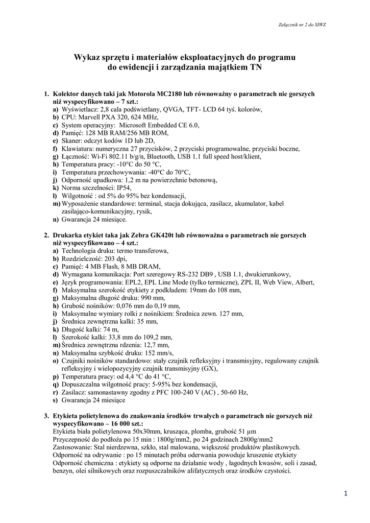 Załącznik nr 2 do SIWZ Wykaz sprzętu i materiałów eksploatacyjnych do programu do ewidencji i zarządzania majątkiem TN 1. Kolektor danych taki jak Motorola MC2180 lub równoważny o parametrach nie gorszych niż wyspecyfikowano – 7 szt.: a) Wyświetlacz: 2,8 cala podświetlany, QVGA, TFT- LCD 64 tyś. kolorów, b) CPU: Marvell PXA 320, 624 MHz, c) System operacyjny: Microsoft Embedded CE 6.0, d) Pamięć: 128 MB RAM/256 MB ROM, e) Skaner: odczyt kodów 1D lub 2D, f) Klawiatura: numeryczna 27 przycisków, 2 przyciski programowalne, przyciski boczne, g) Łączność: Wi-Fi 802.11 b/g/n, Bluetooth, USB 1.1 full speed host/klient, h) Temperatura pracy: -10°C do 50 °C, i) Temperatura przechowywania: -40°C do 70°C, j) Odporność upadkowa: 1,2 m na powierzchnie betonową, k) Norma szczelności: IP54, l) Wilgotność : od 5% do 95% bez kondensacji, m) Wyposażenie standardowe: terminal, stacja dokująca, zasilacz, akumulator, kabel zasilająco-komunikacyjny, rysik, n) Gwarancja 24 miesiące. 2. Drukarka etykiet taka jak Zebra GK420t lub równoważna o parametrach nie gorszych niż wyspecyfikowano – 4 szt.: a) Technologia druku: termo transferowa, b) Rozdzielczość: 203 dpi, c) Pamięć: 4 MB Flash, 8 MB DRAM, d) Wymagana komunikacja: Port szeregowy RS-232 DB9 , USB 1.1, dwukierunkowy, e) Język programowania: EPL2, EPL Line Mode (tylko termiczne), ZPL II, Web View, Albert, f) Maksymalna szerokość etykiety z podkładem: 19mm do 108 mm, g) Maksymalna długość druku: 990 mm, h) Grubość nośników: 0,076 mm do 0,19 mm, i) Maksymalne wymiary rolki z nośnikiem: Średnica zewn. 127 mm, j) Średnica zewnętrzna kalki: 35 mm, k) Długość kalki: 74 m, l) Szerokość kalki: 33,8 mm do 109,2 mm, m) Średnica zewnętrzna rdzenia: 12,7 mm, n) Maksymalna szybkość druku: 152 mm/s, o) Czujniki nośników standardowo: stały czujnik refleksyjny i transmisyjny, regulowany czujnik refleksyjny i wielopozycyjny czujnik transmisyjny (GX), p) Temperatura pracy: od 4,4 °C do 41 °C, q) Dopuszczalna wilgotność pracy: 5-95% bez kondensacji, r) Zasilacz: samonastawny zgodny z PFC 100-240 V (AC) , 50-60 Hz, s) Gwarancja 24 miesiące 3. Etykieta polietylenowa do znakowania środków trwałych o parametrach nie gorszych niż wyspecyfikowano – 16 000 szt.: Etykieta biała polietylenowa 50x30mm, krusząca, plomba, grubość 51 µm Przyczepność do podłoża po 15 min : 1800g/mm2, po 24 godzinach 2800g/mm2 Zastosowanie: Stal nierdzewna, szkło, stal malowana, większość produktów plastikowych. Odporność na odrywanie : po 15 minutach próba oderwania powoduje kruszenie etykiety Odporność chemiczna : etykiety są odporne na działanie wody , łagodnych kwasów, soli i zasad, benzyn, olei silnikowych oraz rozpuszczalników alifatycznych oraz środków czystości. 1 Załącznik nr 2 do SIWZ Minimalna temperatura aplikacji to +10 °C Zakres temperatur od – 40 °C do +80 °C Klej akrylowy o grubości 23 µm, przejrzysty permanentny , na bazie wody Zastosowanie: przeznaczony do syntetycznych materiałów wierzchnich, bardzo dobra klarowność, odporność na UV i bardzo dobra odporność na wodę po naklejeniu etykiety. Dobre własności adhezyjne i odporność na wysokie temperatury Minimalna przyczepność ( tack) 9 N FTM9 Minimalna Kohezja 10.0 h. FTM8 Minimalna przyklejalność 5 N modified FTM 9 Minimalna temperatura po etykietowaniu 5 °C Maksymalna temperatura po etykietowaniu 100 C Certyfikat: zgodny z dyrektywą EC 85/572/EEC Etykieta dedykowana do drukarki etykiet specyfikowanej w pkt 2 powyżej. 4. Kalka do etykiet specyfikowanych w pkt 3 powyżej o parametrach nie gorszych niż wyspecyfikowano - do zadrukowania 16 000 sztuk etykiet. Typ kalki – resin (żywicowa) Grubość wstążki 8,8 µm Podstawa Materiału poliester Grubość warstwy bazowej : 4,5 µm Kolor – czarny Energia 17mJ/mm2 Odporność na zarysowania: w teście tarcie wytrzymać ponad 4000 cykli na 200g/cm2 Warunki użytkowania : 5 °C do 35 °C, od 10 % do 80 % wilgotność Warunki przechowywania : 0 °C do 40 °C , od 10 % do 90 % wilgotności Kalka do etykiet dedykowana do drukarki etykiet specyfikowanej w pkt 2 powyżej. 2
