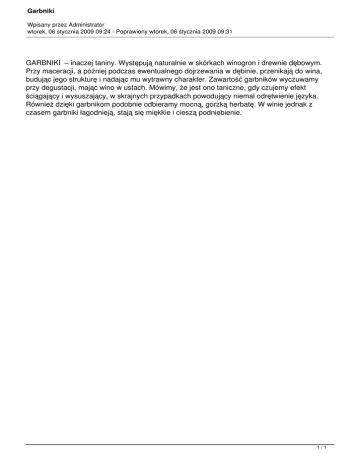 Garbniki Wpisany przez Administrator wtorek, 06 stycznia 2009 09:24 - Poprawiony wtorek, 06 stycznia 2009 09:31 GARBNIKI – inaczej taniny. Występują naturalnie w skórkach winogron i drewnie dębowym. Przy maceracji, a później podczas ewentualnego dojrzewania w dębinie, przenikają do wina, budując jego strukturę i nadając mu wytrawny charakter. Zawartość garbników wyczuwamy przy degustacji, mając wino w ustach. Mówimy, że jest ono taniczne, gdy czujemy efekt ściągający i wysuszający, w skrajnych przypadkach powodujący niemal odrętwienie języka. Również dzięki garbnikom podobnie odbieramy mocną, gorzką herbatę. W winie jednak z czasem garbniki łagodnieją, stają się miękkie i cieszą podniebienie. 1/1