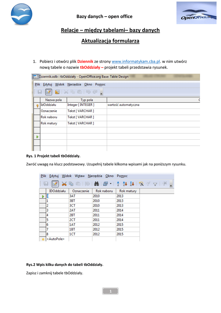 Bazy danych – open office Relacje – między tabelami– bazy danych Aktualizacja formularza 1. Pobierz i otwórz plik Dziennik ze strony www.informatykam.cba.pl. w nim utwórz nową tabele o nazwie tbOddziały – projekt tabeli przedstawia rysunek. Rys. 1 Projekt tabeli tbOddziały. Zwróć uwagę na klucz podstawowy. Uzupełnij tabele kilkoma wpisami jak na poniższym rysunku. Rys.2 Wpis kilku danych do tabeli tbOddziały. Zapisz i zamknij tabele tbOddziały. 1 Bazy danych – open office 2. Zabieramy się teraz za edycje tabeli tbUczniowie – wprowadzamy do tej tabeli nowe pole o nazwie KlasaID – o typie danych integer. Ponieważ, tabele tbOddziały i tbUczniowie będziemy łączyć ze sobą za pomocą relacji po przez pola IdOddziału i KlasaID. Rys. 3 Przedstawia jak należy wejść w edycje tabeli tbUczniowie. Rys. 4 Dodane pole do tabeli tbUczniowie. 2 Bazy danych – open office 3. Z menu wybierz Narzędzia – relacje. Rys. 5. Dodajemy tabele pomiędzy, którymi chcemy utworzyć relacje. 4. Wskaż po kolei każdą z tabel i następnie kliknij dodaj, a następnie zamknij. Z menu górnego wybierz wstaw relacje i ustaw parametry Złączone tabele i Złączone pola, jak na rysunku. Rys. 6 Tabele i okienko relacji. Kliknij ok i tworzy się powiązanie pomiędzy tabelami pokazanymi na rysunku. 3 Bazy danych – open office Rys. 7 Połączone tabele relacją. 5. Zapisz projekt relacji i zamknij okno. Aktualizujemy formularz fmuczniowie. Otwieramy o w trybie edycji. Rys. 8 Edycja formularza wstawienie dodatkowego pola listy. 6. Po wybraniu pola listy z bocznego lewego panelu musimy jeszcze określić z jakiej tabeli będziemy pobierali zawartość listy. Kolejne rzuty ekranowe obrazują jak należy postępować aby dodać pole listy. Postępuj zgodnie z rysunkami. Po wybraniu pola listy narysuj wielkość tego pola na formularzu. 4 Bazy danych – open office 5 Bazy danych – open office Rys. 9 Ostateczny wygląd naszego formularza. 7. Zapisz zmiany w formularzu i otwórz go ponownie. Jak myślisz jakie dane przechowywane są w tabeli tbuczniowie w kolumnie klasaID? W formularzu fmuczniowie przeglądając kolejne rekordy przydzielaj kolejnym uczniom klasy wybierając klasy z listy. Wybranie klasy (podświetlona na niebiesko) skutkuje przypisanie jej danemu uczniowi. Wnioski i odpowiedzi: 6