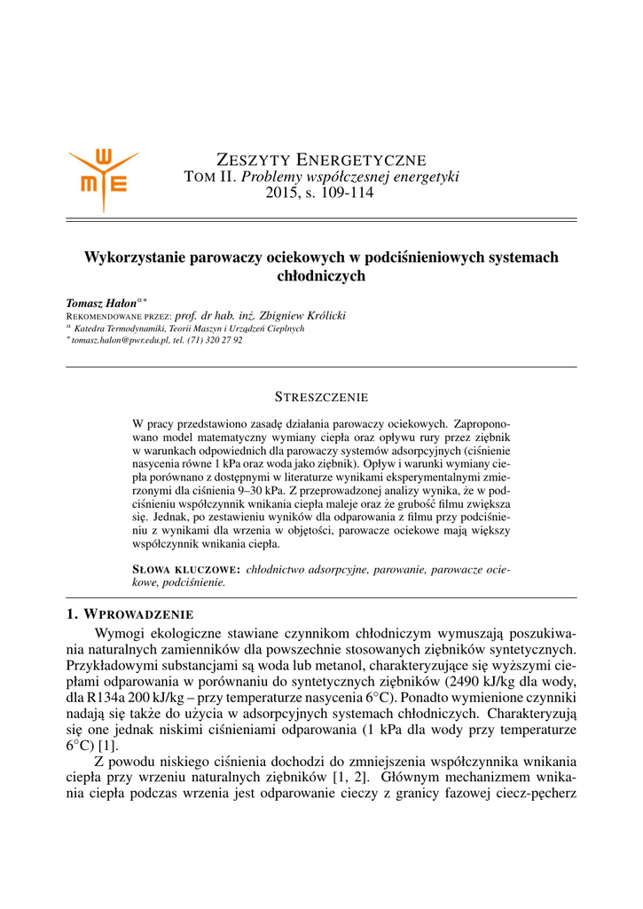 Z ESZYTY E NERGETYCZNE T OM II. Problemy współczesnej energetyki 2015, s. 109-114 Wykorzystanie parowaczy ociekowych w podciśnieniowych systemach chłodniczych Tomasz Hałona∗ R EKOMENDOWANE PRZEZ : prof. dr hab. inż. Zbigniew Królicki Katedra Termodynamiki, Teorii Maszyn i Urzadzeń ˛ Cieplnych ∗ [email protected], tel. (71) 320 27 92 a S TRESZCZENIE W pracy przedstawiono zasad˛e działania parowaczy ociekowych. Zaproponowano model matematyczny wymiany ciepła oraz opływu rury przez zi˛ebnik w warunkach odpowiednich dla parowaczy systemów adsorpcyjnych (ciśnienie nasycenia równe 1 kPa oraz woda jako zi˛ebnik). Opływ i warunki wymiany ciepła porównano z dost˛epnymi w literaturze wynikami eksperymentalnymi zmierzonymi dla ciśnienia 9–30 kPa. Z przeprowadzonej analizy wynika, że w podciśnieniu współczynnik wnikania ciepła maleje oraz że grubość filmu zwi˛eksza si˛e. Jednak, po zestawieniu wyników dla odparowania z filmu przy podciśnieniu z wynikami dla wrzenia w obj˛etości, parowacze ociekowe maja˛ wi˛ekszy współczynnik wnikania ciepła. S ŁOWA KLUCZOWE : chłodnictwo adsorpcyjne, parowanie, parowacze ociekowe, podciśnienie. 1. W PROWADZENIE Wymogi ekologiczne stawiane czynnikom chłodniczym wymuszaja˛ poszukiwania naturalnych zamienników dla powszechnie stosowanych zi˛ebników syntetycznych. Przykładowymi substancjami sa˛ woda lub metanol, charakteryzujace ˛ si˛e wyższymi ciepłami odparowania w porównaniu do syntetycznych zi˛ebników (2490 kJ/kg dla wody, dla R134a 200 kJ/kg – przy temperaturze nasycenia 6◦ C). Ponadto wymienione czynniki nadaja˛ si˛e także do użycia w adsorpcyjnych systemach chłodniczych. Charakteryzuja˛ si˛e one jednak niskimi ciśnieniami odparowania (1 kPa dla wody przy temperaturze 6◦ C) [1]. Z powodu niskiego ciśnienia dochodzi do zmniejszenia współczynnika wnikania ciepła przy wrzeniu naturalnych zi˛ebników [1, 2]. Głównym mechanizmem wnikania ciepła podczas wrzenia jest odparowanie cieczy z granicy fazowej ciecz-p˛echerz 110 Tomasz Hałon parowy. Współczynnik wnikania ciepła jest wprost proporcjonalny do ilości odrywajacych ˛ si˛e p˛echerzy parowych. Średnica zarodka nuklecji jest zależna od rodzaju powierzchni oraz właściwości czynnika: obj˛etości właściwej pary i napi˛ecia powierzchniowego. Przy niskim ciśnieniu, gdy napi˛ecie powierzchniowe i obj˛etość właściwa sa˛ wi˛eksze niż przy ciśnieniu atmosferycznym, możliwe do aktywacji zarodki nukleacji posiadaja˛ o rzad ˛ wielkości wi˛eksze średnice minimalne [1]. Skutkuje to mniejsza˛ ilościa˛ powstajacych ˛ p˛echerzy, a zatem mniejszym współczynnikiem wnikania ciepła α i wi˛ekszym oporem cieplnym. Rys. 1: Schemat ideowy: a) parowacza ociekowego, b) opływu rurki W parowaczach ociekowych nie dochodzi do wrzenia rozwini˛etego – efekt chłodniczy uzyskiwany jest przez odparowanie czynnika z granicy fazowej mi˛edzy ciecza,˛ a gazem [3, 4, 5]. Grubość warstwy zi˛ebnika jest mniejsza niż 1 mm, dlatego można przyjać, ˛ że ciepło przenoszone jest głównie poprzez przewodzenie w warstwie przyściennej [6]. Współczynnik wnikania ciepła dla kondukcji zależy od grubości filmu δ . Z powodu wyst˛epowania opisanych wcześniej wi˛ekszych p˛echerzy, przy podciśnieniach opór cieplny obj˛etości wrzacego ˛ zi˛ebnika jest wi˛ekszy niż dla parujacego ˛ filmu [3, 7]. Budowa ociekowego wymiennika ciepła w wersji horyzontalnej przedstawiona jest na rys. 1. Zi˛ebnik spływa na p˛ek rur złożony z rz˛edów oraz kolumn. Zi˛ebnik dostarczany jest przez system rozprowadzania znajdujacy ˛ si˛e powyżej p˛eczka rur. Nast˛epnie, opływajac ˛ rur˛e, tworzy na jej powierzchni warstw˛e cieczy (rys. 1). Medium płynace ˛ wewnatrz ˛ rur ma temperatur˛e wyższa˛ od temperatury nasycenia zi˛ebnika. Ciepło przekazane od medium do zi˛ebnika powoduje odparowanie jednostkowej cz˛eści masy dm. Reszta nieodparowanego zi˛ebnika spływa na rury poniżej, gdzie kontynuowany jest proces odparowania. Zi˛ebnik nieodparowany na ostatnim rz˛edzie rur jest zawracany do systemu rozprowadzania. 1.1. Przeglad ˛ badań dotyczacych ˛ opływu rury i przenoszenia ciepła Grubość filmu zi˛ebnika w zależności od strumienia masy, średnicy rury, odległości mi˛edzy rurami w kolumnie oraz położenia katowego ˛ na rurze (oznaczonego jako β na rys. 1) została przebadana przez Hou i innych [10]. Wykazali, że grubość ta zależy nie tylko od strumienia masy, ale i od pr˛edkości przepływu czynnika i średnicy opływanej rury. Minimalna grubość filmu obserwowana jest w przedziale katowym ˛ β 90◦ –115◦ , ◦ a nie jak dotychczas uważano – 90 . Zaproponowane poprawki do korelacji Nusselta na grubość filmu pozwoliły przeprowadzić obliczenia w zależności od średnicy rurki i odległości mi˛edzy rz˛edami (wpływ na pr˛edkość przepływu czynnika). Dla przepływu, w którym nie dochodzi do wrzenia, zaobserwowano wyższy współczynnik wnikania ciepła α dla mniejszych średnic rury [8, 9]. Jak zauważył Hou [10], im wi˛eksza średnica, tym grubsza warstwa filmu, a wi˛ec także wi˛ekszy opór cieplny. Wykorzystanie parowaczy ociekowych w podciśnieniowych systemach chłodniczych 111 Odległość mi˛edzy rurami, według niektórych autorów, nie ma wpływu na wymian˛e ciepła [4, 6]. Jednak według innych badań, odległość ta może zwi˛ekszyć współczynnik wnikania ciepła 15% [11]. Yang i inni uzyskali najwi˛eksze współczynniki wnikania ciepła dla odległości mi˛edzy rurami równej 11 mm. Spowodowane jest to wzrostem pr˛edkości przepływu czynnika - ze wzrostem pr˛edkości wzrasta współczynnik wnikania ciepła. Przy odległościach mi˛edzy rurami wi˛ekszych niż 11 mm może dojść do odbijania strugi zi˛ebnika od rury znajdujacej ˛ si˛e poniżej [11]. Sposób rozprowadzania zi˛ebnika wpływa na jednorodność filmu opływajacego ˛ rur˛e. Najc