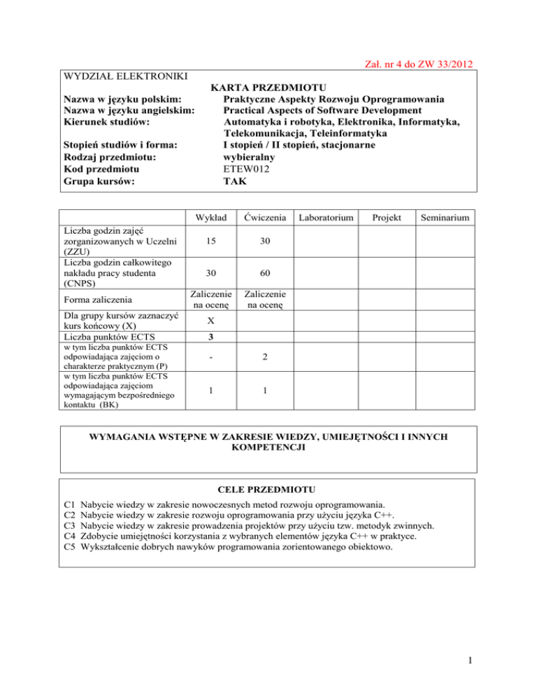 Zał. nr 4 do ZW 33/2012 WYDZIAŁ ELEKTRONIKI Nazwa w języku polskim: Nazwa w języku angielskim: Kierunek studiów: Stopień studiów i forma: Rodzaj przedmiotu: Kod przedmiotu Grupa kursów: Liczba godzin zajęć zorganizowanych w Uczelni (ZZU) Liczba godzin całkowitego nakładu pracy studenta (CNPS) Forma zaliczenia Dla grupy kursów zaznaczyć kurs końcowy (X) Liczba punktów ECTS w tym liczba punktów ECTS odpowiadająca zajęciom o charakterze praktycznym (P) w tym liczba punktów ECTS odpowiadająca zajęciom wymagającym bezpośredniego kontaktu (BK) KARTA PRZEDMIOTU Praktyczne Aspekty Rozwoju Oprogramowania Practical Aspects of Software Development Automatyka i robotyka, Elektronika, Informatyka, Telekomunikacja, Teleinformatyka I stopień / II stopień, stacjonarne wybieralny ETEW012 TAK Wykład Ćwiczenia 15 30 30 60 Zaliczenie na ocenę Zaliczenie na ocenę Laboratorium Projekt Seminarium X 3 - 2 1 1 WYMAGANIA WSTĘPNE W ZAKRESIE WIEDZY, UMIEJĘTNOŚCI I INNYCH KOMPETENCJI CELE PRZEDMIOTU C1 C2 C3 C4 C5 Nabycie wiedzy w zakresie nowoczesnych metod rozwoju oprogramowania. Nabycie wiedzy w zakresie rozwoju oprogramowania przy użyciu języka C++. Nabycie wiedzy w zakresie prowadzenia projektów przy użyciu tzw. metodyk zwinnych. Zdobycie umiejętności korzystania z wybranych elementów języka C++ w praktyce. Wykształcenie dobrych nawyków programowania zorientowanego obiektowo. 1 PRZEDMIOTOWE EFEKTY KSZTAŁCENIA Z zakresu wiedzy: PEK_W01 – zna założenia metodyki Agile i Scrum w odniesieniu do projektów programistycznych. PEK_W02 – zna wybrane wzorce projektowe stosowane w rozwoju oprogramowania. PEK_W03 – zna podstawowe metody pracy z istniejącym kodem spadkowym. Z zakresu umiejętności: PEK_U01 – potrafi posługiwać sie zintegrowanym środowiskiem do rozwoju oprogramowania. PEK_U02 – potrafi napisać testy jednostkowe przy użyciu wybranej platformy testowej. PEK_U03 – potrafi korzystać z wybranych elementów języka C++ w praktyce. Z zakresu kompetencji społecznych: PEK_K01 – ma świadomość potrzeby dzielenia się wiedzą w ramach zespołu projektowego. PEK_K02 – rozumie potrzebę dbania o jakość oprogramowania w kontekście pracy zespołowej. PEK_K03 – rozumie konieczność stałego dokształcania się w obliczu ciągłych zmian. TREŚCI PROGRAMOWE Wy1 Forma zajęć - wykład Jak realizować innowacyjne projekty na czas Liczba godz. 3 Wy2 Zwinna transformacja Waterfall’a do Scrum’a 3 Wy3 Strategie zapewniania jakości oprogramowania 3 Wy4 Zarządzanie ryzykiem w projektach informatycznych 3 Wy5 Budowanie złożonych systemów informatycznych Suma godzin 3 15 Forma zajęć - ćwiczenia Liczba godzin Cw1 Scrum and Waterfall Game 3 Cw2 Środowisko Programisty 3 Cw3 Szablony, Kontenery, Boost 3 Cw4 Test Driven Development na przykładzie C++ 3 Cw5 Refactoring na przykładzie C++ 3 Cw6 Zaawansowane C++ 3 Cw7 Wzorce projektowe na przykładzie C++ 3 Cw8 Programowanie współbieżne w C++ 3 Cw9 Coding Dojo w C++ 3 Cw10 Kolokwium Suma godzin 3 30 STOSOWANE NARZĘDZIA DYDAKTYCZNE N1. Wykład z użyciem środków multimedialnych N2. Ćwiczenia praktyczne z dyskusją możliwych rozwiązań N3. Studium przypadków na bazie podanych przykładów N4. Konsultacje bezpośrednio po wykładzie N5. Kolokwium 2 N6. Praca własna – samodzielne studia oraz przygotowanie do ćwiczeń N7. Praca własna – samodzielne studia oraz przygotowanie do kolokwium OCENA OSIĄGNIĘCIA PRZEDMIOTOWYCH EFEKTÓW KSZTAŁCENIA Oceny F – formująca (w trakcie semestru), P – podsumowująca (na koniec semestru) Numer efektu kształcenia PEK_W01 PEK_W02 PEK_W03 PEK_U01 PEK_U02 PEK_U03 F1 F2 Sposób oceny osiągnięcia efektu kształcenia aktywność na wykładach ocena z kolokwium (część teoretyczna) aktywność na ćwiczeniach ocena z kolokwium (część praktyczna) P = 0.33 * F1 + 0.67 * F2 LITERATURA PODSTAWOWA I UZUPEŁNIAJĄCA LITERATURA PODSTAWOWA: [1] Robert C. Martin – Czysty kod. Podręcznik dobrego programisty. [2] Scott Meyers – STL w praktyce. 50 sposobów efektywnego wykorzystania. [3] Martin Fowler, Kent Beck i inni - Refaktoryzacja. Ulepszanie struktury istniejącego kodu. [4] Zasoby sieci Internet w odniesieniu do przedstawianych tematów. LITERATURA UZUPEŁNIAJĄCA: [1] Andrew Hunt, David Thomas – Pragmatyczny programista. Od czeladnika do mistrza. [2] Elisabeth Freeman, Eric Freeman, Bert Bates, Kathy Sierra – Wzorce projektowe. Rusz głową! [3] Amr Elssamadisy – Agile. Wzorce wdrażania praktyk zwinnych. [4] Mariusz Chrapko – Scrum. O zwinnym zarządzaniu projektami. [5] Jon Bentley – Perełki programowania. OPIEKUN PRZEDMIOTU (IMIĘ, NAZWISKO, ADRES E-MAIL) Dr inż. Iwona Pozniak-Koszałka, [email protected] 3 MACIERZ POWIĄZANIA EFEKTÓW KSZTAŁCENIA DLA PRZEDMIOTU Praktyczne Aspekty Rozwoju Oprogramowania Z EFEKTAMI KSZTAŁCENIA NA KIERUNKU Elektronika, Informatyka, Telekomunikacja, Automatyka i robotyka, Teleinformatyka Przedmiotowy efekt kształcenia PEK_W01 PEK_W02 PEK_W03 PEK_U01 PEK_U02 PEK_U03 Odniesienie przedmiotowego efektu do Cele przedmiotu efektów kształcenia zdefiniowanych dla kierunku studiów i specjalności (o ile dotyczy) K1AIR_W09, K1EKA_W08, K1INF_W09, K1TEL_W08, K1TIN_W40 K1AIR_W12, K1EKA_W11, K1INF_W12, K1TEL_W11, K1TIN_W11, K1AIR_W13, K1EKA_W12, K1INF_W13, K1TEL_W12, K1TIN_W12 K1AIR_W09, K1EKA_W08, K1INF_W09, K1TEL_W08, K1TIN_W40 K1AIR_W12, K1EKA_W11, K1INF_W12, K1TEL_W11, K1TIN_W11, K1AIR_W13, K1EKA_W12, K1INF_W13, K1TEL_W12, K1TIN_W12 K1AIR_W09, K1EKA_W08, K1INF_W09, K1TEL_W08, K1TIN_W40 K1AIR_W12, K1EKA_W11, K1INF_W12, K1TEL_W11, K1TIN_W11, K1AIR_W13, K1EKA_W12, K1INF_W13, K1TEL_W12, K1TIN_W12 K1AIR_W09, K1EKA_W08, K1INF_W09, K1TEL_W08, K1TIN_W40 K1AIR_W12, K1EKA_W11, K1INF_W12, K1TEL_W11, K1TIN_W11, K1AIR_W13, K1EKA_W12, K1INF_W13, K1TEL_W12, K1TIN_W12 K1AIR_U09, K1EKA_U07, K1INF_U08, K1TEL_U07, K1TIN_U08, K1AIR_U12, K1EKA_U10, K1INF_U11, K1TEL_U10, K1TIN_U11, K1AIR_U13, K1EKA_U11, K1INF_U12, K1TEL_U11, K
