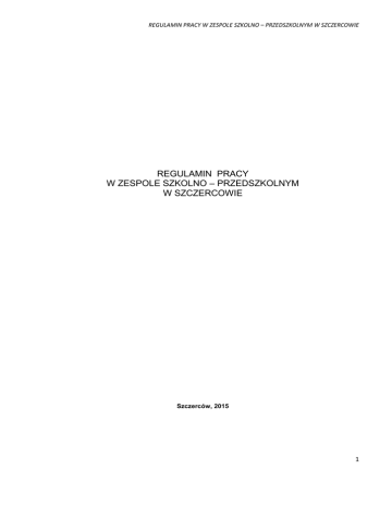 REGULAMIN PRACY W ZESPOLE SZKOLNO – PRZEDSZKOLNYM W SZCZERCOWIE REGULAMIN PRACY W ZESPOLE SZKOLNO – PRZEDSZKOLNYM W SZCZERCOWIE Szczerców, 2015 1 REGULAMIN PRACY W ZESPOLE SZKOLNO – PRZEDSZKOLNYM W SZCZERCOWIE REGULAMIN PRACY Opracowany na podstawie : ustawy z dn. 26 czerwca 1974 r. – Kodeks pracy (tekst jednolity z dn. 23.12.1997 r. Dz.U. z 1998 r. Nr 21, poz. 94 ze zmianami) Rozdział I Postanowienia ogólne § 1. 1. Regulamin ustala organizację i porządek w pracy oraz związane z tym prawa i obowiązki pracodawcy i pracowników. 2. Postanowienia regulaminu stosuje się do wszystkich pracowników, bez względu na rodzaj pracy i stanowisko. 3. W sprawach związanych ze stosunkiem pracy, nie uregulowanych szczegółowo niniejszym regulaminem, zastosowanie mają przepisy Kodeksu Pracy, Karty Nauczyciela oraz innych ustaw i aktów wykonawczych z zakresu prawa pracy. 4. Przed dopuszczeniem do pracy każdy pracownik będzie zapoznany z przepisami regulaminu. Podpisane oświadczenie o zapoznaniu się z jego treścią zostanie dołączone do akt osobowych. 5. Ilekroć w regulaminie jest mowa o: 1) zakładzie pracy lub Zespole, należy przez to rozumieć Zespół Szkolno-Przedszkolny w Szczercowie (ZS-P), 2) pracodawcy, należy przez to rozumieć dyrektora ZS-P w Szczercowie, 3) pracowniku, należy przez to rozumieć osobę zatrudnioną w ZS-P w Szczercowie. Rozdział II Obowiązki pracownika § 2. 1. Podstawowym obowiązkiem pracownika jest : 1) rzetelnie i efektywnie wykonywać pracę, 2) stosować się do poleceń przełożonych, które dotyczą pracy, jeżeli nie są one sprzeczne z przepisami prawa lub umową o pracę, 3) przestrzegać ustalonego czasu i miejsca pracy, 4) przestrzegać regulaminu pracy i ustalonego w zakładzie porządku oraz zarządzeń i poleceń przełożonych, 5) poddawać się wstępnym, okresowym i kontrolnym oraz innym zaleconym badaniom lekarskim i stosować się do wskazań lekarskich, 6) przestrzegać przepisów i zasad bezpieczeństwa i higieny pracy oraz przepisów przeciwpożarowych, 7) podnosić kwalifikacje zawodowe oraz doskonalić umiejętności pracy, 8) dbać o dobro zakładu pracy i jego mienie, w szczególności oszczędnie gospodarować powierzonymi środkami, materiałami i urządzeniami, 9) przestrzegać tajemnicy służbowej oraz ochrony danych osobowych, 10) przestrzegać w zakładzie zasad współżycia społecznego, w szczególności dbać o dobre imię zakładu pracy i współpracowników, nie rozsiewać plotek i pomówień, 11) dbać o czystość i porządek wokół swojego stanowiska pracy, 12) należycie zabezpieczyć po skończonej pracy, narzędzia, urządzenia i pomieszczenia pracy. § 3. 1.Naruszeniem podstawowych obowiązków pracowniczych jest: 1) złe lub niedbałe wykonywanie pracy, które mogłoby narazić pracodawcę na szkodę, 2 REGULAMIN PRACY W ZESPOLE SZKOLNO – PRZEDSZKOLNYM W SZCZERCOWIE 2) rażąca niedbałość o powierzone mienie, 3) wykonywanie prac niezwiązanych ze stosunkiem pracy, 4) nieusprawiedliwione nieprzybycie do pracy, spóźnianie się lub samowolne opuszczenie pracy bez usprawiedliwienia, 5) stawienie się do pracy w stanie nietrzeźwości lub spożywanie alkoholu w miejscu pracy, 6) naruszanie przepisów i zasad bhp oraz przepisów p.poż., 7) działania lub zachowania uznane w Kodeksie pracy za mobbing, 8) naruszenie tajemnicy państwowej, służbowej lub tajemnicy Zespołu i w zakresie ochrony danych osobowych lub niedbalstwo w ochronie tych tajemnic, 9) zakłócanie porządku i spokoju w miejscu pracy, 10)przebywanie w miejscach niedozwolonych dla osób nieupoważnionych, 11) niewłaściwe zachowanie wobec przełożonych, podwładnych, współpracowników i klientów Zespołu, 12)narażenie dobrego imienia Zespołu poprzez rozsiewanie plotek i pomówień na temat zakładu pracy, współpracowników oraz osoby kierujące zakładem pracy Rozdział III Czas pracy § 4. 1. Czas pracy powinien być w pełni wykorzystany przez pracownika na wykonanie obowiązków. 2. Czas pracy pracowników pedagogicznych szkoły określa ustawa z dnia 26 stycznia 1982 r. Karta Nauczyciela (Dz. U. z 2014 r. poz. 191) oraz uchwała nr X/101/11 Rady Gminy Szczerców z dnia 6 października 2011 r. 3. Czas pracy pracowników administracji i obsługi nie może przekraczać 8 godzin na dobę i przeciętnie 40 godzin na tydzień w jednomiesięcznym okresie rozliczeniowym. 4. Niedziele i święta określone odrębnymi przepisami są dniami wolnymi od pracy. 1) Za pracę w niedziele lub święta uważa się pracę wykonywaną pomiędzy godziną 6°° w tym dniu, a godziną 6°° następnego dnia, 2) Praca w niedziele i święta jest dozwolona przy wykonywaniu prac koniecznych ze względu na ich użyteczność społeczną i codzienne potrzeby ludności, w szczególności przy: a) prowadzeniu działalności w zakresie kultury, oświaty, turystyki itd., b) w razie awarii i szczególnych wypadków losowych. 5. Pracownikowi wykonującemu pracę w niedziele i święta pracodawca jest zobowiązany zapewnić inny dzień wolny od pracy: 1) w zamian za pracę w niedzielę – w okresie 6 dni kalendarzowych poprzedzających lub następujących po takiej niedzieli, 2) w zamian za pracę w święto – w ciągu okresu rozliczeniowego, 6. Jeżeli nie jest możliwe wykorzystanie dnia wolnego od pracy w zamian za pracę w niedzielę lub święto, pracownikowi przysługuje dodatek do wynagrodzenia w wysokości 100% wynagrodzenia za każdą godzinę pracy w niedzielę lub święto. 7. Czas pracy pracowników zatrudnionych w niepełnym wymiarze czasu pracy ustalają indywidualne umowy o pracę. § 5. 1. Ustala się następujące godziny rozpoczynania i kończenia pracy: 1) pracownicy dydaktyczni szkoły zgodnie z tygodniowym planem zajęć, 2) pracownicy administracji i obsługi w godzinach ustalonych wg harmonogramu: a) kuchnia w godz. 7:00–15:30, b) sprzątaczki w godzinach ustalonych harmonogramem w poszczególnych tygodniach lub miesią