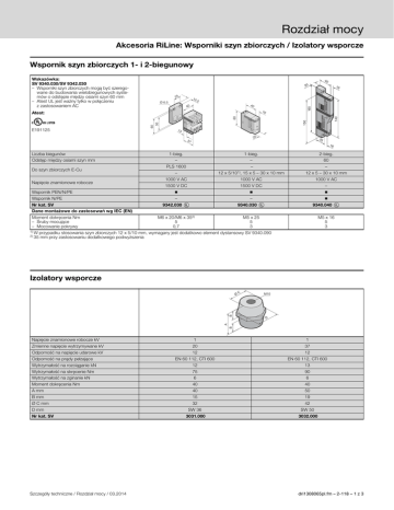 Rozdział mocy Akcesoria RiLine: Wsporniki szyn zbiorczych / Izolatory wsporcze Wspornik szyn zbiorczych 1- i 2-biegunowy Wskazówka: SV 9340.030/SV 9342.030 – Wsporniki szyn zbiorczych mogą być szeregowane do budowania wielobiegunowych systemów o odstępie między osiami szyn 60 mm – Atest UL jest ważny tylko w połączeniu z zastosowaniem AC 40 20 150 Atest: 140 165 16 E191125 25 16 Liczba biegunów Odstęp między osiami szyn mm Do szyn zbiorczych E-Cu Napięcie znamionowe robocze Wspornik PEN/N/PE Wspornik N/PE Nr kat. SV 1-bieg. 1-bieg. 2-bieg. – – 60 PLS 1600 – – – 12 x 5/101), 15 x 5 – 30 x 10 mm 12 x 5 – 30 x 10 mm 1000 V AC 1000 V AC 1000 V AC 1500 V DC 1500 V DC – ◾ ◾ ◾ – – 9342.030 ◾ 9340.030 9340.040 Dane montażowe do zastosowań wg IEC (EN) Moment dokręcenia Nm – Śruby mocujące – Mocowanie pokrywy 1) W 2) 35 M6 x 20/M6 x 352) 5 0,7 M5 x 25 5 3 M5 x 16 5 3 przypadku stosowania szyn zbiorczych 12 x 5/10 mm, wymagany jest dodatkowo element dystansowy SV 9340.090 mm przy zastosowaniu dodatkowego podwyższenia Izolatory wsporcze C M10 D B A B Ø Napięcie znamionowe robocze kV 1 1 Zmienne napięcie wytrzymywane kV 20 37 Odporność na napięcie udarowe kV 12 12 EN 60 112, CTI 600 EN 60 112, CTI 600 Wytrzymałość na rozciąganie kN 12 13 Wytrzymałość na skręcenie Nm 75 90 Wytrzymałość na zginanie kN 6 6 Moment dokręcenia Nm 40 40 A mm 40 50 B mm 15 19 Ø C mm 32 42 SW 36 SW 50 3031.000 3032.000 Odporność na prądy pełzające D mm Nr kat. SV Szczegóły techniczne / Rozdział mocy / 03.2014 dri1308065pl.fm – 2-118 – 1 z 3 Rozdział mocy Akcesoria RiLine: Szyny zbiorcze Profile zakrywające szyn zbiorczych Atest: 13 .6 20 B 20 E191125 20 .5 8.5 Do szyn zbiorczych mm 12/15 x 5 12/15 x 10 12 x 5 – 30 x 10 – – 40,6 70,6 9350.010 9350.060 3092.000 3085.000 Szerokość (B) mm Nr kat. SV 40 – 60 x 10 Łącznik szyn Atest: E191125 8– A 0– 10 15 0 11 2 13 40 40 M8 M8 M8 M8 A = maks. 10 mm Do szyn zbiorczych mm 12 x 5 – 15 x 10 20 x 5 – 30 x 10 20 x 5 – 30 x 10 Do zastosowania Łączenie zwykłe Łączenie zwykłe Łączenie szeregowe1) Nr kat. SV 9350.075 9320.020 9320.030 Dane montażowe do zastosowań wg IEC (EN)/UL Moment dokręcenia Nm – Śruba M8 – Trzpień gwintowany M8 Maks. przesunięcie szyn zbiorczych 1) Od 5 15 20 – 20 – – 4 5 szafy do szafy Łącznik szynowy PLS Atest: 50 E191125 0 15 8– 12 0 M8 1– 11 10 M8 Do zastosowania Do systemu Nr kat. SV Łączenie szeregowe1) Łączenie zwykłe PLS 800 3504.000 PLS 1600 3514.000 PLS 800 3505.000 PLS 1600 3515.000 Dane montażowe do zastosowań wg IEC (EN)/UL Moment dokręcenia Nm – Śruba M8 15 20 15 20 Maks. przesunięcie szyn zbiorczych 4 5 4 5 1) Od szafy do szafy dri1308065pl.fm – 2-118 – 2 z 3 Szczegóły techniczne / Rozdział mocy / 03.2014 Rozdział mocy Akcesoria RiLine: Szyny zbiorcze Łącznik kompensacyjny PLS Wskazówka: – Przy podwyższeniu temperatury o 30 °C, następuje rozciągnięcie szyn zbiorczych o ok. 0,5 mm/m. Zaleca się, przy systemach szyn zbiorczych o długości ponad > 3600 mm, stosowanie łącznika kompensacyjnego do termicznej kompensacji odcinków szyn 85 80 – 101 110 – 101 110 Atest: E191125 Do systemu Nr kat. SV PLS 800 9320.060 PLS 1600 9320.070 Dodatkowo wymagane są Łącznik szynowy PLS1) 1) 3504.000 3514.000 Do montażu łącznika kompensacyjnego potrzebne są każdorazowo dwa łączniki szynowe Szczegóły techniczne / Rozdział mocy / 03.2014 dri1308065pl.fm – 2-118 – 3 z 3