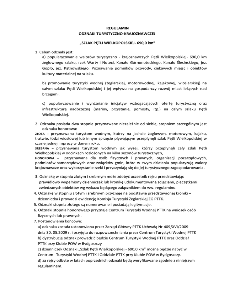REGULAMIN ODZNAKI TURYSTYCZNO-KRAJOZNAWCZEJ „SZLAK PĘTLI WIELKOPOLSKIEJ- 690,0 km” 1. Celem odznaki jest: a) popularyzowanie walorów turystyczno - krajoznawczych Pętli Wielkopolskiej- 690,0 km żeglownego szlaku, rzek Warty i Noteci, Kanału Górnonoteckiego, Kanału Ślesińskiego, jez. Gopło, jez. Pątnowskiego. Poznawanie pomników przyrody, ciekawych miejsc i obiektów kultury materialnej na szlaku. b) promowanie turystyki wodnej (żeglarskiej, motorowodnej, kajakowej, wioślarskiej) na całym szlaku Pętli Wielkopolskiej i jej wpływu na gospodarczy rozwój miast leżących nad brzegami. c) popularyzowanie i wyróżnianie inicjatyw wzbogacających ofertę turystyczną oraz infrastrukturę nadbrzeżną (mariny, przystanie, pomosty, itp.) na całym szlaku Pętli Wielkopolskiej. 2. Odznaka posiada dwa stopnie przyznawane niezależnie od siebie, stopniem szczególnym jest odznaka honorowa: ZŁOTA – przyznawana turystom wodnym, którzy na jachcie żaglowym, motorowym, kajaku, tratwie, łodzi wiosłowej lub innym sprzęcie pływającym przepłynęli szlak Pętli Wielkopolskiej w czasie jednej imprezy w danym roku, SREBRNA – przyznawana turystom wodnym jak wyżej, którzy przepłynęli cały szlak Pętli Wielkopolskiej w odcinkach rozłożonych na kilka sezonów turystycznych, HONOROWA – przyznawana dla osób fizycznych i prawnych, organizacji pozarządowych, podmiotów samorządowych oraz związków gmin, które w swym działaniu popularyzują walory krajoznawcze oraz wykorzystanie rzeki i przyczyniają się do jej turystycznego zagospodarowania. 3. Odznakę w stopniu złotym i srebrnym może zdobyć uczestnik rejsu przedstawiając prawidłowo wypełniony dzienniczek lub kronikę udokumentowaną zdjęciami, pieczątkami zwiedzanych obiektów wg wykazu będącego załącznikiem do ww. regulaminu. 4. Odznakę w stopniu złotym i srebrnym przyznaje na podstawie przedstawionej kroniki – dzienniczka i prowadzi ewidencję Komisja Turystyki Żeglarskiej ZG PTTK. 5. Odznaki stopnia złotego są numerowane i posiadają legitymacje. 6. Odznaki stopnia honorowego przyznaje Centrum Turystyki Wodnej PTTK na wniosek osób fizycznych lub prawnych. 7. Postanowienia końcowe: a) odznaka została ustanowiona przez Zarząd Główny PTTK Uchwałą Nr 409/XVI/2009 dnia 30. 05.2009 r. i przyjęta do rozpowszechniania przez Centrum Turystyki Wodnej PTTK b) dystrybucję odznak prowadzić będzie Centrum Turystyki Wodnej PTTK oraz Oddział PTTK przy Klubie POW w Bydgoszczy c) dzienniczek Odznaki „Szlak Pętli Wielkopolskiej - 690,0 km” można będzie nabyć w Centrum Turystyki Wodnej PTTK i Oddziale PTTK przy Klubie POW w Bydgoszczy. d) za rejsy odbyte w latach poprzednich odznaki będą weryfikowane zgodnie z niniejszym regulaminem. Szlak Pętli Wielkopolskiej 690,0 km Odznaka złota Odznaka srebrna Odznaka honorowa Miejsca potwierdzeń trasy rejsu do Odznaki –„Szlak Pętli Wielkopolskiej” Podróż możemy rozpocząć w dowolnie wybranym, najdogodniejszym dla siebie, miejscu na Szlaku Pętli Wielkopolskiej. Oto tylko przykładowe zestawienie miejsc przez które będziemy przepływać. -Bydgoszcz – Kanał Górnonotecki, -Łabiszyn, Barcin, Pakość, Kruszwica i jez. Gopło, -Kanał Ślesiński, Ślesin, jez. Pątnowskie, -Konin, -Ląd, -Pyzdry, -Nowe Miasto nad Wartą, -Śrem, -Poznań, Oborniki, -Sieraków, -Międzychód, -Skwierzyna, - Santok, Drezdenko, Krzyż Wielkopolski, Wieleń, Czarnków, Ujście, Nakło nad Notecią, -Kanał Bydgoski, -Bydgoszcz. oraz każde inne potwierdzenie z trasy podróży (muzeum, stacja paliwowa, sklep, inne) ułatwiające weryfikacje rejsu, ważne szczególnie przy pokonywaniu trasy podczas kilku sezonów nawigacyjnych. W przypadku rejsu zorganizowanego, Komandor Rejsu potwierdza przebyta trasę.