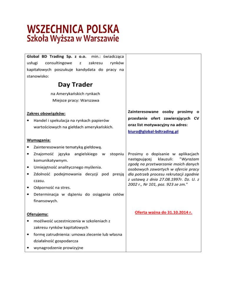 Global BD Trading Sp. z o.o. usługi consultingowe z min.: świadcząca zakresu rynków kapitałowych poszukuje kandydata do pracy na stanowisko: Day Trader na Amerykańskich rynkach Miejsce pracy: Warszawa Zainteresowane osoby prosimy o Zakres obowiązków: • Handel i spekulacja na rynkach papierów wartościowych na giełdach amerykańskich. przesłanie ofert zawierających CV oraz list motywacyjny na adres: [email protected] Wymagania: • Zainteresowanie tematyką giełdową. • Znajomość • stopniu Prosimy o dopisanie w aplikacjach następującej klauzuli: "Wyrażam komunikatywnym. zgodę na przetwarzanie moich danych Umiejętność analitycznego myślenia. osobowych zawartych w ofercie pracy Zdolność podejmowania decyzji pod presją dla potrzeb procesu rekrutacji zgodnie z ustawą z dnia 27.08.1997r. Dz. U. z czasu. 2002 r., Nr 101, poz. 923 ze zm." Odporność na stres. • Determinacja w dążeniu do osiągania celów • • języka angielskiego w finansowych. Oferujemy: • możliwość uczestniczenia w szkoleniach z zakresu rynków kapitałowych • formę zatrudnienia: umowa zlecenie lub własna działalność gospodarcza • wynagrodzenie prowizyjne Oferta ważna do 31.10.2014 r.
