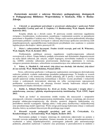 Zestawienie nowości z zakresu literatury pedagogicznej, dostępnych w Pedagogicznej Bibliotece Wojewódzkiej w Kielcach, Filia w BuskuZdroju. 1. Człowiek ze specjalnymi potrzebami w przestrzeni edukacyjnej i społecznej Polski oraz Republiki Czeskiej, pod red. Z. Gajdzicy i I. Bieńkowskiej, Wyd. Impuls, KrakówKatowice 2012. Książka składa się z dwóch części. W pierwszej zostały omówione zagadnienia związane z kształceniem, wychowaniem, socjalizacją i wspieraniem uczniów ze specjalnymi potrzebami w Republice Czeskiej oraz w Polsce. Druga część zawiera podrozdziały ukazujące porównania polskich i czeskich rozwiązań w zakresie aktywizacji społeczno-zawodowej osób niepełnosprawnych, egzemplifikowane konkretnymi przykładami oraz osadzone w systemie legislacyjnym obu krajów i aktów prawnych UE. 2. Dzieci z zaburzeniami łączonymi. Trudne ścieżki rozwoju, pod red. B. Winczury, Wyd. Impuls, Wyd. II, Kraków 2012. Problematyka publikacji porusza zagadnienie współwystępowania zaburzeń rozwojowych u dzieci. Grupa badaczy podjęła rozważania nad dylematami diagnostycznymi na styku takich zaburzeń, jak: autyzm, zespół Aspergera, niewerbalne trudności w uczeniu się, ADHD, centralne zaburzenia przetwarzania słuchowego, opóźnienia w rozwoju, mózgowe porażenie dziecięce, schizofrenia wczesnodziecięca oraz zaburzenia zachowania. 3. Faber, A., Mazlish E.: Jak mówić, żeby dzieci nas słuchały. Jak słuchać, żeby dzieci do nas mówiły. Wyd. Media Rodzina, Poznań [2013]. Nowe, odświeżone graficznie i wzbogacone suplementem zawierającym doświadczenia rodziców polskich, wydanie znakomitego poradnika pedagogicznego. To książka ze wszech miar praktyczna, a nie teoretyczna. Autorki pokazują, jak w prosty i niezwykle skuteczny sposób opanować sztukę skutecznej komunikacji z dziećmi. Liczne przykłady i wskazówki wzięte z codziennych doświadczeń ułatwiają nie tylko rozwiązywanie najczęstszych problemów wychowawczych, ale obrazują również metody budowania silnych więzi emocjonalnych między dorosłymi a dziećmi. 4. Kielin J., Klimek-Markowicz K.: Krok po kroku. Nauczanie i terapia dzieci z umiarkowaną, znaczną i głęboką niepełnosprawnością intelektualną. Wyd. GWP, Sopot 2013. "Krok po kroku" to nieocenione źródło wiedzy dla nauczycieli i terapeutów pracujących z dziećmi z niepełnosprawnością intelektualną. Autorzy wyjaśniają, jak stworzyć program edukacyjno-terapeutyczny dla dziecka, postawić diagnozę funkcjonalną czy prawidłowo stawiać wymagania. Opisują zalety i wady pracy dyrektywnej i niedyrektywnej oraz przedstawiają model superwizji. Wiele uwagi poświęcają budowaniu relacji z rodzicami dziecka, którzy są osobami kluczowymi dla przebiegu jego terapii. 5. Kierunki rozwoju pedagogiki specjalnej, pod red. K. Kosakowskiego i A. Żywanowskiej. Wyd. Impuls, Kraków 2013. Ćwirynkało, Cz. Rozważania podjęte w książce zmierzają do znalezienia odpowiedzi na pytanie o kierunki rozwoju pedagogiki specjalnej. Zmiana stosunku do osób z niepełnosprawnością i wyobrażeń o samej niepełnosprawności, postrzeganie jednostki jako autonomicznego podmiotu, pluralizm zachowań i wyborów oraz przemiany w prawodawstwie to niektóre z konsekwencji tych przeobrażeń dla funkcjonowania osób z niepełnosprawnością omawiane w tomie. 6. Kompetentne wspieranie osób z niepełnosprawnością, pod red. B. SidorPiekarskiej. Wyd. KUL, Lublin 2013. Książka porusza tak ważne zagadnienia jak: wsparcie osób z autyzmem w środowisku wychowawczym, znaczenie udzielania wsparcia dziecku z niepełnosprawnością intelektualną oraz współczesne rozwiązania w zakresie wspierania zatrudnienia osób z uszkodzeniami słuchu i Wsparcie społeczne rodziców dzieci z uszkodzeniami słuchu, a także potrzeby i otrzymywane wsparcie przez rodziny z dzieckiem z mózgowym porażeniem dziecięcym. 7. Naprawa R. i in.: Nie jesteś sam. Programy edukacji dzieci i młodzieży z niepełnosprawnością intelektualną w stopniu umiarkowanym, znacznym i głębokim. Wyd. HARMONIA, Gdańsk 2012. W książce zawarte są wybrane definicje upośledzenia umysłowego oraz ogólna charakterystyka uczniów niepełnosprawnych intelektualnie w stopniu znacznym i głębokim. Ponadto omówiono cele i zadania specjalnego ośrodka szkolno-wychowawczego oraz organizację zajęć rewalidacyjnych. Książka zawiera wskazówki dotyczące planowania i konstruowania programów edukacji oraz przykłady programów edukacji dla dzieci i młodzieży z niepełnosprawnością intelektualną w stopniu umiarkowanym, znacznym i głębokim, a także przykłady indywidualnych programów zajęć rewalidacyjnowychowawczych dla uczniów z niepełnosprawnością intelektualną w stopniu znacznym lub głębokim. 8. Pawlak P.: Dzieci z ADHD i ich rodzeństwo. Teoria i badania. Wyd. Impuls, Kraków 2013. Książka składa się z 3 części: analizy literatury tematu, metodologii podjętych badań oraz części empirycznej. Jest tu charakterystyka objawów ADHD, a także ich wpływ na funkcjonowanie dziecka. Przedstawiono wyniki badań dzieci z ADHD, zaprezentowano rożne sposoby postępowania terapeutycznego, a także różne postawy rodzicielskie i środki wychowawcze. Autor poddał także analizie sferę relacji interpersonalnych w rodzinie. 9. Problematyka osób niepełnosprawnych w oglądzie teoretyków i praktyków, pod red. A. Klinik. Wyd. Impuls, Kraków-Katowice 2012. Książka zawiera opinie naukowców i praktyków na temat różnych form edukacji, uspołecznienia i terapii osób z wielorakimi deficytami wiedzy i umiejętności wynikających z określonej formy niepełnosprawności. 10. Sikorski W.: Komunikacja terapeutyczna. Relacja pozasłowna. Wyd. Impuls, Kraków 2013. W książce opisano wpływ komunikacji i zachowań niewerbalnych na skuteczność terapii. Scharakteryzowano: istotę pozasłownej komunikacji terapeutycznej; znaczenie ekspresji mimicznej (jęz