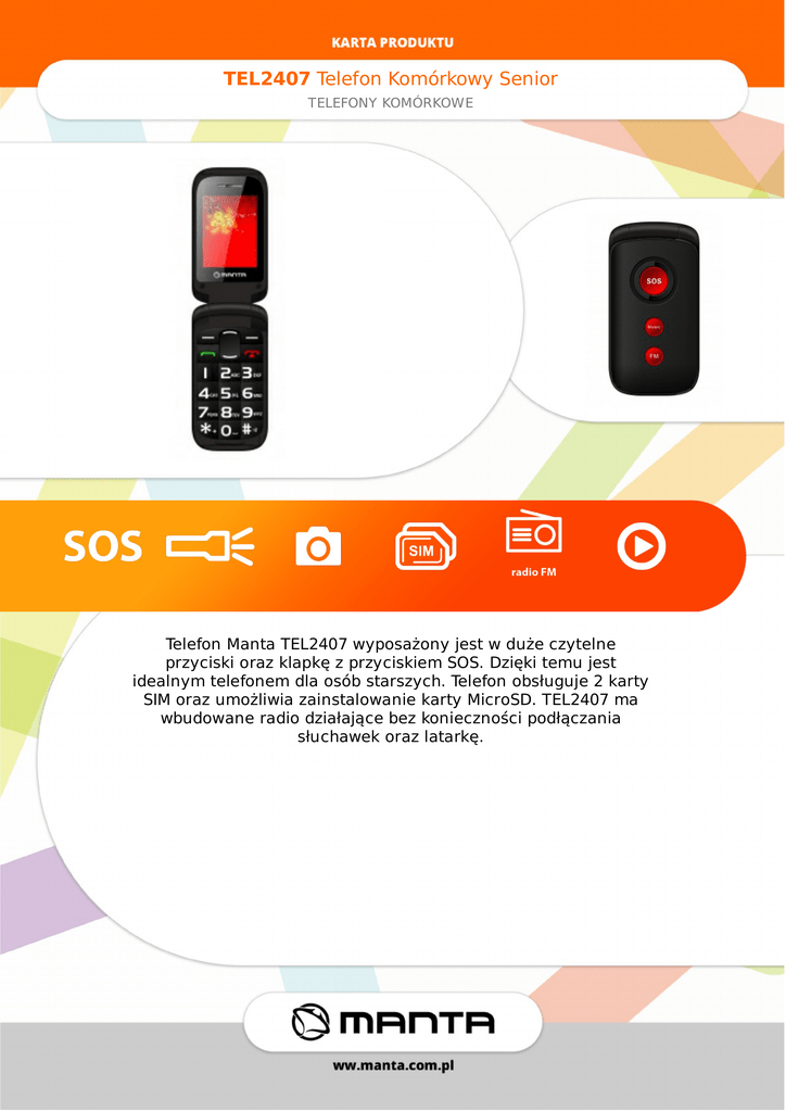 TEL2407TelefonKomórkowySenior TELEFONYKOMÓRKOWE TelefonMantaTEL2407wyposażonyjestwdużeczytelne przyciskiorazklapkęzprzyciskiemSOS.Dziękitemujest idealnymtelefonemdlaosóbstarszych.Telefonobsługuje2karty SIMorazumożliwiazainstalowaniekartyMicroSD.TEL2407ma wbudowaneradiodziałającebezkoniecznościpodłączania słuchawekorazlatarkę. TEL2407TelefonKomórkowySenior TELEFONYKOMÓRKOWE Specyfikacja Przekątnaekranu 2,4" Rozdzielczość 240x320 Wymiary(SxWxG) 104x53x20mm Waga 94g Wi-Fi NIE Dual-SIM Tak Bluetooth Tak Aparat TAK Gniazdokartpamięci MicroSD Pojemnośćakumulatora 800mAh ObsługiwanepasmaGSM 900/1800MHz RadioFM Tak Dodatkowefunkcje PrzyciskSOS,przyciskszybkiego uruchamianiaodtwarzaczamultimedialnegoi radiaFM,latarka OdtwarzanieMP3 TAK Obsługamultimediów TAK http://www.manta.com.pl/pl/tel2407 EAN:5907377866404