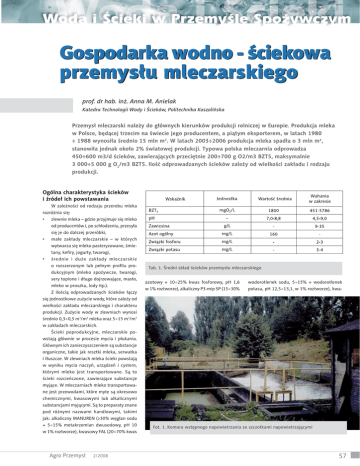 Woda i Ścieki w Przemyśle Spożywczym Gospodarka wodno - ściekowa przemysłu mleczarskiego prof. dr hab. inż. Anna M. Anielak Katedra Technologii Wody i Ścieków, Politechnika Koszalińska Przemysł mleczarski należy do głównych kierunków produkcji rolniczej w Europie. Produkcja mleka w Polsce, będącej trzecim na świecie jego producentem, a piątym eksporterem, w latach 1980 ÷ 1988 wynosiła średnio 15 mln m3. W latach 2003÷2006 produkcja mleka spadła o 3 mln m3, stanowiła jednak około 2% światowej produkcji. Typowa polska mleczarnia odprowadza 450÷600 m3/d ścieków, zawierających przeciętnie 200÷700 g O2/m3 BZT5, maksymalnie 3 000÷5 000 g O2/m3 BZT5. Ilość odprowadzanych ścieków zależy od wielkości zakładu i rodzaju produkcji. Ogólna charakterystyka ścieków i źródeł ich powstawania W zależności od rodzaju przerobu mleka rozróżnia się: • zlewnie mleka – gdzie przyjmuje się mleko od producentów i, po schłodzeniu, przesyła się je do dalszej przeróbki, • małe zakłady mleczarskie – w których wytwarza się mleko pasteryzowane, śmietany, kefiry, jogurty, twarogi, • średnie i duże zakłady mleczarskie o rozszerzonym lub pełnym profilu produkcyjnym (mleko spożywcze, twarogi, sery topione i długo dojrzewające, masło, mleko w proszku, lody itp.). Z ilością odprowadzanych ścieków łączy się jednostkowe zużycie wody, które zależy od wielkości zakładu mleczarskiego i charakteru produkcji. Zużycie wody w zlewniach wynosi średnio 0,3÷0,5 m3/m3 mleka oraz 5÷15 m3/m3 w zakładach mleczarskich. Ścieki poprodukcyjne, mleczarskie powstają głównie w procesie mycia i płukania. Głównym ich zanieczyszczeniem są substancje organiczne, takie jak resztki mleka, serwatka i tłuszcze. W zlewniach mleka ścieki powstają w wyniku mycia naczyń, urządzeń i cystern, którymi mleko jest transportowane. Są to ścieki rozcieńczone, zawierające substancje myjące. W mleczarniach mleko transportowane jest przewodami, które myte są okresowo chemicznymi, kwasowymi lub alkalicznymi substancjami myjącymi. Są to preparaty znane pod różnymi nazwami handlowymi, takimi jak: alkaliczny MANUREN (>30% węglan sodu + 5÷15% metakrzemian dwusodowy, pH 10 w 1% roztworze), kwasowy FAL (20÷70% kwas Agro Przemysł 2/2008 Tab. 1. Średni skład ścieków przemysłu mleczarskiego azotowy + 10÷25% kwas fosforowy, pH 1,6 w 1% roztworze), alkaliczny P3-mip SP (15÷30% wodorotlenek sodu, 5÷15% + wodorotlenek potasu, pH 12,5÷13,1, w 1% roztworze), kwa- Fot. 1. Komora wstępnego napowietrzania ze szczotkami napowietrzającymi 57 Woda i Ścieki w Przemyśle Spożywczym Fot. 2. Rów cyrkulacyjny o objętości 1980 m3 się osadów dennych. Dlatego ścieki przemysłu mleczarskiego, przed odprowadzeniem do odbiornika, powinny być poddane procesowi oczyszczania. Metody oczyszczania ścieków mleczarskich sowy CIP ACIDAN (>60% kwas fosforowy + <5% niejonowe substancje powierzchniowo-czynne, pH 1,9 w 1% roztworze), kwasowy P-3 – ultrasil 110 (1÷5% wodorotlenek sodu + 15÷30% etylenodiamonitetraoctowy + 1÷5% alkilobenzylosulfonian) i inne. Ścieki z wytwórni kazeiny w proszku mają dużo zawiesiny - od 9÷14 g/L, zawierają około 160 mg/L azotu ogólnego, od 2 do 3 mg/L fosforu ogólnego oraz od 3 do 4 mg/L związków potasu. Ścieki z serowni zawierają 20% serwatki, trudnej do usunięcia ze ścieków przed ich odprowadzeniem do odbiornika. W wytwórni mleka w proszku powstają ścieki, które pochodzą głównie z mycia naczyń i urządzeń oraz ze skraplacza barometrycznego. Ścieki przemysłu mleczarskiego łatwo ulegają procesowi fermentacji, w wyniku której zachodzi znaczne obniżenie pH (nawet do 4,5) i intensywne zużycie tlenu w wodach odbiornika. Substancje organiczne łatwo ulegają biodegradacji i są dobrą pożywką do rozwoju mikroorganizmów i grzybów ściekowych, obrastania brzegów i tworzenia Do oczyszczania ścieków przemysłu mleczarskiego stosowane są różne metody: • Nawadnianie pól i łąk, metodą bruzdową i rozdeszczawiania. Metoda ta jest prosta, posiada jednak wady. Gleba po kilku latach nawadniania staje się niezdatna do uprawy, a dowożenie ścieków jest uciążliwe i kosztowne. Ze względu na wegetację roślin, rolnicze wykorzystanie serwatki może być tylko okresowe. W procesie rozkładania się białka wydziela się siarkowodór i amoniak. Istnieje niebezpieczeństwo wtórnego zarażenia gruźlicą bydła wypasanego na nawadnianych polach. • Złoża biologiczne stosowane były głównie w latach 50. Znaczne obciążenie złoża substancjami organicznymi przyczynia się do Tab.2. Fizyczno-chemiczna charakterystyka pracy oczyszczalni ścieków w OSM Chojnice (badania wyk. 26 lipca 2000 r.) Fot. 3. Rów cyrkulacyjny stosowany do oczyszczania ścieków mleczarskich 58 2/2008 Agro Przemysł Woda i Ścieki w Przemyśle Spożywczym Fot. 4. Widok z góry na SBR ze ściekami mleczarskimi • • • • silnego rozwoju mikroorganizmów. Dlatego wskazana jest recyrkulacja ścieków oczyszczonych od 1:5 do 1:10, stężenie BZT5 ścieków rozcieńczonych powinno wynosić poniżej 300 mgO2/L. Obciążenie 300–800 gBZT5/(m3d) limituje skuteczność oczyszczania. Oprócz recyrkulacji ścieków oczyszczonych złoża można stosować w układzie naprzemiennym, szeregowym. Rowy cyrkulacyjne stosowane są od lat 60. W 1972 roku było ich 72, a w 1975 już ponad 120. Prędkość przepływu ścieków w rowie cyrkulacyjnym powinna wynosić v ≥ 0,25 m/s. Do napowietrzania ścieków stosowane są głównie szczotki napowietrzające, najlepiej typu klatkowego (fot.1 i 2 ). Odcinek prosty za szczotką jest 5 m, odstępy między szczotkami x 100 m, czas zatrzymania ścieków od 3 do 10 dni. Efekt obniżenia BZT5 ścieków w rowach cyrkulacyjnych wynosi około 95÷99%. Wartość BZT5 ścieków oczyszczonych waha się w granicach od 8 do 40 g O2/m3. Ścieki oczyszczane są, najczęściej, w układzie technologicznym: pia