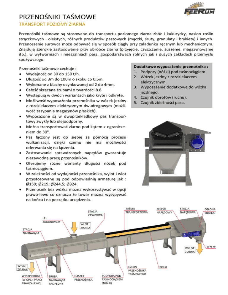 PRZENOŚNIKI TAŚMOWE TRANSPORT POZIOMY ZIARNA Przenośniki taśmowe są stosowane do transportu poziomego ziarna zbóż i kukurydzy, nasion roślin strączkowych i oleistych, różnych produktów paszowych (mączki, śruty, granulaty i brykiety) i innych. Przenoszenie surowca może odbywać się w sposób ciągły przy załadunku ręcznym lub mechanicznym. Znajdują szerokie zastosowanie przy obróbce ziarna (przyjęcie, czyszczenie, suszenie, magazynowanie itp.), w wytwórniach i mieszalniach pasz, gospodarstwach rolnych jak i dużych zakładach przemysłu spożywczego. Przenośniki taśmowe cechuje : • Wydajność od 30 do 150 t/h. • Długość od 3m do 100m o skoku co 0,5m. • Wykonane z blachy ocynkowanej od 2 do 4mm. • Całość skręcana śrubami o twardości 8.8 • Występują w dwóch wariantach jako kryte i odkryte. • Możliwość wyposażenia przenośnika w wózek jezdny z rozdzielaczem elektrycznym dwudrogowym (możliwość zasypania magazynów płaskich). • Wyposażone są w dwuprzekładkowy pas transportowy zwykły lub olejoodporny. • Można transportować ziarno pod kątem z ograniczeniem do 30o. • Pas łączony jest do siebie za pomocą procesu wulkanizacji, dzięki czemu nie ma możliwości oderwania się na łączeniu. • Zastosowanie sprawdzonych napędów gwarantuje niezawodną pracę przenośników. • Oferujemy różne warianty długości nóżek pod taśmociągiem. • W zależności od wydajności przenośnika, wylot i wlot przystosowane są pod odpowiednią armaturę jak : Ø159; Ø219; Ø244,5; Ø324. • Przenośnik bez wózka można wykorzystywać w opcji prawo-lewo co oznacza że towar można wysypywać na końcu i na początku urządzenia. Dodatkowe wyposażenie przenośnika : 1. Podpory (nóżki) pod taśmociągiem. 2. Wózek jezdny z rozdzielaczem elektrycznym. 3. Wyposażenie dodatkowe do wózka jezdnego. 4. Czujnik obrotów (ruchu). 5. Czujnik zbieżności pasa. Typ 30 t/h 50 t/h 80 t/h 130 t/h 150 t/h A B mm mm 400 540 400 540 650 790 650 790 650 790 C D E mm fi 60x167 fi 60x167 fi 60x151 fi 60x151 fi 60x151 mm fi 60x434 fi 60x434 fi 60x684 fi 60x684 fi 60x684 F mm mm 267 322 267 322 260 320 260 320 260 320 K L-L szt m 1 3,0 - 70,0 1 3,0 - 70,0 1 3,0 - 100,0 1 3,0 - 100,0 1 3,0 - 100,0 Wymiary Moc Prędkość Wydajwysypu elektryczna pasa ność mm kW m/s t/h Ø159 1,5 - 4,0 1,7 30 Ø219 1,5 - 4,0 1,7 50 Ø244,5 2,2 - 5,5 1,7 80 Ø324 2,2 - 7,5 1,7 130 Ø324 2,2 - 7,5 1,7 150 Producent zastrzega sobie możliwość wprowadzenia zmian technicznych OPCJA JEDNOWYLOTOWA OPCJA DWUWYLOTOWA (PRAWO-LEWO) OPCJA PRZENOŚNIK ODKRYTY Z WÓZKIEM JEZDNYM Z WYZNACZONYMI MIEJSCAMI WYRZUTU ZIARNA OPCJA PRZENOŚNIK ODKRYTY Z WÓZKIEM JEZDNYM Z DOWOLNYM WYRZUTEM ZIARNA – WERSJA Z WÓZKAMI NA LISTWIE PROWADZĄCEJ OPCJA PRZENOŚNIK ODKRYTY Z WÓZKIEM JEZDNYM Z DOWOLNYM WYRZUTEM ZIARNA – WERSJA Z CYBANTAMI NA NAPIĘTEJ LINIE Przenośnik taśmowy T400 Przenośnik taśmowy T650 ROZSYPNIK JEZDNY Z PRZENOŚNIKAMI TAŚMOWYMI Jest to urządzenie służące do równomiernego zasypania materiałem sypkim magazynu płaskiego. Rozprowadza ziarno w wyznaczone miejsca. Cały system oparty jest na przenośnikach taśmowych, które wsparte na specjalnych konstrukcjach nośnych przesuwają się po szynach na wózeczkach jezdnych. Rozsypnik jezdny z przenośnikami taśmowymi cechuje : • Musi znajdować się pod zadaszeniem. • Składa się z odkrytych 2 przenośników taśmowych z 1 wózkiem jezdnym. • Wyrzut materiału sypkiego odbywa się w dowolnym miejscu. • Lekkie urządzenie wraz z konstrukcją. • Możliwość ustawienia tylko w poziomie.