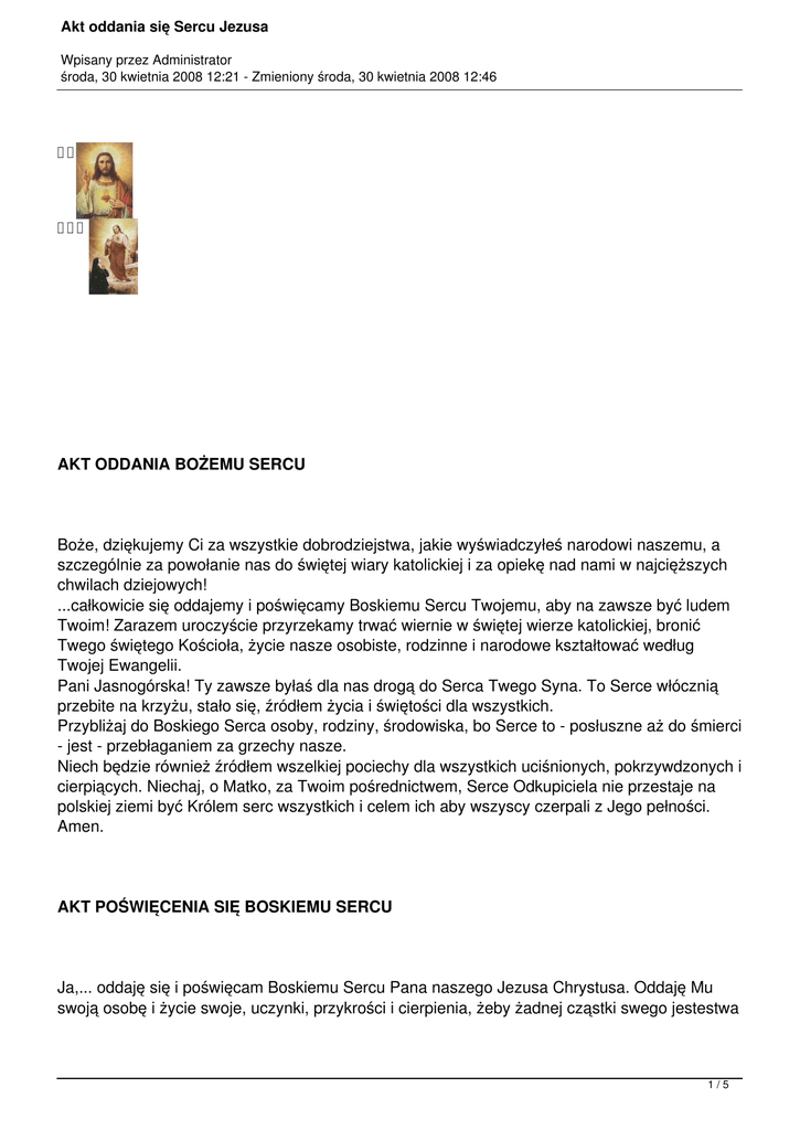 Akt oddania się Sercu Jezusa Wpisany przez Administrator środa, 30 kwietnia 2008 12:21 - Zmieniony środa, 30 kwietnia 2008 12:46 AKT ODDANIA BOŻEMU SERCU Boże, dziękujemy Ci za wszystkie dobrodziejstwa, jakie wyświadczyłeś narodowi naszemu, a szczególnie za powołanie nas do świętej wiary katolickiej i za opiekę nad nami w najcięższych chwilach dziejowych! ...całkowicie się oddajemy i poświęcamy Boskiemu Sercu Twojemu, aby na zawsze być ludem Twoim! Zarazem uroczyście przyrzekamy trwać wiernie w świętej wierze katolickiej, bronić Twego świętego Kościoła, życie nasze osobiste, rodzinne i narodowe kształtować według Twojej Ewangelii. Pani Jasnogórska! Ty zawsze byłaś dla nas drogą do Serca Twego Syna. To Serce włócznią przebite na krzyżu, stało się, źródłem życia i świętości dla wszystkich. Przybliżaj do Boskiego Serca osoby, rodziny, środowiska, bo Serce to - posłuszne aż do śmierci - jest - przebłaganiem za grzechy nasze. Niech będzie również źródłem wszelkiej pociechy dla wszystkich uciśnionych, pokrzywdzonych i cierpiących. Niechaj, o Matko, za Twoim pośrednictwem, Serce Odkupiciela nie przestaje na polskiej ziemi być Królem serc wszystkich i celem ich aby wszyscy czerpali z Jego pełności. Amen. AKT POŚWIĘCENIA SIĘ BOSKIEMU SERCU Ja,... oddaję się i poświęcam Boskiemu Sercu Pana naszego Jezusa Chrystusa. Oddaję Mu swoją osobę i życie swoje, uczynki, przykrości i cierpienia, żeby żadnej cząstki swego jestestwa 1/5 Akt oddania się Sercu Jezusa Wpisany przez Administrator środa, 30 kwietnia 2008 12:21 - Zmieniony środa, 30 kwietnia 2008 12:46 więcej nie używać, jak tylko dla Jego czci, miłości i chwały. Taka jest nieodwołalna wola moja, żeby całkowicie do Niego należeć, i wszystko czynić z miłości ku Niemu, wyrzekając się całym sercem wszystkiego, co by się Jemu nie podobało. Dlatego Ciebie, Najświętsze Serce, obieram sobie za jedyny przedmiot mej miłości, za opiekuna mego życia, za rękojmię mego zbawienia, za lekarstwo za moją ułomność i niestałość, za wynagrodzenie za moje grzechy całego życia i za pewne schronienie w chwili mej śmierci. Bądź przeto, Serce pełne dobroci, moim usprawiedliwieniem wobec Boga, Twojego Ojca, i odwróć ode mnie strzały słusznego gniewu Jego. O Serce pełne miłości, w Tobie pokładam całą ufność moją, albowiem wszystkiego się obawiam ze strony mojej skłonności do czynienia zła, natomiast wszystkiego się spodziewam od Twojej dobroci. Dlatego zniszcz we mnie wszystko, co Tobie może się nie podobać lub sprzeciwiać. Niech czysta miłość Twoja, tak głęboko wniknie w moje serce, bym nie mógł zapomnieć o Tobie, ani też oddalić się od Ciebie. Błagam Cię przez wszystką dobroć Twoją, by imię moje zapisane było w Tobie, gdyż to tylko pragnę uważać za szczęście swoje i swoją chwałą, żeby żyć i umierać jako Twój wierny sługa. Amen. AKT OSOBISTEGO POŚWIĘCENIA SIĘ SERCU PANA JEZUSA Tobie Chrystusie składam hołd wdzięczności za wszystko, co z miłującego serca uczyniłeś. Polecam się Twemu Sercu, oddając się całkowicie do Twojej dyspozycji. Ofiaruję więc wszystkie swoje cierpienia, niewygody, upokorzenia, oraz wszystkie swoje dobre uczynki i modlitwy. Proszę, aby wszelkie moje ofiary, były przyjęte jako wynagrodzenie za grzechy tych, którzy ducha prawości i pokuty zatracili. To, co ofiaruję, niech będzie przeciwwagą dla zniewag, które ranią Twoje Serce. Ty Boże wiesz, co jest ukryte w głębiach mojego serca, znasz moje pragnienia. Proszę Cię o łaskę wytrwania w tym co dobre. Dopomóż mi, aby moje codzienne życie było świadectwem ofiarowania się Tobie. AKT ODDANIA DZIECI I MŁODZIEŻY NAJŚWIĘTSZEMU SERCU PANA JEZUSA Najświętsze Serce Jezusa. My chłopcy i dziewczęta, stajemy na Twoje wezwanie. Przyszedłeś Jezu zapalić na świecie ogień Twej miłości. Podejmujemy Twe hasło. Chcemy zapalić się Boską miłością. Za Twoje Serce, które dałeś ludzkości, za Twe ukochanie, zwłaszcza dzieci i młodzieży, oddajemy Ci nasze młode serca. Twoje prawo będzie naszym prawem. Dochowamy wierności Twym przykazaniom, zwłaszcza miłości Boga i bliźniego. Będziemy wzbogacać nasz umysł, nie tylko wiedzą ludzką, ale Boską, chodząc na lekcje religii. Będziemy korzystać ze źródeł Twej łaski, zwłaszcza Mszy świętej niedzielnej i Komunii świętej nade wszystko w pierwsze piątki miesiąca. Będziemy opierać się wszelkim pokusom do złego. Chcemy zachować wiarę, czystość i męstwo. Będziemy walczyć o to, aby Cię wszyscy ludzie kochali. Najświętsze Serce Jezusa, przyjmij nas jako Twych rycerzy i racz nam błogosławić. Amen. 2/5 Akt oddania się Sercu Jezusa Wpisany przez Administrator środa, 30 kwietnia 2008 12:21 - Zmieniony środa, 30 kwietnia 2008 12:46 AKT WYNAGRODZENIA NAJŚWIĘTSZEMU SERCU PANA JEZUSA Jezu miłujący nas całym serce, godny najgłębszej miłości i najwyższej chwały, a mimo to tak mało kochany a nawet nienawidzony i w swych wyznawcach prześladowany, pragniemy na wszelki dostępny nam sposób współpracować w dziele zbawienia i dążyć do przemiany umiłowanego przez Ciebie świata. Aby wynagrodzić za obojętność, zniewagi, nienawiść do Ciebie, brak miłości i krzywdy wyrządzone bliźnim, które równocześnie godzą w Ciebie, kochającego ludzi, chcemy odtąd gorliwiej i doskonalej służyć Tobie i spełniać dokładniej Twoją wolę. W tym celu składamy w ofierze wszystko, co mamy lub posiadać możemy, nasze zdolności i całych siebie, abyś tym wszystkim rozporządzał według swego upodobania. Chcemy służyć w Kościele świętym według wzoru jaki nam zostawiłeś i naśladować Twoją miłość ku Ojcu Twemu i naszemu oraz ku wszystkim ludziom, Twoim i naszym braciom. Aby to ofiarowanie i wynagrodzenie było doskonalsze, włączamy je w ofiarę Twoją na Krzyżu, uobecnianą codziennie na oł