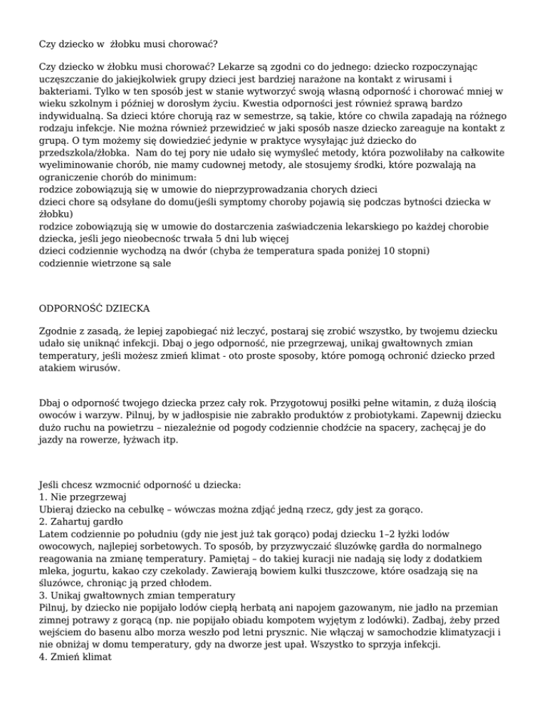 Czy dziecko w żłobku musi chorować? Czy dziecko w żłobku musi chorować? Lekarze są zgodni co do jednego: dziecko rozpoczynając uczęszczanie do jakiejkolwiek grupy dzieci jest bardziej narażone na kontakt z wirusami i bakteriami. Tylko w ten sposób jest w stanie wytworzyć swoją własną odporność i chorować mniej w wieku szkolnym i później w dorosłym życiu. Kwestia odporności jest również sprawą bardzo indywidualną. Sa dzieci które chorują raz w semestrze, są takie, które co chwila zapadają na różnego rodzaju infekcje. Nie można również przewidzieć w jaki sposób nasze dziecko zareaguje na kontakt z grupą. O tym możemy się dowiedzieć jedynie w praktyce wysyłając już dziecko do przedszkola/żłobka. Nam do tej pory nie udało się wymyśleć metody, która pozwoliłaby na całkowite wyeliminowanie chorób, nie mamy cudownej metody, ale stosujemy środki, które pozwalają na ograniczenie chorób do minimum: rodzice zobowiązują się w umowie do nieprzyprowadzania chorych dzieci dzieci chore są odsyłane do domu(jeśli symptomy choroby pojawią się podczas bytności dziecka w żłobku) rodzice zobowiązują się w umowie do dostarczenia zaświadczenia lekarskiego po każdej chorobie dziecka, jeśli jego nieobecnośc trwała 5 dni lub więcej dzieci codziennie wychodzą na dwór (chyba że temperatura spada poniżej 10 stopni) codziennie wietrzone są sale ODPORNOŚĆ DZIECKA Zgodnie z zasadą, że lepiej zapobiegać niż leczyć, postaraj się zrobić wszystko, by twojemu dziecku udało się uniknąć infekcji. Dbaj o jego odporność, nie przegrzewaj, unikaj gwałtownych zmian temperatury, jeśli możesz zmień klimat - oto proste sposoby, które pomogą ochronić dziecko przed atakiem wirusów. Dbaj o odporność twojego dziecka przez cały rok. Przygotowuj posiłki pełne witamin, z dużą ilością owoców i warzyw. Pilnuj, by w jadłospisie nie zabrakło produktów z probiotykami. Zapewnij dziecku dużo ruchu na powietrzu – niezależnie od pogody codziennie chodźcie na spacery, zachęcaj je do jazdy na rowerze, łyżwach itp. Jeśli chcesz wzmocnić odporność u dziecka: 1. Nie przegrzewaj Ubieraj dziecko na cebulkę – wówczas można zdjąć jedną rzecz, gdy jest za gorąco. 2. Zahartuj gardło Latem codziennie po południu (gdy nie jest już tak gorąco) podaj dziecku 1–2 łyżki lodów owocowych, najlepiej sorbetowych. To sposób, by przyzwyczaić śluzówkę gardła do normalnego reagowania na zmianę temperatury. Pamiętaj – do takiej kuracji nie nadają się lody z dodatkiem mleka, jogurtu, kakao czy czekolady. Zawierają bowiem kulki tłuszczowe, które osadzają się na śluzówce, chroniąc ją przed chłodem. 3. Unikaj gwałtownych zmian temperatury Pilnuj, by dziecko nie popijało lodów ciepłą herbatą ani napojem gazowanym, nie jadło na przemian zimnej potrawy z gorącą (np. nie popijało obiadu kompotem wyjętym z lodówki). Zadbaj, żeby przed wejściem do basenu albo morza weszło pod letni prysznic. Nie włączaj w samochodzie klimatyzacji i nie obniżaj w domu temperatury, gdy na dworze jest upał. Wszystko to sprzyja infekcji. 4. Zmień klimat Aby zmniejszyć liczbę angin, czasem wystarczy leczenie klimatyczne. Zabierz dziecko na kilka tygodni w góry albo nad morze. 5. Sięgnij po leki Gdy dziecko często choruje na anginy, rozważ z lekarzem kurację preparatami wzmacniającymi odporność. Czasem wystarczą probiotyki albo leki homeopatyczne, innym razem trzeba podać szczepionkę uodporniającą. 6. A może zabieg? Jeżeli dziecko ma 6–7 angin w roku, którym towarzyszą ropnie w okolicy migdałków albo zapalenie kłębuszków nerkowych, czasem jedynym ratunkiem jest podcięcie przerośniętych migdałków. O tym, czy potrzebna jest operacja, decyduje lekarz. Artykuł pochodzi z miesięcznika "Zdrowie"