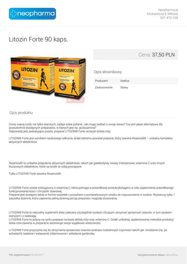Neopharma.pl Mickiewicza 5, Mikstat 531-470-109 Litozin Forte 90 kaps. Cena: 37,50 PLN Opis słownikowy Producent Axellus Zastosowanie Stawy Opis produktu Coraz więcej osób, nie tylko starszych, zadaje sobie pytanie: Jak mogę zadbać o swoje stawy? Czy jest jakaś alternatywa dla powszechnie dostępnych preparatów, w których jest np. glukozamina? Odpowiedź jest zaskakująco prosta: preparat LITOZIN® Forte na bazie dzikiej róży. LITOZIN® Forte jest wynikiem naukowego odkrycia, dzięki któremu powstał preparat, który zawiera Rosenoid® – unikalny kompleks aktywnych składników. Rosenoid® to unikalne połączenie aktywnych składników, takich jak galaktolipidy, kwasy triterpenowe, witamina C oraz innych kluczowych składników, które sa ściśle ze sobą powiązane. Tylko LITOZIN® Forte zawiera Rosenoid® LITOZIN® Forte został wzbogacony o witaminę C, która pomaga w prawidłowej produkcjikolagenu w celu zapewnienia prawidłowego funkcjonowania kości i chrząstki stawowej. Preparat jest dostępny także w formie saszetek z proszkiem o pomarańczowym smaku do rozpuszczenia w wodzie. Wystarczy tylko 1 saszetka dziennie, która zapewnia pełną dzienną porcję preparatu i wygodę stosowania. LITOZIN® Forte to naturalny suplement diety zalecany szczególnie osobom chcącym utrzymać sprawność stawów, w tym osobom starszym i z nadwagą. LITOZIN® Forte to jedyny na rynku preparat na bazie dzikiej róży oraz witaminy C. Dzięki unikalnej, opatentowanej metodzie produkcji dzika róża zawarta w preparacie zachowuje swoje wyjątkowe właściwości. LITOZIN® Forte przyczynia się do utrzymania sprawności stawów podczas codziennych czynności takich jak: chodzenie (np. po schodach), siadanie i wstawanie, zdejmowanie i wkładanie garderoby. Plik wygenerowano: 04-03-2017 Oprogramowanie sklepu: AptusShop Neopharma.pl Mickiewicza 5, Mikstat 531-470-109 Teraz LITOZIN® został wzbogacony kolagenem typu II. LITOZIN® Ultra to unikalne połączenie trzech składników aktywnych: specjalnie przygotowany proszek z dzikiej róży kolagen typu II, który występuje w chrząstkach stawowych witamina C, która wspomaga syntezę kolagenu i wspiera funkcję stawów KOLAGEN TYPU II to kolagen występujący w chrząstkach stawowych. Jest on podstawowym i najważniejszym rodzajem kolagenu chrząstki stawowej. KOLAGEN TYPU II decyduje o właściwościach chrząstki, wytrzymałości i sprężystości, zapewniając stawom elastyczność. LITOZIN® Ultra to jedyny preparat na rynku łączący specjalny proszek z dzikiej róży, kolagen typu II oraz witaminę C. Dla kogo przeznaczony jest LITOZIN® Ultra? Produkt zalecany jest szczególnie osobom: powyżej 40 r.ż, które chcą na długo utrzymać sprawność stawów prowadzącym tryb życia obciążający stawy, np. osobom uprawiającym sport z nadwagą i otyłością Jeśli nie glukozamina - to co? Dla wielu osób stosujących tabletki na stawy z glukozaminą, które nie są zadowolone z efektów, propozycją może być LITOZIN® Forte. Co ważne LITOZIN® Forte nie wykazuje działań niepożądanych, można go łączyć z innymi preparatami i długotrwale stosować (bez konieczności robienia przerw jak w przypadku części preparatów, w których zawarta jest glukozamina). Skład: Kapsułki: 3 kapsułki LITOZIN® Forte zawierają: 2,25 g proszku owoców dzikiej róży i 80 mg witaminy C (100% zalecanego dziennego spożycia). Zalecane dzienne spożycie Kapsułki: 3 kapsułki dziennie. Produkt należy przyjmować zgodnie z zalecanym dziennym spożyciem. Popić woda lub otworzyć kapsułkę i dodać proszek do jedzenia. Przyjmować podczas posiłku. Efekty stosowania preparatu LITOZIN® Forte zauważalne są zazwyczaj po 3-5 tygodniach stosowania. Zaleca się stosować preparat LITOZIN® Forte nie krócej niż 2-3 miesiące. Kapsułki należy przyjmować podczas posiłków. Nie należy przekraczać zalecanej porcji do spożycia w ciągu dnia. Plik wygenerowano: 04-03-2017 Powered by TCPDF (www.tcpdf.org) Oprogramowanie sklepu: AptusShop