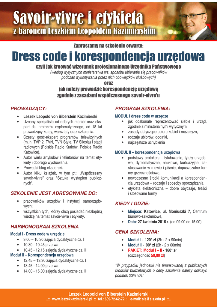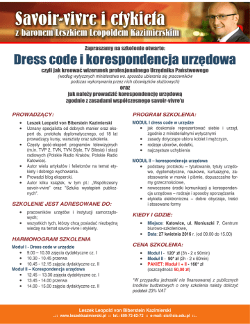 (według wytycznych ministerstwa ws. sposobu ubierania si pracowników podczas wykonywania przez nich obowi zków słu bowych) !" PROWADZ CY: • • • • • • PROGRAM SZKOLENIA: Leszek Leopold von Biberstein Kazimierski Uznany specjalista od dobrych manier oraz ekspert ds. protokołu dyplomatycznego, od 18 lat prowadz cy kursy, warsztaty oraz szkolenia. Cz sty go -ekspert programów telewizyjnych (m.in. TVP 2, TVN, TVN Style, TV Silesia) i stacji radiowych (Polskie Radio Kraków, Polskie Radio Katowice). Autor wielu artykułów i felietonów na temat etykiety i dobrego wychowania. Prowadzi blog ekspercki. Autor kilku ksi ek, w tym pt.: „Współczesny savoir-vivire” oraz "Sztuka wyst pie publicznych". SZKOLENIE JEST ADRESOWANE DO: • • # $## % pracowników urz dów i instytucji samorz dowych; wszystkich tych, którzy chc posiada niezb dn wiedz na temat savoir-vivre i etykiety. HARMONOGRAM SZKOLENIA Moduł I - Dress code w urz dzie • 9.00 – 10.30 zaj cia dydaktyczne cz. I • 10.30 - 10.45 przerwa • 10.45 - 12.15 zaj cia dydaktyczne cz. II Moduł II – Korespondencja urz dowa • 12.45 – 13.30 zaj cia dydaktyczne cz. I • 13.45 - 14.00 przerwa • 14.00 - 15.00 zaj cia dydaktyczne cz. II MODUŁ I dress code w urz dze • jak doskonale reprezentowa siebie i urz d, zgodnie z ministerialnymi wytycznymi • zasady dotycz ce ubioru kobiet i m czyzn, • rodzaje ubiorów, dodatki, • najcz stsze uchybienia MODUŁ II – korespondencja urz dowa • podstawy protokołu – tytułowanie, tytuły urz dowe, dyplomatyczne, naukowe, kurtuazyjne, zastosowanie w mowie i pi mie, dopuszczalne formy grzeczno ciowe, • nowoczesne rodki komunikacji a korespondencja urz dowa – rodzaje i sposoby sporz dzania • etykieta elektroniczna – dobre obyczaje, tre ci i stosowane formy KIEDY I GDZIE: • • Miejsce: Katowice, ul. Moniuszki 7, Centrum biurowo-szkoleniowe, Data: 27 kwietnia 2016 r. (od 09.00 do 15.00) CENA SZKOLENIA: • • • Moduł I - 120* zł (3h - 2 x 90min) Moduł II - 90* zł (2h - 2 x 60min) PAKIET: Moduł I + II - 160* zł (oszcz dno 50,00 zł) *W przypadku jednostki nie finansowanej z publicznych rodków bud etowych o ceny szkolenia nale y doliczy podatek 23% VAT Leszek Leopold von Biberstein Kazimierski ..:: www.leszekkazimierski.pl :: tel.: 609-72-62-72 :: e-mail: [email protected] ::.. 9&:$ FORMULARZ ZGŁOSZENIOWY $; % "& < )$ $) 7 )8& ! " "#$% "& " ' " ( ' &)* " $% !"####################################################### $"####################################################### %"####################################################### &"####################################################### ' ( * ) ################################################### ###################################################################### ' +, ########################## * - ############################# ############################################# +, - . / * . 0 . /) 3 4 3 5. 8 ) 6 :;< 4 9" + 0 1 7 4 49 6 3 , ) ( . ) ( ( ) / . ) . 6 ) * 2 ) 12 + 3 # . 5 *+ +2 , / # 4#3 #* .0 $ $6 $ $) 7 )8& L SKI INSTYTUT SZKOLE =;>-:$-=$-:$ 2 ? %$-$$:-!>-%$ - @ *0