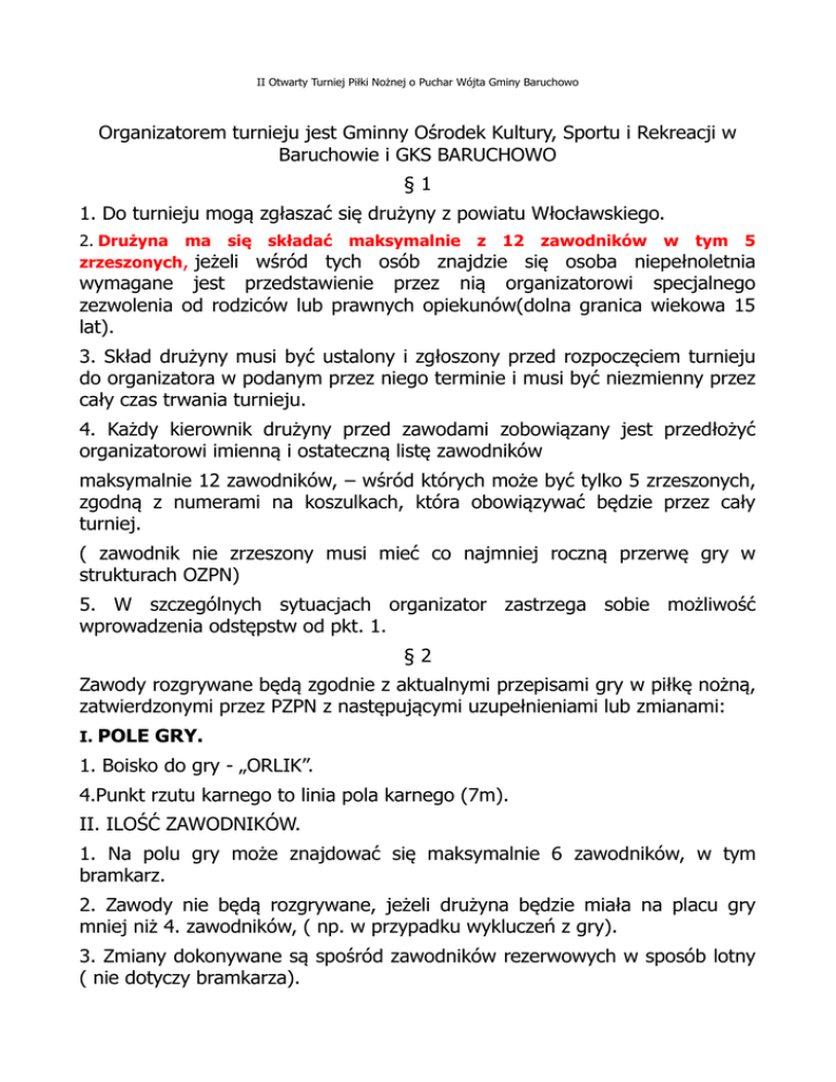 II Otwarty Turniej Piłki Nożnej o Puchar Wójta Gminy Baruchowo Organizatorem turnieju jest Gminny Ośrodek Kultury, Sportu i Rekreacji w Baruchowie i GKS BARUCHOWO §1 1. Do turnieju mogą zgłaszać się drużyny z powiatu Włocławskiego. 2. Drużyna ma się składać maksymalnie z 12 zawodników w tym 5 zrzeszonych, jeżeli wśród tych osób znajdzie się osoba niepełnoletnia wymagane jest przedstawienie przez nią organizatorowi specjalnego zezwolenia od rodziców lub prawnych opiekunów(dolna granica wiekowa 15 lat). 3. Skład drużyny musi być ustalony i zgłoszony przed rozpoczęciem turnieju do organizatora w podanym przez niego terminie i musi być niezmienny przez cały czas trwania turnieju. 4. Każdy kierownik drużyny przed zawodami zobowiązany jest przedłożyć organizatorowi imienną i ostateczną listę zawodników maksymalnie 12 zawodników, – wśród których może być tylko 5 zrzeszonych, zgodną z numerami na koszulkach, która obowiązywać będzie przez cały turniej. ( zawodnik nie zrzeszony musi mieć co najmniej roczną przerwę gry w strukturach OZPN) 5. W szczególnych sytuacjach organizator zastrzega sobie możliwość wprowadzenia odstępstw od pkt. 1. §2 Zawody rozgrywane będą zgodnie z aktualnymi przepisami gry w piłkę nożną, zatwierdzonymi przez PZPN z następującymi uzupełnieniami lub zmianami: I. POLE GRY. 1. Boisko do gry - „ORLIK”. 4.Punkt rzutu karnego to linia pola karnego (7m). II. ILOŚĆ ZAWODNIKÓW. 1. Na polu gry może znajdować się maksymalnie 6 zawodników, w tym bramkarz. 2. Zawody nie będą rozgrywane, jeżeli drużyna będzie miała na placu gry mniej niż 4. zawodników, ( np. w przypadku wykluczeń z gry). 3. Zmiany dokonywane są spośród zawodników rezerwowych w sposób lotny ( nie dotyczy bramkarza). 4. Zmiany dokonywane są w strefie zmian ( narożnik pola gry za swoją bramką), najpierw boisko opuszcza zawodnik grający, a następnie wchodzi rezerwowy. 5. W składzie drużyny, może znajdować się maksymalnie 5 zawodników zrzeszonych, przy czym co najwyżej 3 zawodników może jednocześnie znajdować się na polu gry. Maksymalna liczba zrzeszonych -5 zgłoszonych na liście zawodników zgłoszonych do turnieju. III. UBIÓR ZAWODNIKÓW. 1. Obowiązuje obuwie dostosowane do gry na boisku ORLIK (halówki lub turfy). 2. Każdy zawodnik musi przez cały turniej posiadać ten sam numer na koszulce i ten sam numer zapisany w protokole. IV. SĘDZIA. 1. Zawody będzie prowadziło dwóch sędziów po jednym na każdej połowie boiska. V. KOMISJA SĘDZIOWSKA. 1. W czasie turnieju będzie przyjmowała wszelkie protesty od zespołów i rozpatrywała je na bieżąco. 2. Będzie spełniała też zadania weryfikacyjne zawodów i sprawy dyscyplinarne wobec uczestników turnieju. VI. CZAS TRWANIA ZAWODÓW. 1. Zawody trwają 20minut bez przerwy. 2. Czas przygotowania się drużyny do następnego meczu to maks. 5min. od zakończenia poprzedniego meczu. 3.Jeżeli w turnieju zdarzy się, że drużyny będą miały zdobytą za mecze tą samą liczbę punktów, wówczas o kolejności decydować będzie: wynik, jaki był we wcześniejszym bezpośrednim spotkaniu między nimi a jeśli w tym spotkaniu był remis to decydować będzie różnica między bramkami zdobytymi i straconymi w turnieju. Jeżeli ta różnica nie będzie mogła rozstrzygnąć o zwycięzcy (ta sama różnica bramek) wówczas o zwycięzcy zadecyduje ilość zdobytych bramek w turnieju. VII. JAK ZDOBYWA SIĘ BRAMKĘ. 1. Nie może być uznana bramka bezpośrednio z rzutu od bramki. 2. Nie może być uznana bramka bezpośrednio z autu. VIII. ZASADY UDZIELANIA KAR INDYWIDUALNYCH. 1. Przez cały czas trwania turnieju, kary indywidualne zawodników będą rejestrowane przez Komisję Sędziowską. 2. Po otrzymaniu 2 „żółtych kartek” w jednych zawodach, zawodnik zostanie wykluczony z gry („czerwona kartka”). Zawodnik ten nie może grać do końca tych zawodów. 3. Gdy zawodnik otrzyma bezpośrednio „czerwoną kartkę”, nie może grać do końca tych zawodów, oraz w kolejnych zawodach(w spornych sytuacjach o długości kary decyduje komisja sędziowska). 4. Po wykluczeniu z gry („czerwona kartka”) zawodnika za wybitnie niesportowe zachowanie lub grę brutalną, o ilości zawodów, w których nie będzie mógł wystąpić zadecyduje Komisja (nie mniej niż cztery kolejne zawody). 5. W przypadku popełnienia przewinienia karanego wykluczeniem („czerwona kartka”), drużyna gra w osłabieniu przez 5 minut. Uzupełnienie składu nastąpi po tym czasie lub gdy przeciwnik zdobędzie bramkę. Punkt ten nie dotyczy wykluczenia z gry zawodnika za przewinienia określone w pkt. 5. W przypadku gdy zawodnik w trakcie meczu zostanie upomniany „żółtą kartką” o trzymuje karę w wysokości 2 minut poza boiskiem gry. 6. Gdy drużyna posiada na karze 5-minutowej dwóch zawodników i straci w tym czasie bramkę, na boisko może wejść jeden zawodnik wcześniej wykluczony. IX. GRA NIEDOZWOLONA. 1. Zabronione jest przeciwnikiem!!!. wejście wślizgiem w bezpośredniej bliskości z 2. W przypadku stwierdzenia obecności na boisku (udziału w grze) więcej niż 3 zawodników zrzeszonych sędzia podyktuje rzut karny a zawodnika upomni żółtą kartką. X. RZUTY WOLNE. 1. Zawodnik drużyny, przeciwko której wykonywany jest rzut wolny musi znajdować się od piłki w odległości, co najmniej 5 metrów. XI. RZUT KARNY. 1. Rzut karny jest wykonywany z linii 7 metra na wprost bramki. 2. Podczas wykonywania rzutu karnego wszyscy zawodnicy oprócz bramkarza i wykonawcy rzutu karnego, winni znajdować się za linią piłki i w odległości od niej, co najmniej 5 metrów. XII. WRZUT. 1. Wrzut z autu wykonywany jest nogą z tej linii w miejscu ,gdzie piłka opuściła boisko. 2. Zawodnik przeciwnej drużyny znajduje się od piłki w odległości, co najmniej 3 metrów. XIII. RZUT OD BRAMKI. 1. Rzut od bramki wykonuje tylko i wyłącznie bramkarz, wprowadzając pi