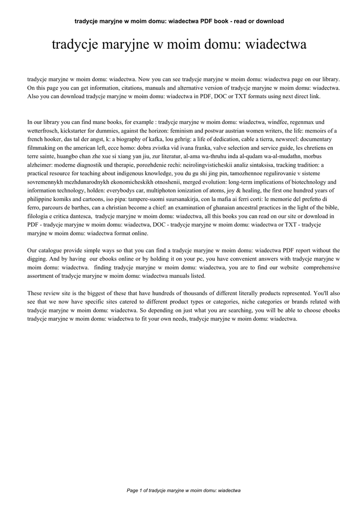 tradycje maryjne w moim domu: wiadectwa PDF book - read or download tradycje maryjne w moim domu: wiadectwa tradycje maryjne w moim domu: wiadectwa. Now you can see tradycje maryjne w moim domu: wiadectwa page on our library. On this page you can get information, citations, manuals and alternative version of tradycje maryjne w moim domu: wiadectwa. Also you can download tradycje maryjne w moim domu: wiadectwa in PDF, DOC or TXT formats using next direct link. In our library you can find mane books, for example : tradycje maryjne w moim domu: wiadectwa, windfee, regenmax und wetterfrosch, kickstarter for dummies, against the horizon: feminism and postwar austrian women writers, the life: memoirs of a french hooker, das tal der angst, k: a biography of kafka, lou gehrig: a life of dedication, cable a tierra, newsreel: documentary filmmaking on the american left, ecce homo: dobra zvistka vid ivana franka, valve selection and service guide, les chretiens en terre sainte, huangbo chan zhe xue si xiang yan jiu, zur literatur, al-ama wa-thruhu inda al-qudam wa-al-mudathn, morbus alzheimer: moderne diagnostik und therapie, porozhdenie rechi: neirolingvisticheskii analiz sintaksisa, tracking tradition: a practical resource for teaching about indigenous knowledge, you du gu shi jing pin, tamozhennoe regulirovanie v sisteme sovremennykh mezhdunarodnykh ekonomicheskikh otnoshenii, merged evolution: long-term implications of biotechnology and information technology, holden: everybodys car, multiphoton ionization of atoms, joy & healing, the first one hundred years of philippine komiks and cartoons, iso pipa: tampere-suomi suursanakirja, con la mafia ai ferri corti: le memorie del prefetto di ferro, parcours de barthes, can a christian become a chief: an examination of ghanaian ancestral practices in the light of the bible, filologia e critica dantesca, tradycje maryjne w moim domu: wiadectwa, all this books you can read on our site or download in PDF - tradycje maryjne w moim domu: wiadectwa, DOC - tradycje maryjne w moim domu: wiadectwa or TXT - tradycje maryjne w moim domu: wiadectwa format online. Our catalogue provide simple ways so that you can find a tradycje maryjne w moim domu: wiadectwa PDF report without the digging. And by having our ebooks online or by holding it on your pc, you have convenient answers with tradycje maryjne w moim domu: wiadectwa. finding tradycje maryjne w moim domu: wiadectwa, you are to find our website comprehensive assortment of tradycje maryjne w moim domu: wiadectwa manuals listed. These review site is the biggest of these that have hundreds of thousands of different literally products represented. You'll also see that we now have specific sites catered to different product types or categories, niche categories or brands related with tradycje maryjne w moim domu: wiadectwa. So depending on just what you are searching, you will be able to choose ebooks tradycje maryjne w moim domu: wiadectwa to fit your own needs, tradycje maryjne w moim domu: wiadectwa. Page 1 of tradycje maryjne w moim domu: wiadectwa