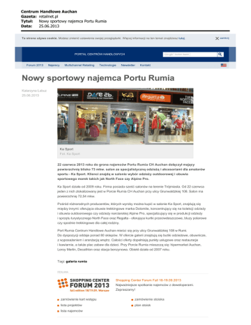 Centrum Handlowe Auchan Gazeta: retailnet.pl Tytu³: Nowy sportowy najemca Portu Rumia Data: 25.06.2013 Ta strona używa cookie. Możesz zmienić ustawienia swojej przeglądarki. Więcej informacji na ten temat znajdziesz tutaj. PORTAL CENTRÓW HANDLOWYCH Forum 2013 Najemcy Multichannel Retailing Technologie Newsletter Kontakt Nowy sportowy najemca Portu Rumia Katarzyna Łabuz 25.06.2013 Ka Sport Fot. Ka Sport 22 czerwca 2013 roku do grona najemców Portu Rumia CH Auchan dołączył mający powierzchnię blisko 73 mkw. salon ze specjalistyczną odzieżą i akcesoriami dla amatorów sportu - Ka Sport. Klienci znajdą w salonie wybór odzieży outdoorowej i obuwia sportowego marek takich jak North Face czy Alpine Pro. Ka Sport działa od 2009 roku. Firma posiada sześć salonów na terenie Trójmiasta. Od 22 czerwca jeden z nich zlokalizowany jest w Porcie Rumia CH Auchan przy ulicy Grunwaldzkiej 108. Salon ma powierzchnię 72,54 mkw. Pośród różnorodnych producentów, których wyroby można kupić w salonie Ka Sport, znajdują się między innymi: oferująca obuwie trekkingowe marka Dolomite, koncentrujący się na kolekcji odzieży i obuwia outdoorowego czy odzieży narciarskiej Alpine Pro, specjalizujący się w produkcji odzieży i sprzętu turystycznego North Face oraz Regatta - oferująca kurtki przeciwdeszczowe, bluzy polarowe czy spodnie trekkingowe dla całej rodziny. Port Rumia Centrum Handlowe Auchan mieści się przy ulicy Grunwaldzkiej 108 w Rumi. Do dyspozycji oddaje ponad 80 sklepów. W ofercie galerii znajdują się butiki odzieżowe, obuwnicze, z wyposażeniem i aranżacją wnętrz. Całości oferty dopełniają punkty usługowe oraz restauracje i kawiarnie, a także plac zabaw dla dzieci. Przy Porcie Rumia mieszczą się: hipermarket Auchan, Leroy Merlin, Decathlon oraz stacja benzynowa. Obiekt działa od 2007 roku. Tagi: galeria rumia REKLAMA Shopping Center Forum Fall 18-19.09.2013 Najważniejsze spotkanie najemców z deweloperami. Zapraszamy! zamówienie kart wstępu zamówienie stoiska lista projektów plan stoisk lista najemców zamknij Centrum Handlowe Auchan Gazeta: retailnet.pl Tytu³: Nowy sportowy najemca Portu Rumia Data: 25.06.2013 ← Poprzedni artykuł Następny artykuł → Kondycja handlu w czerwcu 2013 Lavard podsumowuje półrocze i zdradza plany ekspansji retailnet. PORTAL CENTRÓW HANDLOWYCH Portal rynku centrów i nieruchomości handlowych w Polsce. Codziennie nowe informacje o inwestycjach, najemcach, rozwoju sieci handlowych oraz technologiach handlu detalicznego. Portal oferuje codzienny newsletter. (c) 2013 Evigo POLECAMY Forum 2013 Deweloperzy Najemcy Multichannel Retailing BĄDŹMY W KONTAKCIE Evigo spółka z ograniczoną odpowiedzialnością sp.k. Technologie Newsletter ul. Zielna 37, 00-108 Warszawa, POLSKA Archiwum tel. +48 22 521 20 00, fax +48 22 521 20 20 Formularz kontaktu