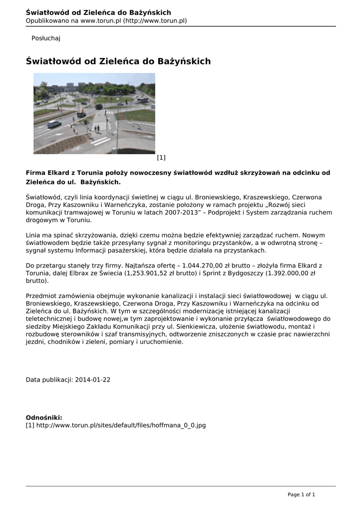 Światłowód od Zieleńca do Bażyńskich Opublikowano na www.torun.pl (http://www.torun.pl) Posłuchaj Światłowód od Zieleńca do Bażyńskich [1] Firma Elkard z Torunia położy nowoczesny światłowód wzdłuż skrzyżowań na odcinku od Zieleńca do ul. Bażyńskich. Światłowód, czyli linia koordynacji świetlnej w ciągu ul. Broniewskiego, Kraszewskiego, Czerwona Droga, Przy Kaszowniku i Warneńczyka, zostanie położony w ramach projektu „Rozwój sieci komunikacji tramwajowej w Toruniu w latach 2007-2013” – Podprojekt i System zarządzania ruchem drogowym w Toruniu. Linia ma spinać skrzyżowania, dzięki czemu można będzie efektywniej zarządzać ruchem. Nowym światłowodem będzie także przesyłany sygnał z monitoringu przystanków, a w odwrotną stronę – sygnał systemu Informacji pasażerskiej, która będzie działała na przystankach. Do przetargu stanęły trzy firmy. Najtańsza ofertę – 1.044.270,00 zł brutto – złożyła firma Elkard z Torunia, dalej Elbrax ze Świecia (1,253.901,52 zł brutto) i Sprint z Bydgoszczy (1.392.000,00 zł brutto). Przedmiot zamówienia obejmuje wykonanie kanalizacji i instalacji sieci światłowodowej w ciągu ul. Broniewskiego, Kraszewskiego, Czerwona Droga, Przy Kaszowniku i Warneńczyka na odcinku od Zieleńca do ul. Bażyńskich. W tym w szczególności modernizację istniejącej kanalizacji teletechnicznej i budowę nowej,w tym zaprojektowanie i wykonanie przyłącza światłowodowego do siedziby Miejskiego Zakładu Komunikacji przy ul. Sienkiewicza, ułożenie światłowodu, montaż i rozbudowę sterowników i szaf transmisyjnych, odtworzenie zniszczonych w czasie prac nawierzchni jezdni, chodników i zieleni, pomiary i uruchomienie. Data publikacji: 2014-01-22 Odnośniki: [1] http://www.torun.pl/sites/default/files/hoffmana_0_0.jpg Page 1 of 1 Powered by TCPDF (www.tcpdf.org)