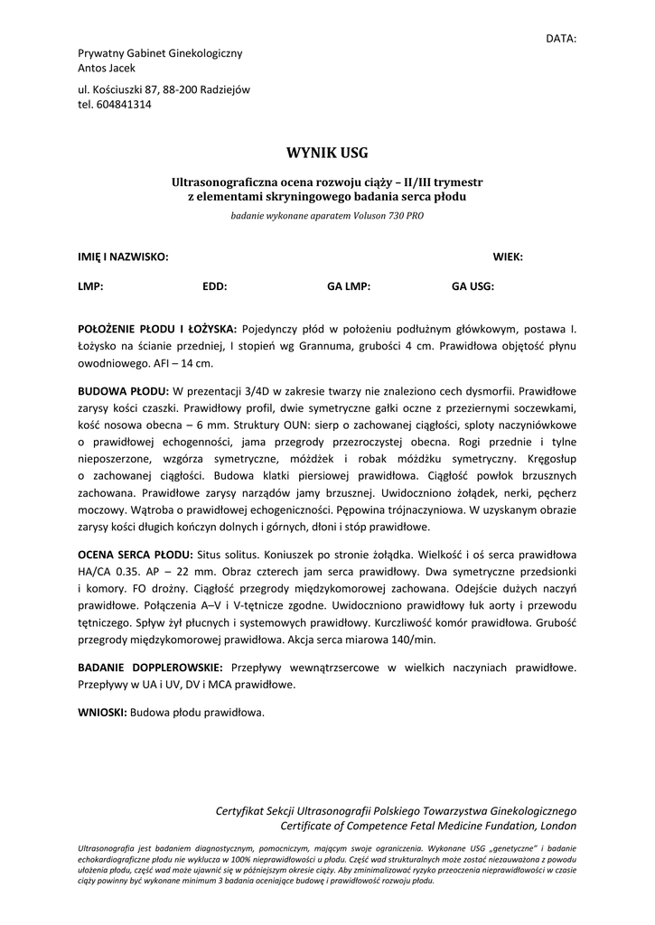 DATA: Prywatny Gabinet Ginekologiczny Antos Jacek ul. Kościuszki 87, 88-200 Radziejów tel. 604841314 WYNIK USG Ultrasonograficzna ocena rozwoju ciąży – II/III trymestr z elementami skryningowego badania serca płodu badanie wykonane aparatem Voluson 730 PRO IMIĘ I NAZWISKO: LMP: WIEK: EDD: GA LMP: GA USG: POŁOŻENIE PŁODU I ŁOŻYSKA: Pojedynczy płód w położeniu podłużnym główkowym, postawa I. Łożysko na ścianie przedniej, I stopień wg Grannuma, grubości 4 cm. Prawidłowa objętość płynu owodniowego. AFI – 14 cm. BUDOWA PŁODU: W prezentacji 3/4D w zakresie twarzy nie znaleziono cech dysmorfii. Prawidłowe zarysy kości czaszki. Prawidłowy profil, dwie symetryczne gałki oczne z przeziernymi soczewkami, kość nosowa obecna – 6 mm. Struktury OUN: sierp o zachowanej ciągłości, sploty naczyniówkowe o prawidłowej echogenności, jama przegrody przezroczystej obecna. Rogi przednie i tylne nieposzerzone, wzgórza symetryczne, móżdżek i robak móżdżku symetryczny. Kręgosłup o zachowanej ciągłości. Budowa klatki piersiowej prawidłowa. Ciągłość powłok brzusznych zachowana. Prawidłowe zarysy narządów jamy brzusznej. Uwidoczniono żołądek, nerki, pęcherz moczowy. Wątroba o prawidłowej echogeniczności. Pępowina trójnaczyniowa. W uzyskanym obrazie zarysy kości długich kończyn dolnych i górnych, dłoni i stóp prawidłowe. OCENA SERCA PŁODU: Situs solitus. Koniuszek po stronie żołądka. Wielkość i oś serca prawidłowa HA/CA 0.35. AP – 22 mm. Obraz czterech jam serca prawidłowy. Dwa symetryczne przedsionki i komory. FO drożny. Ciągłość przegrody międzykomorowej zachowana. Odejście dużych naczyń prawidłowe. Połączenia A–V i V-tętnicze zgodne. Uwidoczniono prawidłowy łuk aorty i przewodu tętniczego. Spływ żył płucnych i systemowych prawidłowy. Kurczliwość komór prawidłowa. Grubość przegrody międzykomorowej prawidłowa. Akcja serca miarowa 140/min. BADANIE DOPPLEROWSKIE: Przepływy wewnątrzsercowe w wielkich naczyniach prawidłowe. Przepływy w UA i UV, DV i MCA prawidłowe. WNIOSKI: Budowa płodu prawidłowa. Certyfikat Sekcji Ultrasonografii Polskiego Towarzystwa Ginekologicznego Certificate of Competence Fetal Medicine Fundation, London Ultrasonografia jest badaniem diagnostycznym, pomocniczym, mającym swoje ograniczenia. Wykonane USG „genetyczne” i badanie echokardiograficzne płodu nie wyklucza w 100% nieprawidłowości u płodu. Część wad strukturalnych może zostać niezauważona z powodu ułożenia płodu, część wad może ujawnić się w późniejszym okresie ciąży. Aby zminimalizować ryzyko przeoczenia nieprawidłowości w czasie ciąży powinny być wykonane minimum 3 badania oceniające budowę i prawidłowość rozwoju płodu.