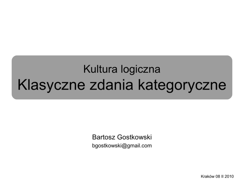 Kultura logiczna Klasyczne zdania kategoryczne Bartosz Gostkowski [email protected] Kraków 08 II 2010 Plan wykładu: Podział zdań z uwagi na funkcję logiczną operatora „jest” Zdania kategoryczne Kwadrat logiczny Konwersja, Obwersja, Kontrapozycja PODZIAŁ ZDAŃ Z UWAGI NA FUNKCJĘ OPERATORA "JEST" Słówko „jest” funkcjonuje w zdaniach na trzy różne sposoby: (i) ZDANIA EGZYSTENCJALNE: stwierdza istnienie jakiegoś obiektu; Oto jestem! Nie ma prostego sposobu rozwiązania Konfliktu Bliskowschodniego. kultura logiczna spotkanie III: ZDANIA KATEGORYCZNE PODZIAŁ ZDAŃ Z UWAGI NA FUNKCJĘ OPERATORA "JEST" Słówko „jest” funkcjonuje w zdaniach na trzy różne sposoby: (i) ZDANIA EGZYSTENCJALNE: stwierdza istnienie jakiegoś obiektu; Oto jestem! Nie ma prostego sposobu rozwiązania Konfliktu Bliskowschodniego. (ii) ZDANIA ATOMICZNE: orzeka przynależność elementu do kategorii; Leokadia jest słonicą. Didier Drogba jest wspaniałym napastnikiem. kultura logiczna spotkanie III: ZDANIA KATEGORYCZNE PODZIAŁ ZDAŃ Z UWAGI NA FUNKCJĘ OPERATORA "JEST" Słówko „jest” funkcjonuje w zdaniach na trzy różne sposoby: (i) ZDANIA EGZYSTENCJALNE: stwierdza istnienie jakiegoś obiektu; Oto jestem! Nie ma prostego sposobu rozwiązania Konfliktu Bliskowschodniego. (ii) ZDANIA ATOMICZNE: orzeka przynależność elementu do kategorii; Leokadia jest słonicą. Didier Drogba jest wspaniałym napastnikiem. (iii) ZDANIA KATEGORYCZNE: określa rodzaj relacji między klasami przedmiotów; Każdy superbohater jest na czarnej liście jakiegoś superłotra. Niektóre wieloryby są samotnikami. Żaden jedwabnik nie jest ssakiem. Niektóre zabawki nie są niebezpieczne dla dzieci. kultura logiczna spotkanie III: ZDANIA KATEGORYCZNE PODZIAŁ ZDAŃ Z UWAGI NA FUNKCJĘ OPERATORA "JEST" Cechą wyróżniającą zdań kategorycznych jest ich struktura. Każde zdanie kategoryczne można przekształcić do postaci pasującej do schematu: [K] S jest P Gdzie: (i) za S i P podstawiamy nazwy (niepuste!) (ii) zaś w miejscu [K] pojawia się któreś z następujących słówek: • Każdy [każda/ każde] • Niektóry [niektóra/ niektóre] • Żaden [żadna/ żadne/ żadni/ żadne] kultura logiczna spotkanie III: ZDANIA KATEGORYCZNE Plan wykładu: Podział zdań z uwagi na funkcję logiczną operatora „jest” Zdania kategoryczne Kwadrat logiczny Konwersja, Obwersja, Kontrapozycja ZDANIA KATEGORYCZNE Podział zdań kategorycznych: • z uwagi na kryterium jakości, wyróżniamy twierdzące lub przeczące • z uwagi na kryterium ilości, wyróżniamy ogólne lub szczegółowe zdania kategoryczne. kultura logiczna spotkanie III: ZDANIA KATEGORYCZNE ZDANIA KATEGORYCZNE Podział zdań kategorycznych: • z uwagi na kryterium jakości, wyróżniamy twierdzące lub przeczące • z uwagi na kryterium ilości, wyróżniamy ogólne lub szczegółowe zdania kategoryczne. ogólno-twierdzące SaP AFFIRMO - twierdzę OTRZYMUJEMY ZATEM ZDANIA szczegółowotwierdzące SiP ogólno-przeczące SeP NEGO- przeczę szczegółowoprzeczące kultura logiczna SoP spotkanie III: ZDANIA KATEGORYCZNE ZDANIA KATEGORYCZNE ogólno-twierdzące SaP szczegółowotwierdzące SiP ogólno-przeczące SeP szczegółowoprzeczące SoP kultura logiczna spotkanie III: ZDANIA KATEGORYCZNE ZDANIA KATEGORYCZNE ogólno-twierdzące SaP Każde S jest P. szczegółowotwierdzące SiP Niektóre S są P. ogólno-przeczące SeP Żadne S nie jest P. szczegółowoprzeczące SoP Niektóre S nie są P kultura logiczna spotkanie III: ZDANIA KATEGORYCZNE ZDANIA KATEGORYCZNE ogólno-twierdzące SaP Każde S jest P. Nie istnieje takie S, które nie jest P. szczegółowotwierdzące SiP Niektóre S są P. Istnieje S, które jest P. ogólno-przeczące SeP Żadne S nie jest P. Nie istnieje takie S, które jest P. szczegółowoprzeczące SoP Niektóre S nie są P Istnieje takie S, które nie jest P. kultura logiczna spotkanie III: ZDANIA KATEGORYCZNE Plan wykładu: Podział zdań z uwagi na funkcję logiczną operatora „jest” Zdania kategoryczne Kwadrat logiczny Konwersja, Obwersja, Kontrapozycja KWADRAT LOGICZNY WYKLUCZANIE DOPEŁNIANIE kultura logiczna spotkanie III: ZDANIA KATEGORYCZNE KWADRAT LOGICZNY p:= Edward jest głodny. WYKLUCZANIE q:= Edward jest syty. Zdania p i q wykluczają się wtw p i q nie mogą być zarazem prawdziwe Nie może być tak, że v(p)=1 i v(q)=1 (oba zdania są prawdziwe) Choć może być tak, że v(p)=0 i v(q)=0 (oba zdania są fałszywe) DOPEŁNIANIE kultura logiczna spotkanie III: ZDANIA KATEGORYCZNE KWADRAT LOGICZNY p:= Edward jest głodny. WYKLUCZANIE q:= Edward jest syty. Zdania p i q wykluczają się wtw p i q nie mogą być zarazem prawdziwe Nie może być tak, że v(p)=1 i v(q)=1 (oba zdania są prawdziwe) Choć może być tak, że v(p)=0 i v(q)=0 (oba zdania są fałszywe) p:= Część studentów poszła na piwo. q:= Część studentów nie poszła na piwo. Nie może być tak, że v(p)=0 i v(q)=0 (oba zdania są fałszywe) DOPEŁNIANIE Zdania p i q dopełniają się wtw i q nie mogą być zarazem fałszywe Choć może być tak, że v(p)=1 i v(q)=1 (oba zdania są prawdziwe) kultura logiczna spotkanie III: ZDANIA KATEGORYCZNE p KWADRAT LOGICZNY; SPRZECZNOŚĆ WYKLUCZANIE DOPEŁNIANIE Zdania p i q wykluczają się wtw p i q nie mogą być zarazem prawdziwe Zdania p i q dopełniają się wtw p i q nie mogą być zarazem fałszywe SaP SeP SiP SoP SPRZECZNOŚĆ:= WYKLUCZANIE I DOPEŁNIANIE kultura logiczna spotkanie III: ZDANIA KATEGORYCZNE KWADRAT LOGICZNY; SPRZECZNOŚĆ WYKLUCZANIE DOPEŁNIANIE Zdania p i q wykluczają się wtw p i q nie mogą być zarazem prawdziwe Zdania p i q dopełniają się wtw p i q nie mogą być zarazem fałszywe SaP SeP Niech: S:= słoń P:= ssak Wtedy: SaP:= Każdy słoń jest ssakiem. SoP:= Niektóre słonie nie są ssakami. To para zdań sprzecznych SiP SoP SPRZECZNOŚĆ:= WYKLUCZANIE I DOPEŁNIANIE kultura logiczna spotkanie III: ZDANIA KATEGORYCZNE KWADRAT LOGICZNY; SPRZECZNOŚĆ WYKLUCZANIE DOP
