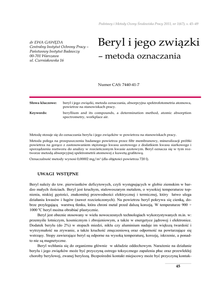 Podstawy i Metody Oceny Środowiska Pracy 2011, nr 1(67), s. 45–49 dr EWA GAWĘDA Centralny Instytut Ochrony Pracy – Państwowy Instytut Badawczy 00-701 Warszawa ul. Czerniakowska 16 Beryl i jego związki – metoda oznaczania Numer CAS: 7440-41-7 Słowa kluczowe: beryl i jego związki, metoda oznaczania, absorpcyjna spektrofotometria atomowa, powietrze na stanowiskach pracy. Keywords: beryllium and its compounds, a determination method, atomic absorption spectrometry, workplace air. Metodę stosuje się do oznaczania berylu i jego związków w powietrzu na stanowiskach pracy. Metoda polega na przepuszczeniu badanego powietrza przez filtr membranowy, mineralizacji próbki powietrza na gorąco z zastosowaniem stężonego kwasu azotowego z dodatkiem kwasu siarkowego i sporządzeniu roztworu do analizy w rozcieńczonym kwasie azotowym. Beryl oznacza się w tym roztworze metodą absorpcyjnej spektrometrii atomowej z kuwetą grafitową. Oznaczalność metody wynosi 0,00002 mg/m3 (dla objętości powietrza 720 l). UWAGI WSTĘPNE Beryl należy do tzw. pierwiastków deficytowych, czyli występujących w globie ziemskim w bardzo małych ilościach. Beryl jest kruchym, stalowoszarym metalem, o wysokiej temperaturze topnienia, niskiej gęstości, znakomitej przewodności elektrycznej i termicznej, który łatwo ulega działaniu kwasów i ługów (nawet rozcieńczonych). Na powietrzu beryl pokrywa się cienką, dobrze przylegającą warstwą tlenku, która chroni metal przed dalszą korozją. W temperaturze 900 ÷ 1000 oC beryl można obrabiać plastycznie. Beryl jest obecnie stosowany w wielu nowoczesnych technologiach wykorzystywanych m.in. w: przemyśle lotniczym, kosmicznym i zbrojeniowym, a także w energetyce jądrowej i elektronice. Dodatek berylu (do 2%) w stopach miedzi, niklu czy aluminium nadaje im większą twardość i wytrzymałość na zrywanie, a także kruchość zmęczeniową oraz odporność na powtarzające się wstrząsy. Stopy zawierające beryl są odporne na wysoką temperaturę, korozję, iskrzenie, a ponadto nie są magnetyczne. Beryl wchłania się do organizmu głównie w układzie oddechowym. Narażenie na działanie berylu i jego związków może być przyczyną ostrego toksycznego zapalenia płuc oraz przewlekłej choroby berylowej, zwanej berylozą. Bezpośredni kontakt miejscowy może być przyczyną kontak45 towego zapalenia skóry z owrzodzeniami i podskórnymi ziarniniakami. Międzynarodowa Agencja Badań nad Rakiem (IARC) w 1993 r. zakwalifikowała beryl do grupy 1. substancji kancerogennych dla ludzi. Zgodnie z polskimi przepisami beryl i jego związki także uznano za czynniki o udowodnionym działaniu rakotwórczym na człowieka. Obowiązująca w Polsce wartość najwyższego dopuszczalnego stężenia (NDS) wynosi dla berylu i jego związków nieorganicznych 0,0002 mg/m3, natomiast nie ustalona jest wartość najwyższego dopuszczalnego stężenia chwilowego (NDSCh). Przedstawiona metoda stanowi nowelizację metody oznaczania podanej w normie PN-Z-04013-3:2003. PROCEDURA ANALITYCZNA 1. Zakres stosowania metody Metodę stosuje się do oznaczania berylu i jego związków w powietrzu na stanowiskach pracy z zastosowaniem absorpcyjnej spektrometrii atomowej z kuwetą grafitową, podczas przeprowadzania kontroli warunków sanitarnohigienicznych. Najmniejsze stężenie berylu, jakie można oznaczyć w warunkach pobierania próbek powietrza i wykonania oznaczania opisanych w niniejszej procedurze, wynosi około 0,00002 mg/m3 (dla objętości pobranego powietrza 720 l). 2. Normy powołane PN-Z-04008-07:2002/Az1:2004 „Ochrona czystości powietrza. Pobieranie próbek. Zasady pobierania próbek powietrza w środowisku pracy i interpretacji wyników”. 3. Zasada metody Znaną objętość badanego powietrza przepuszcza się przez filtr membranowy w celu osadzenia na nim berylu i jego związków. Próbkę mineralizuje na płycie grzejnej w kwasie azotowym z dodatkiem kwasu siarkowego i sporządza roztwór do analizy w rozcieńczonym kwasie azotowym. Beryl w tym roztworze oznacza się metodą absorpcyjnej spektrometrii atomowej z kuwetą grafitową. 4. Wytyczne ogólne 4.1. Czystość odczynników Podczas analizy, o ile nie zaznaczono inaczej, należy stosować odczynniki o stopniu czystości co najmniej cz.d.a. oraz wodę podwójnie destylowaną, zwaną wodą w dalszej części procedury. 4.2. Naczynia laboratoryjne W analizie należy używać wyłącznie naczyń laboratoryjnych ze szkła borowo-krzemowego lub polietylenu, a do mineralizacji filtrów – zlewek teflonowych. Naczynia należy myć kolejno roztworem detergentu, ciepłą wodą, roztworem kwasu azotowego o c(HNO3) = 1 mol/l, wodą destylowaną, a następnie kilkakrotnie płukać wodą. 46 4.3. Przechowywanie roztworów Roztwory wzorcowe berylu należy przechowywać w naczyniach z polietylenu. 4.4 Postępowanie z substancjami chemicznymi Wszystkie czynności ze stężonymi kwasami należy wykonywać w odzieży ochronnej i pod sprawie działającym wyciągiem laboratoryjnym. Pozostałe po analizie roztwory odczynników i wzorców należy gromadzić w przeznaczonych do tego celu pojemnikach i przekazywać je uprawnionym instytucjom do unieszkodliwienia. 5. Odczynniki, roztwory i materiały 5.1. Argon sprężony Stosować argon sprężony o stopniu czystości wg instrukcji do aparatu. 5.2. Kwas azotowy(V) Stosować kwas azotowy stężony, 65-procentowy (m/m) o d = 1,42 g/ml. 5.3. Kwas azotowy(V), roztwór Stosować kwas azotowy(V), roztwór o stężeniu c(HNO3) = 0,1 mol/l. 5.4. Kwas siarkowy(VI) Stosować kwas siarkowy(VI) stężony, o ułamku masowym 98%, o d = 1,84 g/ml. 5.5. Roztwór wzorcowy podstawowy berylu Stosować dostępny w handlu roztwór wzorcowy berylu do absorpcji atomowej o stężeniu 1 mg/ml. 5.6. Roztwór wzorcowy pośredni I berylu Do kolby pomiarowej o pojemności 100 ml odmierzyć 1 ml roztworu wzorcowego podstawowego wg punktu 5.5., następnie uzupełnić do kreski roztworem kwasu azoto