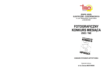 ZESPÓŁ SZKÓŁ ELEKTRYCZNO – ELEKTRONICZNYCH im. prof. Maksymiliana Tytusa Hubera w SZCZECINIE FOTOGRAFICZNY KONKURS MIESIĄCA ZSEE / TME KONKURS FOTOGRAFII ARTYSTYCZNEJ Organizator konkursu: dr inż. Dariusz MOSTOWSKI § 7 Uczestnictwo w konkursie jest bezpłatne. § 8 Każde zdjęcie powinno być czytelnie opisane na odwrocie w następujący sposób (najlepiej drukowanymi literami): imię i nazwisko autora, klasa oraz ewentualny tytuł zdjęcia. Zestawy prac powinny być jasno oznaczone, a prace w zestawie ponumerowane zgodnie z zamierzeniem autora. Prace nie opisane, niezgodne z Tematem Miesiąca lub w nieodpowiednim formacie nie będą brały udziału w konkursie. § 9 Oceny prac dokona Jury powołane przez organizatora, złożone z fotografików i humanistów. § 10 W swoich wyborach Jury kierowało się będzie przede wszystkim nowatorskim i oryginalnym ujęciem tematu przez fotografa. Czekamy na fotografie niebanalne, niecodzienne. Szukamy zdjęć wyjątkowych pod względem kompozycji a jednocześnie dobrych pod względem technicznym. Liczymy na pomysłowość, pracowitość i dojrzałość autorów. R E G U L A M I N FOTOGRAFICZNEGO KONKURSU MIESIĄCA ZSEE/TME KONKURS FOTOGRAFII ARTYSTYCZNEJ § 1 Pomysłodawcą oraz organizatorem konkursu jest dr inż. Dariusz Mostowski. Konkurs organizowany jest przy współudziale Dyrekcji Zespołu Szkół Elektryczno-Elektronicznych im. prof. M.T. Hubera w Szczecinie, ul. Racibora 60/61, 71-631 Szczecin. § 2 W konkursie mogą brać udział wszyscy, aktualni uczniowie Zespołu Szkół Elektryczno-Elektronicznych w Szczecinie. § 3 Celem każdego Konkursu Miesiąca jest wyłonienie najlepszej „Fotografii Miesiąca ZSEE/TME”. Spośród wszystkich „Fotografii Miesiąca” raz w roku szkolnym, w czerwcu wybierana jest „Fotografia Roku ZSEE /TME” oraz przyznawane Grand Prix Konkursu Miesiąca. § 4 Konkurs rozgrywany jest w cyklu miesięcznym, w miesiącach od września do maja danego roku szkolnego. Każdego miesiąca obowiązuje inny, podany z wyprzedzeniem przez organizatora temat konkursu – tzw. Temat Miesiąca. § 5 Do udziału w konkursie należy zgłaszać fotografie wykonane w dowolnej technice, w postaci odbitek fotograficznych czarnobiałych lub kolorowych w formacie nie mniejszym niż 15 × 21 cm. (15 × 15 cm w przypadku kadru kwadratowego). § 6 Każdy uczestnik może zgłosić do udziału w konkursie w danym miesiącu do 5 prac. Zestawy zdjęć będą traktowane jako jedna praca (maksymalnie do 5 zdjęć w zestawie). § 11 Spośród zgłoszonych w danym miesiącu fotografii Jury wyłoni najlepszą fotografię, która otrzyma tytuł „Fotografii Miesiąca”. Jury wedle uznania może przyznać także nagrody II i III oraz wyróżnienia. W przypadku niskiego poziomu zgłoszonych prac lub małej liczby autorów istnieje możliwość nie przyznania nagrody. § 12 Fotografie nie nagrodzone w danej edycji Konkursu Miesiąca będą do odebrania przez autorów w sekretariacie ZSEE za okazaniem legitymacji. § 13 Werdykt Jury jest ostateczny. § 14 Wszystkim autorom nagrodzonych i wyróżnionych prac zostaną wręczone dyplomy. Autor „Fotografii Miesiąca” oprócz dyplomu, jako nagrodę otrzyma na własność swoją fotografię w postaci odbitki w formacie wystawowym 30 × 45 dodatkowo oprawioną w passepartout. § 15 W miesiącu czerwcu, spośród wszystkich „Fotografii Miesiąca” nagrodzonych w poszczególnych edycjach konkursu zostanie wyłoniona najlepsza praca, otrzymując tytuł „Fotografii Roku” oraz Grand Prix Konkursu Miesiąca. Autor „Fotografii Roku” otrzyma cenną nagrodę rzeczową ufundowaną przez Dyrekcję ZSEE oraz Radę Rodziców. § 16 Wszystkie nagrodzone w danym roku szkolnym fotografie w poszczególnych Konkursach Miesiąca wezmą udział w zbiorowej dorocznej wystawie fotografii zorganizowanej w ZSEE. Wystawa może być również prezentowana poza szkołą. • Prezentacja nagrodzonych i wyróżnionych prac w danym miesiącu – do 14-ego dnia miesiąca następnego, w gablotach vis a vis pracowni nr 6. • Wręczenie GrandPrix Konkursu Miesiąca dla autora „Fotografii Roku” – podczas uroczystości zakończenia roku szkolnego. • Ekspozycja dorocznej wystawy wszystkich „Fotografii Miesiąca” oraz prac nagrodzonych i wyróżnionych – przez cały następny rok szkolny w ZSEE. § 18 Organizator zastrzega sobie prawo do eksponowania wyróżnionych i nagrodzonych w Konkursach Miesiąca fotografii w innych miejscach niż wymienione powyżej w celu promocji szkoły oraz propagowania idei konkursu, z zachowaniem informacji o autorach prezentowanych prac. § 19 Odpowiednio zabezpieczone, najlepiej w usztywnionej kopercie fotografie z załączonym podpisanym niniejszym regulaminem konkursu należy składać w sekretariacie ZSEE do ostatniego dnia danego miesiąca. Na kopercie należy umieścić swoje imię i nazwisko, klasę oraz napis „Konkurs Miesiąca”. § 20 Zgłaszając prace do udziału w konkursie autor tym samym akceptuje niniejszy regulamin, a także stwierdza, iż wszystkie zgłoszone przez niego prace są jego autorstwa. Niedopuszczalne jest zgłoszenie do udziału w konkursie fotografii cudzego autorstwa. Dodatkowych informacji o konkursie udziela organizator dr inż. Dariusz Mostowski, pracownia Technik Cyfrowych nr 6, ZSEE. Ponadto szczegóły dotyczące konkursu można odnaleźć w gablotach vis a vis pracowni Technik Cyfrowych nr 6, ZSEE. Regulamin Fotograficznego Konkursu Miesiąca dostępny jest w sekretariacie ZSEE oraz w wersji elektronicznej na stronie internetowej szkoły www.tme.szczecin.pl. Po zapoznaniu się z regulaminem „Fotograficznego Konkursu Miesiąca ZSEE/TME” akceptuję jego warunki. Jednocześnie potwierdzam, że JESTEM AUTOREM zgłoszonych prac. § 17 Terminarz konkursu: • Składanie prac konkursowych – do ostatniego dnia danego miesiąca, w sekretariacie ZSEE; • Ogłoszenie wyników Konkursu Miesiąca i wręczenie nagrody – do 14-ego d