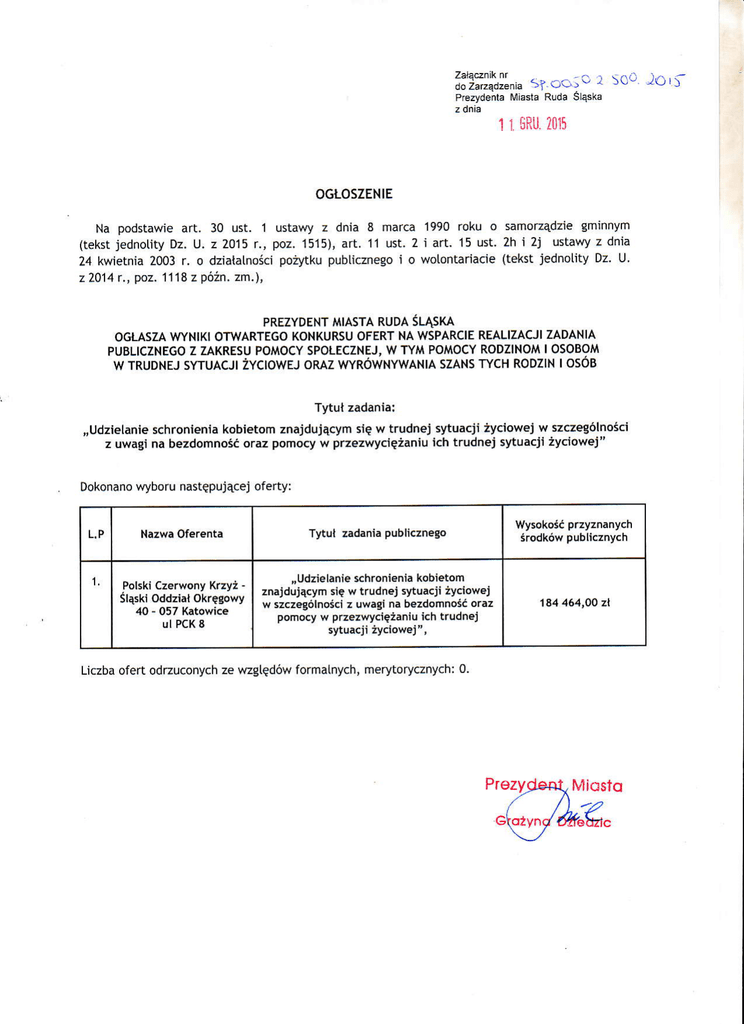 z a a e n | k^ | Ą\!^l\ < Jwd a ż a ż ą d z e ń |sal o c j " PrezydenlaMias|a Ruda sląska |^'. lL,!) 2015 1 1.tjRU. OGLOSZENIE Na podstawieart. 30 ust. 1 ustawy z dnia 8 marca 1990 roku o samorfądfjegminnym (tekstjednotityDz. U. z f015 r., poz. 1515),art. 11 ust.2iart. 15 ust. 2h i 2i ustawyz dnia połtku publicznegoi o wotontańacie(tekst jednoLjtyDz. U. 24 kwietnia2oo3 r. o dzialatnoścj z f014 t ,, poz. 1118z póżn.zm,), PREzYoENTM|ASTARUDAŚLĄSKA OGLASZAWYNIKTOTWARTEGOKONKURSUOFERTNA WSPARCIEREALIZACJIZADANIA I OSOBOM Z ZAKRESUPOMOCYSPOLECZNEJ,W TYM POMOCYRODZINOM PUBLICZNEGO I osoB TYCH RoDz|N szANs oRAz WYRÓWNYWAN|A W TRUDNEJSYTUACJ|ŹYc|owEJ Tytułzadania: ''udzielanieschronieniakobietomznaJduiącymsię w trudnej sytuacii życiowejw sfczególności oraz pomocyw przezwyciężanluich trudnej sytuacji życiowei,, z uwagina bezdomność następującejoferty: ookonanowryboru L.P 'I NazwaOferenta Tytuł zadaniapub|iczne8o wysokość Przyznanych środkówpublicznych Po|skiczerwony Krfyź. s|ąskioddziałokrę8owy 40. 057 rótowice ul PCK8 ..lJdzielanleschronieniakobietom znajdującymsię w trudnei sytuacj|źyciowei oraz w szczegó|ności z uwagina bezdomność pomocyw Przezwycjężaniu ich trudnej sytuacjiżyciowej''' 184 464,00zl 0. Ljczbaofert odEuconychze wfgtędówformalnych'merytorycznych: PIozyJ'e.AĘMiasto "C,,"/&"ś"