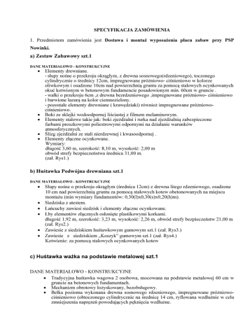 SPECYFIKACJA ZAMÓWIENIA 1. Przedmiotem zamówienia jest Dostawa i montaż wyposażenia placu zabaw przy PSP Nowinki. a) Zestaw Zabawowy szt.1 DANE MATERIAŁOWO - KONSTRUKCYJNE • Elementy drewniane. - słupy nośne o przekroju okrągłym, z drewna sosnowego(rdzeniowego), toczonego cylindrycznie o średnicy 12cm, impregnowane próżniowo- ciśnieniowo w kolorze oliwkowym i osadzone 10cm nad powierzchnią gruntu za pomocą stalowych ocynkowanych okuć kotwionym w betonowym fundamencie posadowionym min. 60cm w gruncie . - wałki o przekroju 6cm ,z drewna bezrdzeniowego ,impregnowane próżniowo- ciśnieniowo i barwione lazurą na kolor ciemnozielony. - pozostałe elementy drewniane ( krawędziaki) również impregnowane próżniowociśnieniowo. • Boki ze sklejki wodoodpornej liściastej z filmem melaminowym. • Elementy stalowe takie jak: boki zjeżdżalni i rurka nad zjeżdżalnią zabezpieczone farbami proszkowymi poliestrowymi odpornymi na działanie warunków atmosferycznych. • Ślizg zjeżdżalni ze stali nierdzewnej i kwasoodpornej . • Elementy złączne ocynkowane. Wymiary: długość 3,60 m, szerokość: 8,10 m, wysokość: 2,00 m obwód strefy bezpieczeństwa średnica 31,00 m. (zał. Rys1.) b) Huśtawka Podwójna drewniana szt.1 DANE MATERIAŁOWO - KONSTRUKCYJNE • Słupy nośne o przekroju okrągłym (średnica 12cm) z drewna litego rdzeniowego, osadzone 10 cm nad powierzchnią gruntu za pomocą stalowych kotew obetonowanych na miejscu montażu (min wymiary fundamentów: 0,30(l)x0,30(s)x0,20(h)m). • Siedziska z atestem. • Łańcuchy zawiesi siedzisk i elementy złączne ocynkowane. • Łby elementów złącznych osłonięte plastikowymi korkami. długość 1,92 m, szerokość: 3,23 m, wysokość: 2,26 m, obwód strefy bezpieczeństw 21,00 m (zał. Rys2.) • Zawiesie z siedziskiem huśtawkowym gumowym szt.1 (zał. Rys3.) • Zawiesie z siedziskiem „Koszyk" gumowym szt.1 (zał. Rys4.) Kotwienie: za pomocą stalowych ocynkowanych kotew c) Huśtawka ważka na podstawie metalowej szt.1 DANE MATERIAŁOWO - KONSTRUKCYJNE • Tradycyjna huśtawka wagowa 2 osobowa, mocowana na podstawie metalowej 60 cm w gruncie na betonowych fundamentach. • Mechanizm obrotowy łożyskowany, bezobsługowy. • Belka pozioma wykonana drewna sosnowego rdzeniowego, impregnowane próżniowociśnieniowo (obtoczonego cylindrycznie na średnicę 14 cm, ryflowana wzdłużnie w celu zmniejszenia naprężeń powodujących pęknięcia wzdłużne. • • • • • Siedziska huśtawki i stelaż rączek wykonane ze sklejki wodoodpornej liściastej z filmem melaminowym Zamocowane na końcach belki gumowe odbojniki amortyzujące. Podstawa huśtawki wykonana z giętych pospawanych rur, spoiny i krawędzie załagodzone. Wszystkie elementy metalowe zabezpieczone antykorozyjnie poprzez malowanie proszkowe. Elementy złączne ocynkowane. Poszczególne elementy wyrobu połączone ocynkowanymi elementami złącznymi osłoniętymi plastikowymi korkami z zaślepkami długość 3,00 m, szerokość: 0,54 m obwód strefy bezpieczeństwa 13,5 m (zał.Rys5.) d) Karuzela trójramienna szt.1 • Podstawa karuzeli (konstrukcja spawana z rur i prętów), w dolnej części stanowi zbrojenie betonowego bloczka z betonu minimum B15, posadowionego w gruncie na głębokości 40 cm. • Do rury podstawy wspawany wał, na którym umieszczone są łożysko kulkowe i 2 łożyska stożkowe. • Ruchomy krzyżak karuzeli wykonany z rury Ø108 mm (obudowa łożysk) oraz 4-ech poziomych rur Ø 89 mm z przyspawanymi płaskownikami do przykręcenia gumowych siedzisk z atestem oraz z wykonanych z rur Ø 26,9 mm oparć. • Elementy wykonane ze stali zabezpieczone antykorozyjnie lakierem proszkowym poliestrowym do warunków zewnętrznych. • Elementy złączne ocynkowane i osłonięte plastikowymi korkami. Wykonanie i montaż z zachowaniem norm PN-EN 1176:2009 W cenie należy uwzględnić koszt dostawy i montażu. Montaż nastąpi w miejscowości Nowinki Gmina Jadów. 2. Zamawiający nie dopuszcza składania ofert częściowych. 3. Zamawiający nie dopuszcza składania ofert wariantowych. 4. Termin wykonania przedmiotu zamówienia – do 15 sierpnia 2014 r. 5. Warunki udziału w postępowaniu – złożenie dokumentów wymienionych w pkt. 6 specyfikacji. 6. Dokumenty, jakie mają dostarczyć wykonawcy: a) wypełniony druk „Oferta”, stanowiący załącznik nr 1 do niniejszej specyfikacji. 7. Pracownikiem zamawiającego uprawnionym do bezpośredniego kontaktowania się z wykonawcami jest: Pobudkiewicz Patryk – pokój nr 17, tel. (25) 675 40 44 wew. 47 8. Oferty należy dostarczyć w terminie do dnia 11.07.2014 r. godz.1500. Oferty powinny być dostarczone faksem na nr (25) 675 43 84, przesyłką pocztową lub osobiście. 9. Sposób obliczania ceny: cenę należy podać w formie ryczałtu, którego definicję określa art. 632 kodeksu cywilnego. 10. Rozliczenia pomiędzy zamawiającym a przyszłym wykonawcą odbywać będą się w złotych polskich. Dane Gminy Jadów do faktury: Gmina Jadów, ul. Jana Pawła II 17, 05-280 Jadów, Nr NIP 125-13-34-791. Płatność dokonana będzie w ciągu 14 dni na podstawie złożonej faktury na konto bankowe Wykonawcy po stwierdzeniu prawidłowości wykonania zamówienia przez odpowiedzialnego pracownika UG Jadów. 11. Kryterium wyboru oferty najkorzystniejszej będzie cena – 100%. 12. Z Wykonawcą, który złoży najkorzystniejszą ofertę zostanie podpisana umowa. 13. Postępowanie prowadzone jest na podstawie Zarządzenia nr 7/2009 Wójta Gminy Jadów z dnia 23 stycznia 2009 r. w sprawie wprowadzenia regulaminu udzielania zamówień publicznych o wartości nieprzekraczającej kwoty wyrażonej w złotych równowartości 14 000 euro netto.(30 000 tys. po zmianie ustawy). Jadów, 2 lipca 2014 r.