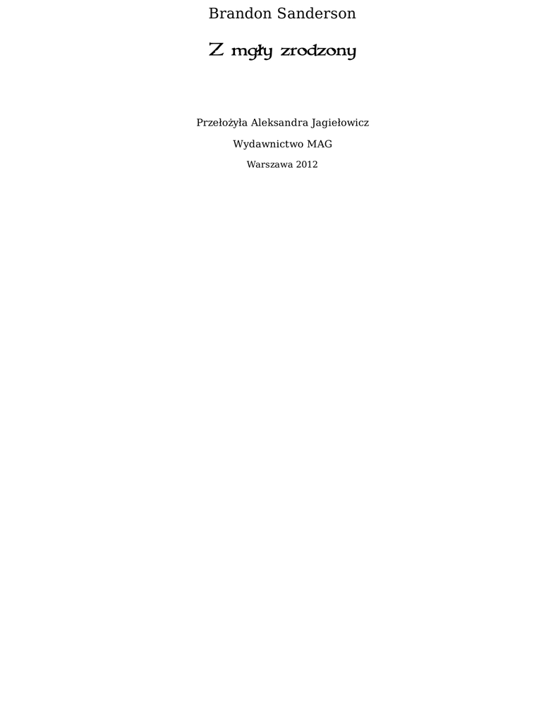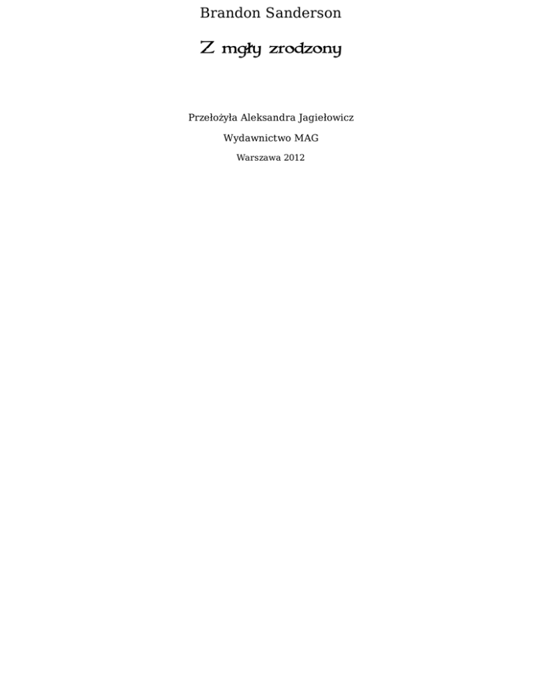 Brandon Sanderson Z mgły zrodzony Przełożyła Aleksandra Jagiełowicz Wydawnictwo MAG Warszawa 2012 Niniejsza darmowa publikacja zawiera jedynie fragment pełnej wersji całej publikacji. Aby przeczytać ten tytuł w pełnej wersji kliknij tutaj. Niniejsza publikacja może być kopiowana, oraz dowolnie rozprowadzana tylko i wyłącznie w formie dostarczonej przez NetPress Digital Sp. z o.o., operatora sklepu na którym można nabyć niniejszy tytuł w pełnej wersji. Zabronione są jakiekolwiek zmiany w zawartości publikacji bez pisemnej zgody NetPress oraz wydawcy niniejszej publikacji. Zabrania się jej od-sprzedaży, zgodnie z regulaminem serwisu. Pełna wersja niniejszej publikacji jest do nabycia w sklepie internetowym Bookarnia Online. Tytuł oryginału: Mistborn Copyright © 2006 by Brandon Sanderson Copyright for the Polish translation © 2008 by Wydawnictwo MAG Redakcja: Urszula Okrzeja Korekta: Magdalena Górnicka Ilustracja na okładce: Damian Bajowski Opracowanie graficzne okładki: Irek Konior Projekt typograficzny, skład i łamanie: Tomek Laisar Fruń ISBN 978-83-7480-316-8 Wydanie II Wydawca: Wydawnictwo MAG ul. Krypska 21 m. 63, 04-082 Warszawa tel./fax 22 813 47 43 e-mail: [email protected] http://www.mag.com.pl Konwersja: NetPress Digital Sp. z o.o. Czasem martwię się, że nie jestem tym bohaterem, za którego wszyscy mnie mają. Filozofowie zapewniają mnie, że to właściwy czas, że pojawiły się wszystkie znaki. Wciąż jednak zastanawiam się, czy nie mylą się co do człowieka. Tylu ludzi jest ode mnie zależnych. Powiadają, że trzymam w ramionach los całego świata. Co by powiedzieli, gdyby się dowiedzieli, że ich obrońca – Bohater Wieków, ich zbawca – wątpi sam w siebie? Może nie byliby wcale zaskoczeni. Właściwie to mnie martwi najbardziej. Może w głębi serca zastanawiają się – tak samo jak ja. Czy kiedy na mnie spojrzą, zobaczą kłamcę? PROLOG Z nieba sypał się popiół. Lord Tresting zmarszczył brwi, podnosząc wzrok na ciemne, południowe niebo, podczas gdy jego służący pospieszyli z parasolem, by osłonić nim lorda i jego dostojnego gościa. Popiół lecący z nieba nie był aż tak niezwykłym zjawiskiem w Ostatecznym Imperium, ale Tresting miał nadzieję, że uniknie czarnych plam sadzy na swej nowej kamizelce i czerwonej kurtce, które właśnie przybyły barką aż z Luthadelu. Na szczęście nie było wiatru – parasol powinien wystarczyć. Tresting i jego gość stali na patio, znajdującym się na niewielkim wzgórku ponad polami. W opadającym popiele pracowały setki ludzi, odzianych w brunatne kaftany, usiłując ochronić zbiory. Ich ruchy były leniwe i powolne, ale oczywiście to normalne u skaa. Chłopi byli nieruchawą, nieproduktywną bandą. Oczywiście, nigdy się nie skarżyli, wiedzieli, że im się to nie opłaca. Po prostu pracowali zgarbieni, krzątając się cicho i apatycznie. Świszczący obok pejcz ekonoma na chwilę budził ich do żywszych działań, ale skoro tylko nadzorca przeszedł, wracali do poprzedniego, leniwego tempa. – Ktoś mógłby pomyśleć, że tysiąc lat pracy w polu wystarczy, aby nabrali choć trochę wprawy – zwrócił się Tresting do mężczyzny, stojącego obok niego. Obligator spojrzał na niego i uniósł brew. Grymas ten podkreślił jego najbardziej wyrazisty rys twarzy – skomplikowane tatuaże, które drobną koronką okalały oczy. Tatuaże były rozległe, sięgały od czoła i obejmowały oba policzki. Był pełnym prelanem – naprawdę ważnym obligatorem. Tresting miał w posiadłości własnych, osobistych obligatorów, ale byli to jedynie pośledni funkcjonariusze, z niewielu znakami wokół oczu. Ten człowiek przypłynął z Luthadel na tej samej barce, którą przybył nowy strój Trestinga. – Powinieneś widzieć skaa z miasta, Tresting – odparł obligator, spoglądając znowu na robotników skaa. – Ci są całkiem pilni, w porównaniu z ich braćmi z Luthadelu. Masz nad nimi bardziej... bezpośrednią kontrolę. Jak ci się zdaje, ilu stracisz w tym miesiącu? – Och, pół tuzina, albo trochę więcej – odparł Tresting. – Kilku po chłoście, kilku ze zmęczenia. – Ucieczki? – Nigdy! – odparł Tresting. – Kiedy odziedziczyłem ziemię po ojcu, miałem kilka ucieczek, ale zlikwidowałem rodziny uciekinierów. Pozostałym szybko przeszła ochota. Nigdy nie rozumiałem ludzi, którzy mieli problemy ze swoimi skaa... uważam, że te istoty łatwo kontrolować, jeśli okaże się odpowiednią stanowczość. Obligator skinął głową i stał w milczeniu, spowity szarą szatą. Wydawał się zadowolony – bardzo dobrze. Skaa nie byli tak naprawdę własnością Trestinga. Podobnie jak wszyscy inni skaa, należeli do Pana Władyki. Tresting jedynie wypożyczał pracowników od swego Boga, tak samo, jak płacił za usługi swych obligatorów. Obligator spojrzał w dół, sprawdzając czas na kieszonkowym zegarku, po czym podniósł wzrok na słońce. Pomimo deszczu popiołu słońce jasno świeciło na niebie, wyzierając jaskrawoczerwoną tarczą zza dymnej ciemności nieba. Tresting wyjął chusteczkę i otarł czoło, wdzięczny za cień parasola, osłaniający go przed południowym upałem. – Doskonale, Tresting – rzekł obligator. – Przekażę twoją propozycję lordowi Venture, tak jak sobie tego życzysz. Dostanie ode mnie przychylne sprawozdanie z twoich działań. Tresting pohamował westchnienie ulgi. Obligator był obowiązkowym świadkiem w każdej transakcji i przy zawieraniu umów przez szlachtę. Oczywiście, świadkami mogli być pośledniejsi obligatorzy, tacy jakich zatrudniał Tresting, ale wywarcie wrażenia na osobistym obligatorze Straffa Venture znaczyło o wiele więcej. Obligator spojrzał na niego. – Dziś po południu wracam kanałem. – Tak szybko? – zapytał Tresting. – Nie zostaniesz na kolacji? – Nie – odrzekł obligator. – Choć jest jeszcze jedna sprawa, którą chciałbym p