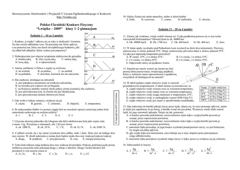 Stowarzyszenie Absolwentów i Przyjaciół V Liceum Ogólnokształcącego w Krakowie http://lwiatko.org 10. Gdyby Ziemia nie miała atmosfery, niebo w dzień byłoby A. białe, B. czerwone, C. czarne, D. niebieskie, Polsko-Ukraiński Konkurs Fizyczny “Lwiątko – 2009” klasy 1–2 gimnazjum Zadania 11 – 20 za 4 punkty Zadania 1 – 10 za 3 punkty 11. Ziemia, jak wiadomo, wiruje wokół własnej osi. Z jaką prędkością porusza się w tym ruchu wierzchołek Kilimandżaro? Obwód Ziemi to ok. 40000 km. A. Ok. 40000 km/h. B. Ok. 1700 m/s. C. Ok. 460 km/h. D. Ok. 460 m/s. E. Zero. 1. Konkurs „Lwiątko” odbywa się co roku w okolicach 1 kwietnia. Na obu osiach odkładamy czas. Na poziomej ten, który upływa, a na pionowej ten, który nas dzieli od najbliższego konkursu, jaki się odbył lub odbędzie. Który wykres jest poprawny? 12. W letnie upały, na działce pod Pułtuskiem Leon wystawił na dwór dwa termometry. Pierwszy, umieszczony w cieniu, pokazał 35ºC. Drugi, umieszczony pół metra dalej w słońcu, pokazał 55ºC. To jaka jest naprawdę temperatura powietrza? A. W cieniu 35ºC, a w słońcu 55ºC. B. I w cieniu, i w słońcu 35ºC. C. I w cieniu, i w słońcu 45ºC. D. I w cieniu, i w słońcu 55ºC. E. Odpowiedź zależy od prędkości wiatru. 2. Niebezpiecznie jest włączać urządzenie elektryczne do gniazdka A. brudną ręką, B. zbyt czystą ręką, C. mokrą ręką, D. lewą ręką, E. w rękawiczkach. 3. Anteny satelitarne w Polsce z reguły są zwrócone A. na wschód, B. na północ, C. na zachód, D. na południe, E. dowolnie, kierunek nie ma znaczenia. D. objętość, E. temperatura. 6. Ile maksymalnie śladów (w postaci ciągłej linii na szerokość opony) zostawiają mokre koła samochodu osobowego na suchym asfalcie? A. 1. B. 2. C. 3. D. 4. E. 5. 7. Używana dawniej jednostka siły kilogram-siła (kG) zdefiniowana była jako ciężar ciała o masie 1 kg. Wyrażona w niutonach, siła 1 kG jest równa A. ok. 1000 N, B. ok. 10 N, C. 1 N, D. ok. 0,1 N, E. ok. 0,001 N. 8. Z jabłoni urwały się z tej samej wysokości dwa jabłka, małe i duże. Duże jest od małego dwa razy cięższe. W chwili uderzenia o ziemię duże będzie miało dwa razy większą/większe/większy A. drogę, B. prędkość, C. przyspieszenie, D. czas, E. energię kinetyczną. 9. Tylne koła traktora mają średnicę dwa razy większą niż przednie. Podczas godzinnej jazdy prostą asfaltową szosą koła tylne pokonują drogę s, robiąc n obrotów. Droga i liczba obrotów kół przednich w tym samym czasie to A. 2s, 2n, B. s, 4n, C. s, 2n, D. s, n, E. s, n/2. 13. Samolot po starcie wznosi się stromo po linii prostej (linia przerywana), zwiększając prędkość. Który z wektorów może reprezentować wypadkową wszystkich sił działających na samolot? © Copyright by SAiP V LO Kraków 4. Siła ciężkości, działająca na odważnik A. jest jednakowa niezależnie od wielkości odważnika, B. na równiku jest większa niż na biegunie, C. na Księżycu miałaby wartość około jednej szóstej ziemskiej siły ciężkości, D. jest spowodowana tym, że Ziemia nie jest idealną kulą, E. jest spowodowana ruchem obrotowym Ziemi. 5. Gdy woda w kałuży zamarza, zwiększa się jej A. ciężar, B. gęstość, C. ciśnienie, E. złociste. 14. W tabeli podano ciepło właściwe wody w czterech przykładowych temperaturach. Z tabeli można wywnioskować, że A. ciepło właściwe wody wzrasta wraz ze wzrostem temperatury, B. ciepło właściwe wody maleje wraz ze wzrostem temperatury, C. ciepło właściwe wody osiąga minimum w temperaturze 25ºC, D. ciepło właściwe wody w zaokrągleniu wynosi 4200 J/(kg·ºC), E. ciepło właściwe wody jest znane w sposób bardzo niedokładny. Temp. 0ºC 25ºC 50ºC 100ºC Ciepło właściwe 4221,9 J/(kg·ºC) 4175,4 J/(kg·ºC) 4178,4 J/(kg·ºC) 4212,3 J/(kg·ºC) 15. Gdy nalewamy do butelki jakiejś cieczy przez lejek, zdarza się, że ciecz przestaje spływać, mimo że lejek jest napełniony aż po brzeg, a butelka wciąż nie jest pełna. Wystarczy wtedy lekko unieść lejek, by jego zawartość spłynęła. Dzieje się tak, ponieważ A. w butelce powstało podciśnienie; rozszczelnienie styku lejka z szyjką butelki pozwala je usunąć, przez wpuszczenie powietrza, B. w butelce powstało nadciśnienie; rozszczelnienie styku lejka z szyjką butelki pozwala je usunąć, przez wypuszczenie powietrza, C. uniesienie lejka powoduje, że jego koniec wychodzi ponad poziom cieczy, co jest konieczne, by mogła ona dalej spływać, D. gdy szyjka lejka jest nieruchoma, ciecz klinuje się w niej i dopiero przez potrząśnięcie ulega odblokowaniu, E. uniesienie lejka powiększa wysokość słupa cieczy w lejku, przez co zwiększa się jej ciśnienie. 16. Jeden paskal to inaczej A. 1 kg , m s B. 1 kg , m2 s C. 1 kg , m s2 D. 1 kg , m s2 2 E. 1 kg 2 . m s 17. Po równoległych pasach ruchu jadą trzy samochody. Samochód P względem samochodu Q porusza się z prędkością o wartości 50 km/h, samochód Q P względem samochodu R porusza się z prędkością o wartości 30 km/h. Jaką wartość ma prędkość samochodu R względem P? A. 80 km/h. B. 40 km/h. C. 20 km/h. Q D. Możliwe, że 80 km/h i możliwe, że 20 km/h. E. Możliwe, że 40 km/h i możliwe, że 10 km/h. 24. Przy dobrej pogodzie, w astronomiczne południe, Słońce widzimy na niebie dokładnie na południu A. codziennie na całej kuli ziemskiej, B. codziennie na całej półkuli północnej, C. codziennie między 23,5 a 66,5 szerokości północnej, D. codziennie między 66,5 szerokości południowej a 66,5 szerokości północnej, E. na całej półkuli północnej, ale tylko w dniu przesilenia letniego (ok. 22 czerwca). 18. Prędkość fal na płytkiej wodzie wyraża się jednym z podanych niżej wzorów (g – przyspieszenie ziemskie, h – głębokość zbiornika z wodą). Którym? 25. Punkt na obrzeżu koła pewnego pojazdu porusza się podczas jazdy po linii pokazanej na rysunku. K