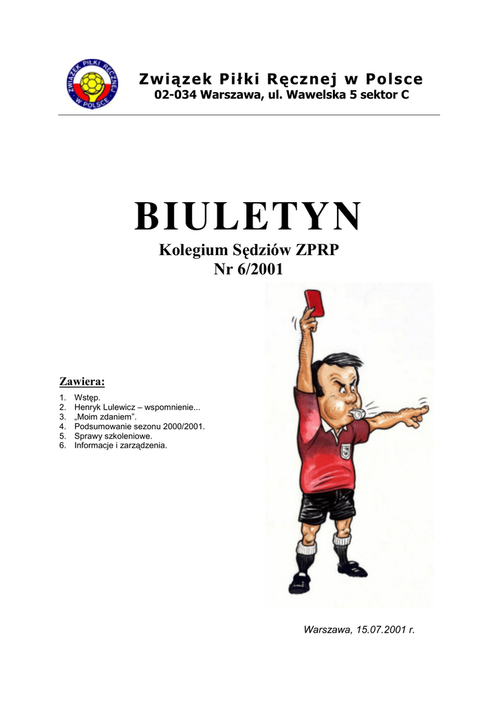Związek Piłki Ręcznej w Polsce 02-034 Warszawa, ul. Wawelska 5 sektor C `gsjcrwl Kolegium Sędziów ZPRP Nr 6/2001 Zawiera: 1. 2. 3. 4. 5. 6. Wstęp. Henryk Lulewicz – wspomnienie... „Moim zdaniem”. Podsumowanie sezonu 2000/2001. Sprawy szkoleniowe. Informacje i zarządzenia. Warszawa, 15.07.2001 r. Szanowne Koleżanki ! Szanowni Koledzy ! Znaczne opóźnienie wydania tego biuletynu spowodowane zostało próbą połączenia przekazania niniejszego materiału łącznie z nowymi przepisami gry, które będą obowiązywały od 1 sierpnia bieżącego roku. Niestety, bardzo późno otrzymane materiały źródłowe z Międzynarodowej Federacji Piłki Ręcznej, z informacją o możliwych ich dalszych modyfikacjach, znacznie opóźniło oddanie ostatecznego tekstu przepisów do druku. W tej sytuacji zdecydowałem się wysłać biuletyn informacyjny, a egzemplarze przepisów dosłać do wszystkich zainteresowanych nieco później. W ciągu najbliższych dwóch tygodni, nowe przepisy w cenie 15,- za jeden egzemplarz, zostaną przesłane przez biuro ZPRP do wszystkich sędziów i delegatów. Należność za przepisy proszę uregulować podczas najbliższej kursokonferencji. Biuletyn ten traktuje m.in. o sprawach minionego sezonu, ale w szczególny sposób także o czasie minionym. Ze smutkiem przyjąłem wiadomość o śmierci Kolegi Henryka Lulewicza, z którym przez wiele lat spotykałem się na kursokonferencjach i ligowych boiskach. Wspomnienie o Henryku, napisane piórem Jego przyjaciela Marka Musiała, zamieszczamy w dalszej części biuletynu. Czas czynnego sędziowania upłynął dla sympatycznych Kolegów Krzysztofa Manysia i Antoniego Leji, którzy ukończywszy „wstydliwy” dla sędziego wiek, rozstali się z ligowymi boiskami. W biuletynie znajdziecie wstępne podsumowanie sezonu (końcowe podamy podczas kursokonferencji) oraz liczne publikacje, których autorami są trenerzy i sędziowie. Miło mi powitać na naszych łamach trenera kadry narodowej kobiet – Marka Karpińskiego oraz życzliwego dla naszego środowiska trenera, przebywającego obecnie w Austrii – Zygfryda Kuchtę. Z pewnością Ich ciekawe spostrzeżenia wzbudzą Wasze zainteresowanie. Z przyjemnością informuję, że podczas pierwszego kursu dla Delegatów EHF w Piłce Ręcznej Plażowej zorganizowanego w okolicach Odessy, nasz przedstawiciel – Przewodniczący Komisji Piłki Plażowej ZPRP Marek Góralczyk, został pierwszym polskim delegatem EHF w tej próbującej zaistnieć odmianie naszej dyscypliny. W tym numerze biuletynu umieściliśmy materiał opracowany przez Michała Małka omawiający obowiązki sędziego przed meczem. Ten sam autor wraz ze swoim sędziowskim partnerem Arkadiuszem Nowakiem, w ramach pracy w grupie TOP2004 przygotowali założenia dla planu rozwoju pary sędziowskiej. Na opracowanie to zwracamy szczególną uwagę tym wszystkim, którym „leży na sercu” rozwój własnej kariery sędziowskiej. W części szkoleniowej Arkadiusz Nowak przetłumaczył i opracował ciekawy artykuł napisany przez szefa europejskich sędziów Manfreda Prause z Niemiec, a opublikowany w majowym numerze „Periodical Handball”. Dotyczy on analizy sędziowania podczas Mistrzostw Europy Kobiet w 2000 roku. Warto nadmienić, że -2- uczestnikami tych Mistrzostw byli nasi Koledzy – Mirosław Baum i Marek Góralczyk. Zachęcam do wnikliwej lektury tego materiału. Proszę o uważne przeczytanie części informacyjnej biuletynu. Znajdują się w niej bardzo ważne ustalenia, m.in. związane z planowanymi szkoleniami w Płocku i Kielcach. Przypominam również o konieczności właściwego przygotowania się do kursokonferencji, ponieważ tylko pełne zaliczenie testów teoretycznosprawnościowych będzie upoważniało do sędziowania zawodów ligowych w najbliższym sezonie. W poprzednim biuletynie obiecałem, że obecnie podam więcej szczegółów podpisanej umowy sponsorskiej. Jednakże z powodu kłopotów organizacyjnych, będącej w ostatniej fazie prywatyzacji firmy OLIVA, ograniczę się tylko do przekazania zapewnienia kierownictwa Zakładów o podtrzymaniu warunków umowy. Życzę miłej lektury i dobrego przygotowania do sierpniowych spotkań ! Przewodniczący Kolegium Sędziów Henryk Szczepański -3- 2. Henryk Lulewicz – wspomnienie... Poniedziałek, 4 czerwca br. pozostanie w naszej pamięci, jako dzień smutku i żalu po utracie bliskiego Przyjaciela i Kolegi. W tym dniu pożegnaliśmy na grodkowskim cmentarzu wielkiego sympatyka piłki ręcznej, doskonałego pedagoga i sędziego – Henryka Lulewicza. Heniek urodził się 30 czerwca 1946 r. i od najmłodszych lat związał się z piłką ręczną, którą uprawiał z powodzeniem do początku lat 70-tych. Grał w GKS-ie Grodków, z krótkim epizodem w opolskiej „Gwardii”. Był absolwentem SN w Raciborzu i poznańskiej AWF. Uprawianie sportu wyrobiło w nim wiele pozytywnych cech, tak bardzo przydatnych mu w późniejszej pracy zawodowej. Wielorakie zainteresowania i ogólna wiedza pozwoliły mu być nauczycielem wszechstronnym (obok w.f. uczył też matematyki). Swoją pedagogiczną pracę poświęcił do końca dzieciom i młodzieży wymagającej szczególnej troski i opieki. Przez wiele lat był dyrektorem Specjalnego Ośrodka Szkolno-Wychowawczego w Grodkowie, pokonując z powodzeniem szereg barier dydaktyczno – organizacyjno – finansowych, dzięki swej życzliwości, optymizmowi i dużemu poczuciu humoru. Cechy te, a także duże zaangażowanie w sprawy sędziowskie, jednały mu kolegów w całym kraju, który zjeździł, rozstrzygając ligowe mecze piłki ręcznej. Dla opolskich sędziów zawsze był jak otwarta księga, z której wiedzy każdy kto chciał, mógł korzystać. Organizował w „swoim” Ośrodku kursokonferencje, często był gościem na zawodach szkolnych, zwłaszcza w rozmiłowanym w szczypiorniaku Grodkowie. Był Heniu (przez swego dawnego partnera i przyjaciela Zygmunta Zalewskiego zwany Kaziem) dla w