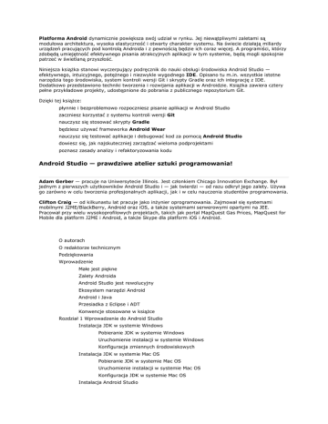 Platforma Android dynamicznie powiększa swój udział w rynku. Jej niewątpliwymi zaletami są modułowa architektura, wysoka elastyczność i otwarty charakter systemu. Na świecie działają miliardy urządzeń pracujących pod kontrolą Androida i z pewnością będzie ich coraz więcej. A programiści, którzy zdobędą umiejętność efektywnego pisania atrakcyjnych aplikacji w tym systemie, będą mogli spokojnie patrzeć w świetlaną przyszłość. Niniejsza książka stanowi wyczerpujący podręcznik do nauki obsługi środowiska Android Studio — efektywnego, intuicyjnego, potężnego i niezwykle wygodnego IDE. Opisano tu m.in. wszystkie istotne narzędzia tego środowiska, system kontroli wersji Git i skrypty Gradle oraz ich integrację z IDE. Dodatkowo przedstawiono techniki tworzenia i rozwijania aplikacji w Androidzie. Książka zawiera cztery pełne przykładowe projekty, udostępnione do pobrania z publicznego repozytorium Git. Dzięki tej książce: płynnie i bezproblemowo rozpoczniesz pisanie aplikacji w Android Studio zaczniesz korzystać z systemu kontroli wersji Git nauczysz się stosować skrypty Gradle będziesz używać frameworka Android Wear nauczysz się testować aplikacje i debugować kod za pomocą Android Studio dowiesz się, jak najskuteczniej zarządzać wieloma podprojektami poznasz zasady analizy i refaktoryzowania kodu Android Studio — prawdziwe atelier sztuki programowania! Adam Gerber — pracuje na Uniwersytecie Illinois. Jest członkiem Chicago Innovation Exchange. Był jednym z pierwszych użytkowników Android Studio i — jak twierdzi — od razu odkrył jego zalety. Używa go zarówno w celu tworzenia profesjonalnych aplikacji, jak i w celu nauczenia studentów programowania. Clifton Craig — od kilkunastu lat pracuje jako inżynier oprogramowania. Zajmował się systemami mobilnymi J2ME/BlackBerry, Android oraz iOS, a także systemami serwerowymi opartymi na JEE. Pracował przy wielu wysokoprofilowych projektach, takich jak portal MapQuest Gas Prices, MapQuest for Mobile dla platform J2ME i Android, a także Skype dla platform iOS i Android. O autorach O redaktorze technicznym Podziękowania Wprowadzenie Małe jest piękne Zalety Androida Android Studio jest rewolucyjny Ekosystem narzędzi Android Android i Java Przesiadka z Eclipse i ADT Konwencje stosowane w książce Rozdział 1 Wprowadzenie do Android Studio Instalacja JDK w systemie Windows Pobieranie JDK w systemie Windows Uruchomienie instalacji w systemie Windows Konfiguracja zmiennych środowiskowych Instalacja JDK w systemie Mac OS Pobieranie JDK w systemie Mac OS Uruchomienie instalacji w systemie Mac OS Konfiguracja JDK w systemie Mac OS Instalacja Android Studio Tworzenie pierwszego projektu HelloWorld Użycie Android Virtual Device Manager Uruchomienie aplikacji HelloWorld w AVD Uruchamianie aplikacji HelloWorld na urządzeniu Podsumowanie Rozdział 2 Poruszanie się po Android Studio Edytor Zakładki edytora Margines Pasek znaczników Przyciski narzędzi Wygląd domyślny Okna narzędzi nawigacyjnych Okno narzędzia Project Okno narzędzia Structure Okno narzędzia Favorities Okno narzędzia TODO Pasek głównego menu Pasek narzędziowy Pasek nawigacyjny Pasek statusu Typowe operacje Zaznaczanie tekstu Polecenia cofania i przywracania Znajdowanie ostatnio otwieranych plików Przemieszczanie się po ostatnich operacjach nawigacyjnych Kopiowanie, wycinanie i wklejanie Menu kontekstowe Uzyskiwanie pomocy Poruszanie się po IDE przy użyciu klawiatury Polecenie Select In Polecenie Class Polecenie File Polecenie Line Polecenie Related File Polecenie Last Edit Location Polecenie Type Hierarchy Polecenie Declaration Znajdowanie i zastępowanie tekstu Polecenie Find Polecenie Find in Path Polecenie Replace Polecenie Replace in Path Podsumowanie Rozdział 3 Programowanie w Android Studio Zawijanie kodu Uzupełnianie kodu Komentowanie kodu Wykorzystanie generowania kodu Konstruktor Metody ustawiające i pobierające Przesłanianie metod Metoda toString() Delegowanie metod Wstawianie szablonów działających na żywo Przenoszenie kodu Odpowiedni styl kodu Polecenie Auto-Indent Lines Polecenie Rearrange Code Polecenie Reformat Code Polecenie Surround With Podsumowanie Rozdział 4 Refaktoryzacja kodu Operacja Rename Operacja Change Signature Operacja Type Migration Operacja Move Operacja Copy Operacja Safe Delete Operacje wydobywania Operacja Extract Variable Operacja Extract Constant Operacja Extract Field Operacja Extract Parameter Operacja Extract Method Zaawansowana refaktoryzacja Operacje Push Members Down i Pull Members Up Operacja Replace Inheritance with Delegation Operacja Encapsulate Fields Operacja Wrap Method Return Value Operacja Replace Constructor with Factory Method Operacja Convert Anonymous to Inner Podsumowanie Rozdział 5 Laboratorium przypomnienia, część I Tworzenie nowego projektu Inicjalizacja repozytorium Git Tworzenie interfejsu użytkownika Korzystanie z edytora wizualnego Edycja pliku XML zawierającego układ graficzny Dodanie usprawnień wizualnych Dodanie elementów do ListView Utworzenie menu paska akcji Zapewnienie trwałości przypomnień Model danych Niskopoziomowe API SQLite Podsumowanie Rozdział 6 Laboratorium przypomnienia, część II Dodawanie i usuwanie przypomnień Reagowanie na interakcję użytkownika Własne okna dialogowe Utworzenie menu kontekstowego z wyborem wielu elementów Obsługa wcześniejszych wersji API Dodanie kontekstowego trybu akcji Implementacja dodawania, edycji i usuwania przypomnień Planowanie własnego okna dialogowego Od planów do kodu Utworzenie własnego okna dialogowego Dodanie własnej ikony Podsumowanie Rozdział 7 Wprowadzenie do narzędzia Git Instalacja Git Ignorowanie plików Dodawanie plików Klonowanie przykładowej aplikacji Przypomnienia Klonowanie i rozwidlanie Przeglądanie historii zmian repozytorium Odgałęzienia Programowanie w osobnej gałęzi Tworzenie rewizji i rozgałęzień w Git Gdzie jest 