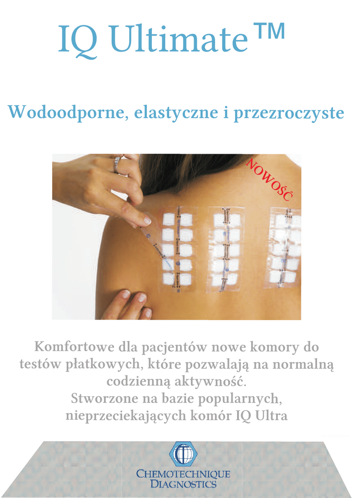 IQ Ultimate™ Wodoodporne, elastyczne i przezroczyste NO W OŚ Ć Komfortowe dla pacjentów nowe komory do testów płatkowych, które pozwalają na normalną codzienną aktywność. Stworzone na bazie popularnych, nieprzeciekających komór IQ Ultra INSTRUKCJA WYKONANIA TESTÓW Z KOMORAMI IQ ULTIMATE 1. Przełam perforację na rogu(rogach) plastra. Jeśli używasz Tacy Montażowej (AP-P) wsuń plaster IQ Ultimate w odpowiednie miejsce na tacy montażowej. 2. Delikatnie odklejaj plaster od pokrywy aż do ukazania się wszystkich komór. Nie odrywaj całkowicie plastra od pokrywy. 3. Jeśli używasz Tacy Montażowej przymocuj plaster do urządzenia przez naciśnięcie klipsa. 4. Nakładaj substancje testowe zaczynając od lewej dolnej komory. Lewa dolna komora na plastrze = lewa górna strona na plecach pacjenta. 5. Jeśli używasz Tacy Montażowej uwolnij plaster z klipsa na tacy. 6. Oderwij rogi plastikowej pokrywy i załóż plaster na plecy pacjenta. Dociśnij plaster palcami przez około 5 sekund. 7. Po założeniu wszystkich plastrów na plecy pacjenta, zdejmij osłony plastrów delikatnym ruchem po przekątnej. 8. Po lewej stronie plastra przy użyciu markera do skóry oznacz pierwszą i ostatnia komorę. 9. Po upływie 48 godzin zdejmij plaster z pleców pacjenta zdecydowanym ruchem po przekątnej (zminimalizuje to dyskomfort pacjenta). INFORMACJE OGÓLNE Aplikacja haptenów Substancje w strzykawkach: nałóż 5-6mm substancji do komory testowej (ok. 25 ul) Substancje w buteleczkach (płynne): zaaplikuj kroplę substancji do komory (ok. 25 ul). Kropla powinna być na tyle duża, by zapewniła odpowiednie nawilżenie znajdującej się w komorze bibułki. Wcześniejsze przygotowanie plastrów Hapteny występujące w formie płynnej oraz substancje lotne takie jak akrylany czy substancje zapachowe należy nakładać do komór bezpośrednio przed wykonaniem testów u pacjenta. Pozostałe substancje testowe można nakładać do komór wcześniej i tak przygotowane komory przechowywać w lodówce przez kilka dni. Zakładanie plastrów na plecy pacjenta Jeśli to możliwe naklejaj plastry na górną cześć pleców pacjenta. Unikaj obszarów kręgosłupa i barków. Jeśli zakładasz wiele plastrów, możesz założyć na plecach pacjenta 2 rzędy po 4-5 plastrów w pozycji horyzontalnej. W wyjątkowych przypadkach do założenia plastrów możesz wykorzystać inne części ciała, takie jak np. górna część ramienia. Jeśli pacjent ma tłustą skórę przed nałożeniem plastrów delikatnie przetrzyj ją alkoholem. Jeśli pacjent nie ma zbyt suchej lub tłustej skóry nie ma potrzeby dodatkowego mocowani plastrów na skórze za pomocą plastra czy taśmy. Nie zakładaj testów pod ramiączkami biustonosza, może to powodować podrażnienia w miejscu testowym i uniemożliwić prawidłowy odczyt. Ważne: po naklejeniu plastrów na plecy pacjenta zawsze dociśnij plaster przez około 5 sekund. Ucisk i ciepło spowodują lepsze przyklejenia się plastra. Do oznaczeń na powierzchni plastra możesz użyć markera wodoodpornego, do oznaczeń na skórze zawsze używaj markera do skóry. Wodoodporne i elastyczne komory IQ Ultimate pozwalają pacjentom na normalną, codzienną aktywność włącznie z pracą, uprawianiem sportu czy korzystaniem z prysznica. Środki ostrożności Przed wykonywaniem testów płatkowych pacjent nie powinien zażywać żadnych leków sterydowych i modulujących działanie systemu immunologicznego. Powinien również unikać ekspozycji na słońce. Formularz wyników testów Przygotuj formularz to zapisu wyników testów z listą przetestowanych substancji i kolejnymi odczytami wyników. Dla wszystkich serii diagnostycznych formularz wyników testów znajdziesz na stronie www.chemotechnique.pl w zakładce „Serie diagnostyczne”. Informacja o przebiegu testów płatkowych Przy kwalifikowaniu pacjenta na testy płatkowe poinformuj go dokładnie o całej procedurze. Przykładową informacje dla pacjenta znajdziesz na stronie www.chemotechnique.pl w zakładce „Informacja dla pacjenta o przebiegu testów płatkowych”. Informacja po testach Poinformuj pacjenta o wynikach testów. Powiedz co go uczula, gdzie występują uczulające go substancje, czego ma unikać. Wiele informacji znajdziesz przy opisach substancji i serii diagnostycznych na stronie www.chemotechnique.pl. ODCZYTYWANIE WYNIKÓW / INTERPRETACJA Po upływie 48 godzin zdejmij plastry z pleców pacjenta. Widoczne na skórze odciski komór i lekki rumień będą znakiem dobrej okluzji. Preferuje się odczytywanie testów w 48, 72, 96, 168 godzin od założenia testów (ze względu na możliwość pojawienia się odczynów późnych). Do odczytu testów użyj specjalnej Płytki do odczytu (RP-P). Do interpretacji wyników pomocny może być poniższy schemat: Zapis Znaczenie IR Odczyn (irritant podrażnieniowy reaction) +++ ++ + ? NT Opis Odczyn podrażnieniowy można rozpoznać na podstawie cech morfologicznych (m. in. „efekt mydlany” – maceracja naskórka, krostki, strupki mieszkowe) oraz tendencji do wygasania zauważalnej od momentu zdjęcia plastrów Odczyn skrajnie Zlewanie się pęcherzyków w większe "pęcherze” (w nasilony istocie są to pęcherze rzekome) lub powstanie nadżerek na skutek ich pękania Odczyn silny Nasilony obrzęk, naciek, liczne grudki, pęcherzyki obecne Odczyn słaby Wyczuwalne palpacyjnie ognisko rumieniowe, sugerujące mierny obrzęk/naciek, z grudkami lub bez, pęcherzyki nieobecne Odczyn Palpacyjnie niewyczuwalna plama rumieniowa wątpliwy Ujemny Brak widocznej reakcji skórnej Nie badano Zawsze należy zaznaczyć już na początku badania, jeśli (not tested) któryś z rutynowo testowanych haptenów został pominięty. Nieodnotowanie tego faktu może skutkować błędnym uznaniem niewykonanego w istocie testu za reakcję ujemną Akcesoria ułatwiające wykonywanie testów płatkowych Taca montażowa Markery do skóry Płytka do odczytu testów Instytut Dermato
