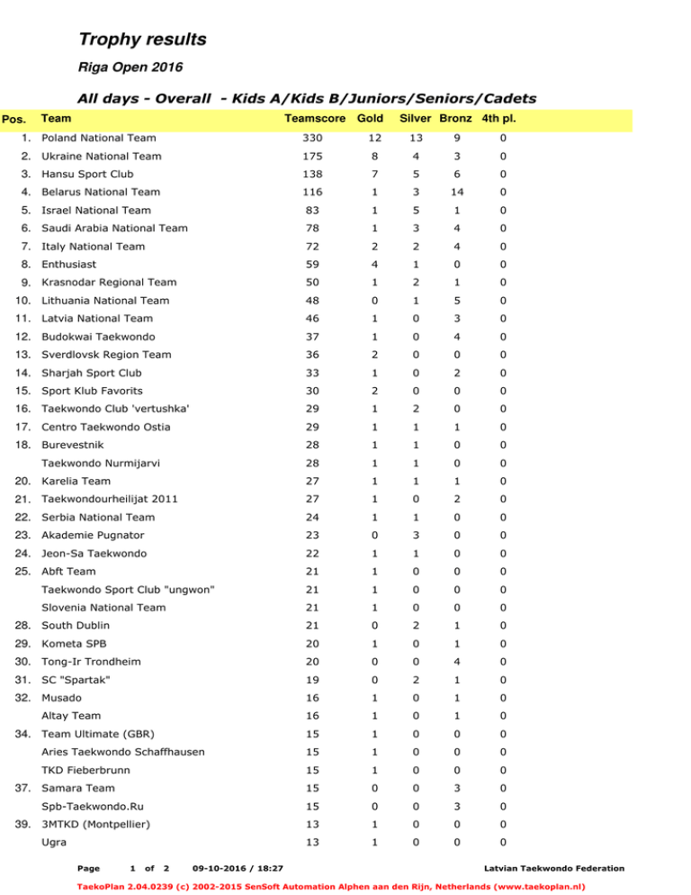 Trophy results Riga Open 2016 All days - Overall - Kids A/Kids B/Juniors/Seniors/Cadets Pos. Team Teamscore Gold Silver Bronz 4th pl. 1. Poland National Team 330 12 13 9 0 2. Ukraine National Team 175 8 4 3 0 3. Hansu Sport Club 138 7 5 6 0 4. Belarus National Team 116 1 3 14 0 5. Israel National Team 83 1 5 1 0 6. Saudi Arabia National Team 78 1 3 4 0 7. Italy National Team 72 2 2 4 0 8. Enthusiast 59 4 1 0 0 9. Krasnodar Regional Team 50 1 2 1 0 10. Lithuania National Team 48 0 1 5 0 11. Latvia National Team 46 1 0 3 0 12. Budokwai Taekwondo 37 1 0 4 0 13. Sverdlovsk Region Team 36 2 0 0 0 14. Sharjah Sport Club 33 1 0 2 0 15. Sport Klub Favorits 30 2 0 0 0 16. Taekwondo Club 'vertushka' 29 1 2 0 0 17. Centro Taekwondo Ostia 29 1 1 1 0 18. Burevestnik 28 1 1 0 0 28 1 1 0 0 20. Karelia Team 27 1 1 1 0 21. Taekwondourheilijat 2011 27 1 0 2 0 22. Serbia National Team 24 1 1 0 0 23. Akademie Pugnator 23 0 3 0 0 24. Jeon-Sa Taekwondo 22 1 1 0 0 25. Abft Team 21 1 0 0 0 Taekwondo Sport Club "ungwon" 21 1 0 0 0 Slovenia National Team 21 1 0 0 0 28. South Dublin 21 0 2 1 0 29. Kometa SPB 20 1 0 1 0 30. Tong-Ir Trondheim 20 0 0 4 0 31. SC "Spartak" 19 0 2 1 0 32. Musado 16 1 0 1 0 16 1 0 1 0 15 1 0 0 0 Aries Taekwondo Schaffhausen 15 1 0 0 0 TKD Fieberbrunn 15 1 0 0 0 15 0 0 3 0 15 0 0 3 0 13 1 0 0 0 13 1 0 0 0 Taekwondo Nurmijarvi Altay Team 34. Team Ultimate (GBR) 37. Samara Team Spb-Taekwondo.Ru 39. 3MTKD (Montpellier) Ugra Page 1 of 2 09-10-2016 / 18:27 Latvian Taekwondo Federation TaekoPlan 2.04.0239 (c) 2002-2015 SenSoft Automation Alphen aan den Rijn, Netherlands (www.taekoplan.nl) Trophy results Riga Open 2016 All days - Overall - Kids A/Kids B/Juniors/Seniors/Cadets Pos. Team Teamscore Gold 41. Kixstar Dragon TKD Silver Bronz 4th pl. 13 0 1 0 0 13 0 1 0 0 43. Tim-Wokeu 12 0 1 1 0 44. Sport Taekwondo Ireland 12 0 0 0 0 45. Brussels Taekwondo Team 11 0 1 0 0 Osvit 11 0 1 0 0 Olympic Taekwondo Club Bonn 11 0 1 0 0 Vladikavkaz Team 11 0 1 0 0 49. Paimion Taekwondo 11 0 0 1 0 50. CPH City TKD 10 0 0 0 0 51. NTC (Great Britain) 9 0 1 0 0 52. Azs Awf Warszawa 9 0 0 1 0 53. Jitae 8 0 0 2 0 54. Abdel-Kwan Rotterdam 8 0 0 0 0 8 0 0 0 0 7 0 0 1 0 7 0 0 1 0 58. Budokwai / Taekwondo Team Turku 5 0 1 0 0 59. Kwan 5 0 0 1 0 Tampere Kumgang 5 0 0 1 0 Ortc 5 0 0 1 0 TSC Gladbeck 5 0 0 1 0 Taekwondo Amersfoort 5 0 0 1 0 Team Heimdal 5 0 0 1 0 Irkutsk Taekwondo Federation 5 0 0 1 0 Selfoss Taekwondo Club 5 0 0 1 0 67. Flemish Topsport Team 4 0 0 0 0 68. Mudukwan Ganshoren 3 0 0 1 0 Taekwondo Axel Müller 3 0 0 1 0 Oneness Taekwondo Accademia 3 0 0 1 0 2 0 0 0 0 Junsa Ireland 2 0 0 0 0 TKD Citta Del Piave 2 0 0 0 0 Team Tųyen 2 0 0 0 0 USA National Team 2 0 0 0 0 Grorud Taekwondo Club Saint-Petersburg Taekwondo Federation 56. Taekwondo Eindhoven Team Tveita 71. Doboksport Tampere Points based on: Gold: 7 Pnts - Silver: 3 Pnts - Bronze: 1 Pnts 4th Place (if not shared 3rd): 2 Participation: 2 Pnts - Win: 2 Pnts - Single: 2 Pnts (...) is a first place as single in category Page 2 of 2 09-10-2016 / 18:27 Latvian Taekwondo Federation TaekoPlan 2.04.0239 (c) 2002-2015 SenSoft Automation Alphen aan den Rijn, Netherlands (www.taekoplan.nl)