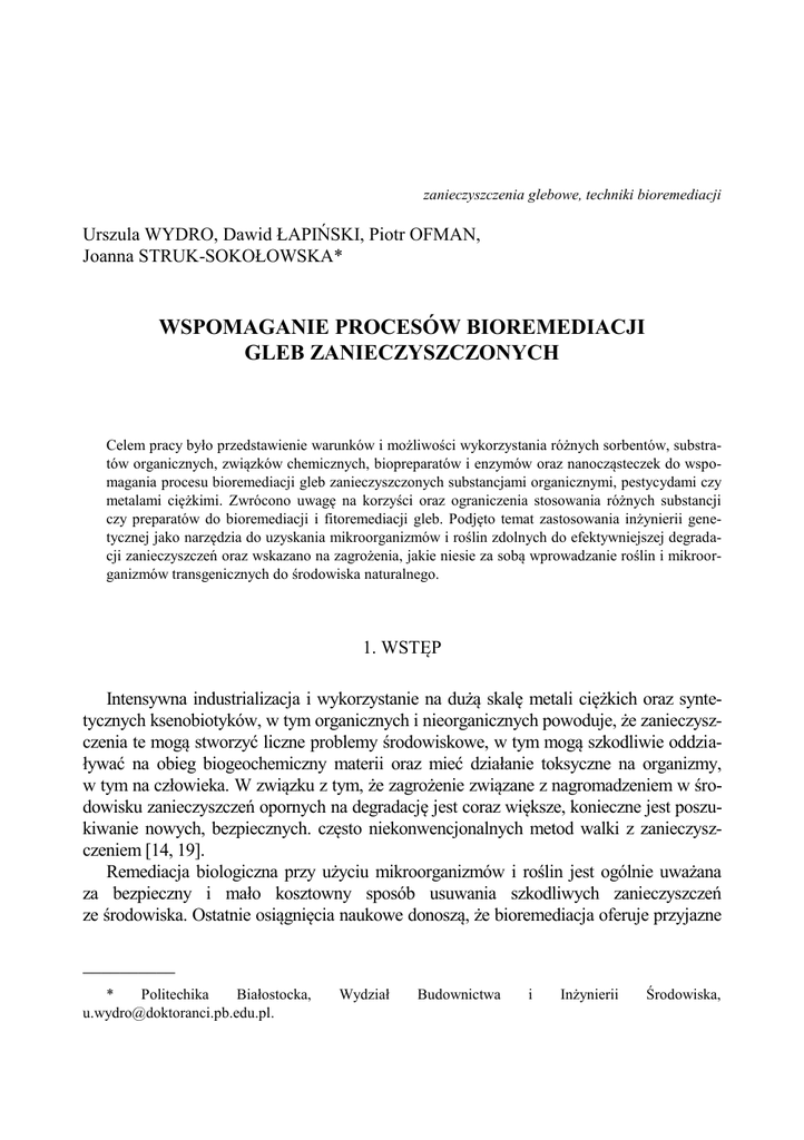zanieczyszczenia glebowe, techniki bioremediacji Urszula WYDRO, Dawid ŁAPIŃSKI, Piotr OFMAN, Joanna STRUK-SOKOŁOWSKA* WSPOMAGANIE PROCESÓW BIOREMEDIACJI GLEB ZANIECZYSZCZONYCH Celem pracy było przedstawienie warunków i możliwości wykorzystania różnych sorbentów, substratów organicznych, związków chemicznych, biopreparatów i enzymów oraz nanocząsteczek do wspomagania procesu bioremediacji gleb zanieczyszczonych substancjami organicznymi, pestycydami czy metalami ciężkimi. Zwrócono uwagę na korzyści oraz ograniczenia stosowania różnych substancji czy preparatów do bioremediacji i fitoremediacji gleb. Podjęto temat zastosowania inżynierii genetycznej jako narzędzia do uzyskania mikroorganizmów i roślin zdolnych do efektywniejszej degradacji zanieczyszczeń oraz wskazano na zagrożenia, jakie niesie za sobą wprowadzanie roślin i mikroorganizmów transgenicznych do środowiska naturalnego. 1. WSTĘP Intensywna industrializacja i wykorzystanie na dużą skalę metali ciężkich oraz syntetycznych ksenobiotyków, w tym organicznych i nieorganicznych powoduje, że zanieczyszczenia te mogą stworzyć liczne problemy środowiskowe, w tym mogą szkodliwie oddziaływać na obieg biogeochemiczny materii oraz mieć działanie toksyczne na organizmy, w tym na człowieka. W związku z tym, że zagrożenie związane z nagromadzeniem w środowisku zanieczyszczeń opornych na degradację jest coraz większe, konieczne jest poszukiwanie nowych, bezpiecznych. często niekonwencjonalnych metod walki z zanieczyszczeniem [14, 19]. Remediacja biologiczna przy użyciu mikroorganizmów i roślin jest ogólnie uważana za bezpieczny i mało kosztowny sposób usuwania szkodliwych zanieczyszczeń ze środowiska. Ostatnie osiągnięcia naukowe donoszą, że bioremediacja oferuje przyjazne __________ * Politechika Białostocka, [email protected]. Wydział Budownictwa i Inżynierii Środowiska, 504 Wspomaganie procesów bioremediacji gleb zanieczyszczonych dla środowiska gospodarczo i społecznie akceptowalne usuwanie ksenobiotyków przy zastosowaniu mikroorganizmów, roślin i enzymów [19]. Mikroorganizmy biorą udział w degradacji i mineralizacji różnych ksenobiotyków, ich przyswajaniu (asymilacji) bądź przekształcania w nietoksyczne związki chemiczne (biotransformacja) [12]. Z kolei rośliny mają wrodzoną zdolność do detoksykacji niektórych ksenobiotyków (np. metali ciężkich, radionuklidów) w glebie. Kluczową rolę przy fitoremediacji pełni także system korzeniowy roślin a w szczególności system ryzosferowy i zamieszkujące tam mikroorganizmy. Interakcja pomiędzy roślinami a drobnoustrojami w strefie ryzosferowej stanowi podstawę mechanizmów fitotechnologii [24]. Głównym problemem technologii bioremediacji jest usuwanie ze środowiska najtrudniej degradowalnych komponentów zanieczyszczeń oraz usunięcie tzw. zanieczyszczeń resztkowych w ostatnim procesie biodegradacji. Ciągła akumulacja w środowisku silnie toksycznych i trudnodegradowalnych zanieczyszczeń powoduje, że mikroorganizmy nie są w pełni skuteczne w ochronie biosfery. Stąd w ostatnich latach naukowcy na całym świecie wskazują na możliwość modyfikacji metod bioremediacji poprzez wprowadzanie różnych preparatów i substancji (mikrobiologicznych, enzymatycznych, organicznych), które zwiększą efektywność biologicznej remediacji [14]. 2. TECHNIKI BIOREMEDIACYJNE 2.1. BIOREMEDIACJA NATURALNA (PROCES SAMOOCZYSZCZANIA) Bioremediacja naturalna zwana też bioattenuacją opiera się na naturalnej biodegradacji zanieczyszczeń z wykorzystaniem flory zamieszkującej skażone środowisko połączonej z monitoringiem stężenia ksenobiotyków. Jest to metoda stosowana najczęściej do usuwania zanieczyszczeń z gleb i wód podziemnych. Bioremediacja naturalna zachodzi w środowisku samoczynnie i związana jest z obiegiem pierwiastków w środowisku. Bioremediacja naturalna ma najpowszechniejsze zastosowanie w przypadku wycieków produktów ropy naftowej, gdzie monitorowane jest rozmieszczenie zanieczyszczeń, śledzona migracja skażenia, tempo przyrostu i aktywności mikroflory oraz obecność pierwiastków biogennych [6]. Proces samooczyszczania środowiska może być długotrwały, co wiąże się z spontanicznym przebiegiem reakcji fizyczno-chemicznych podczas degradacji zanieczyszczeń, jak również ze specyficzną aktywnością enzymatyczną mikroorganizmów autochtonicznych. Zdolność mikroorganizmów do bioremediacji zanieczyszczeń polega na unieszkodliwianiu na drodze utlenienia i rozkładu (biodegradacji), przyswojenia (asymilacji), bądź transformacji w nietoksyczne związki chemiczne (biotransformacja) [12]. U. WYDRO i in. 505 Na efektywność i szybkość degradacji zanieczyszczeń przy pomocy naturalnie występujących mikroorganizmów mają wpływ różne czynniki. Pierwszym z nich są właściwości substancji powodujących zanieczyszczenie, a więc ich masa cząsteczkowa, struktura chemiczna (łatwiej są degradowane związki proste takie jak n-alkany niż np. węglowodory posiadające w swojej budowie węgiel aromatyczny), oddziaływania hydrofilowe i hydrofobowe. Drugim czynnikiem jest otoczenie, a przede wszystkim stężenie i obecność w nim substancji toksycznych, a także wilgotność, zawartość tlenu, temperatura, pH, potencjał redox, obecność pierwiastków biogennych (głównie N, P) i soli mineralnych, trzecim czynnikiem jest potencjał środowiska, a mianowicie obecność w nim różnych mikroorganizmów, które mogą oddziaływać na siebie negatywnie, a ponadto rodzaj organizmów zasiedlających skażone środowisko, rodzaj i miejsce wydzielania enzymów, stosunek do tlenu [6, 7, 18]. 2.2. BIOREMEDIADIACJA INŻYNIERYJNA Bioremediacja inżynieryjna jest sumą zabiegów obejmującą usunięcie zanieczyszczeń przede wszystkim przez mikroorganizmy oraz rośliny. Może być ona przeprowadzana metodą in situ (w miejscu skażenia) oraz metodą ex situ (