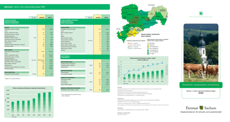 Saksonia – dane z roku sprawozdawczego 2006 Jednostka SAKSONIA Jednostka NIEMCY STRUKTURA ZAKŁADÓW GOSPODARKI ŻYWIENIOWEJ W PRZEMYŚLE PRZETWÓRCZYM 2) SAKSONIA NIEMCY WYWÓZ GOSPODARKI ŻYWIENIOWEJ ZGODNIE ZE STATYSTYKĄ HANDLU ZAGRANICZNEGO 3) ZAKŁADY WYWÓZ OGÓŁEM Gospodarka żywieniowa ogółem w tym Rzeźnie i przetwórstwo mięsa Przetwórstwo warzyw i owoców Produkcja roślinnych i zwierzęcych olejów i tłuszczy Przetwórstwo mleczne, lody jadalne Młyny mielące i łuszczące Produkcja pasz Produkcja wyrobów piekarniczych i słodyczy Produkcja napojów Ilość 356 5.900 87 25 1.279 306 2 14 4 12 162 33 34 244 115 209 2.606 696 OBRÓT OGÓŁEM Gospodarka żywieniowa ogółem w tym Rzeźnie i przetwórstwo mięsa Przetwórstwo warzyw i owoców Produkcja roślinnych i zwierzęcych olejów i tłuszczy Przetwórstwo mleczne, lody jadalne Młyny mielące i łuszczące Produkcja pasz Produkcja wyrobów piekarniczych i słodyczy Produkcja napojów 6.774 157.853 705 442 30.579 8.210 Brak wartości 2.458 43 100 634 965 5.398 22.145 4.544 5.673 26.125 19.946 Gospodarka żywieniowa ogółem w tym Mleko i produkty mleczne Ser Wódka Mięso i produkty mięsne Owoce łupinowe i suszone Wyroby piekarnicze Kakao i wyroby z kakao Buraki cukrowe i wyroby z cukru Przetworzone warzywa i konserwy Roślinne oleje i tłuszcze Pszenica mln. Euro 693 37.895 140 173 54 51 35 37 19 17 18 12 18 3.006 2.297 729 5.128 461 2.940 1.837 1.246 483 1.075 801 Urządzenia do wytwarzania oleju w Saksonii Udział powierzchni uprawy rzepaku we wszystkich gruntach rolnych powiatów w Saksonii Olejarnia – w eksploatacji Brak wartości Olejarnia w budowie /planowaniu mniej niż 10 % Biodiesel – w eksploatacji > 10 % do poniżej 12,5 % Biodiesel – w budowie /planowaniu > 12,5 % do poniżej 15 % > 15 % do poniżej 17,5 % > 17,5 % do poniżej 20 % 20 % i więcej ILOŚCI PRODUKCJI I PRZETWÓRSTWA Rozwój powierzchni uprawnych rzepaku i rzepiku od 1991 do 2006 roku Produkcja mleka do konsumpcji Produkcja jogurtów i deserów Produkcja sera 140 1.000 t 395 423 169 6.112 2.970 2.180 GOSPODARKA MŁYNAMI Gospodarka żywieniowa ogółem Procent 5,9 15,0 Przemiał ogółem w tym pszenicy miękkiej 1.000 t 273 217 8.022 6.741 PRZEMYSŁ PASZ MIESZANYCH Zakłady z 20 i więcej zatrudnionymi Przetwórstwo ogółem w tym zboża w tym makuchu Pasze mieszane ogółem Obroty na jednego zatrudnionego w gospodarce żywnościowej 1.000 t 472 291 181 541 17.520 9.184 5.263 20.307 PRZEMYSŁ PRZETWÓRSTWA TŁUSZCZÓW 300.000 Przetwórstwo nasion oleistych i oliwek 250.000 3) 200.000 wraz z nieprzetworzonymi produktami rolnymi; liczby tymczasowe 1.000 t 380 9.961 131 118 120 102 122 108 100 25 78 80 68 75 14 60 40 20 37 11 11 15 16 18 17 20 15 10 10 5 Udział w gruntach ornych w % PRZETWÓRSTWO MLEKA Powierzchnia uprawna w 1.000 ha mln. Euro KWOTA EKSPORTOWA 2) Uprawa rzepaku i wytwarzanie oleju w Saksonii 5 0 0 1991 1993 1995 1997 1999 2001 2003 2005 2006 Źródła: StaLa Rolnictwo i gospodarka żywieniowa Źródła: Bundesministerium für Verbraucherschutz, Ernährung und Landwirtschaft Statistisches Bundesamt Arbeitskreis Volkswirtschaftliche Gesamtrechnung Statistisches Landesamt des Freistaates Sachsen (StaLa) Sächsische Landesanstalt für Landwirtschaft Euro Wydawcy: Sächsisches Staatsministerium für Umwelt und Landwirtschaft (SMUL) Postfach 10 05 10, D-01076 Dresden www.smul.sachsen.de, E-Mail: [email protected] 150.000 (Bez dostępu do elektronicznie sygnowanych, jak i zaszyfrowanych elektronicznych dokumentów) 100.000 Redacja: Sächsische Landesanstalt für Landwirtschaft, SMUL 50.000 0 1993 Źródła: StaLa 1995 1997 1999 2001 2003 2005 2006 Wydanie zamknięto: Czerwiec 2007 r. dane z roku sprawozdawczego 2006 Saksonia – dane z roku sprawozdawczego 2006 Udział w powierzchni kraju związkowego Lasy Udział w powierzchni kraju związkowego Zbiorniki wodne Udział w powierzchni kraju związkowego SAKSONIA 1.000 ha 1000 ha % 1.000 ha % 1.000 ha % 1.842 1.022 56 496 27 35 2 35.705 18.932 53 10.649 30 828 2 Jednostka NIEMCY WYKORZYSTANIE POWIERZCHNI POWIERZCHNIA Powierzchnia ogółem Grunty rolne Jednostka NIEMCY Powierzchnia rolna Pastwiska 1.000 ha 1.000 ha % 1.000 ha % 1.000 ha 1.000 ha 1.000 ha Udział w powierzchni Ziemia uprawna Udział w powierzchni Ugory Nieużytki (2005) Grunty dzierżawne (2005) 911 184 20 721 79 28 298 746 16.951 4.882 29 11.866 70 741 9.426 10.586 Zboża ogółem (włącznie z kukurydzą, CCM) w tym pszenica jęczmień owies WYKORZYSTANIE ZIEMI UPRAWNEJ Ludność ogółem w tysiącach 2 Ilość mieszkańców na km powierzchni Zatrudnieni ogółem Zatrudnieni w rolnictwie i leśnictwie ilość w tysiącach w tysiącach 4.262 231 1.906 42 82.372 231 39.106 849 Łą STRUKTURA ZAKŁADOW ROLNICZYCH FORMA PRAWNA Zakłady rolnicze ogólem w tym posiadające osobowość prawną w tym spółdzielnie Sp. z o.o. w tym osoby fizyczne w tym Spółki osobowe Drobni przedsiębiorcy w tym ci, dla których ta działalność stanowi główne żródło utrzymania ilość 7.117 632 212 264 6.480 386 6.094 1.875 4.219 366.600 5.300 1.200 2.600 361.300 18.800 342.500 160.000 182.500 Zboża ogółem w tym pszenica jęczmień owies żyto kurkurydza, CCM Rośliny okopowe w tym ziemniaki buraki cukrowe Rośliny oleiste łącnie z Non Food w tym rzepak słonecznik Rośliny strączkowe Rośliny pastewne w tym kukurydza zielona i kiszonkowa 1.000 ha 402 181 146 10 28 11 21 7 14 133 131 2 15 107 63 6.702 3.115 2.025 184 539 401 641 274 358 1.483 1.429 32 144 1.956 1.346 UPRAWA EKOLOGICZNA Powierzchnia uprawna Zakłady 1.000 ha ilość 23 298 807* 17.020* WIELKOŚĆ ZAKŁADÓW 2.650 113.600 1.156 68.900 1.018 85.400 632 54.600 993 27.500 218 1.800 ilość 252 1.500 Rzepak (Łącznie z Non Food) Ziemnialki w tym młode ziemniaki Buraki cukrowe Kukurydza zielona i kiszonkowa dt/ha 1.000 t dt/ha 1.000 t dt/ha 1.000 t dt/ha 1.000 t dt/ha 1.000 t dt/ha 1.000 t dt/ha 1.000 t dt/ha 1.000 t dt/ha 1.000 t dt/ha 1.000 t dt/ha 1.000