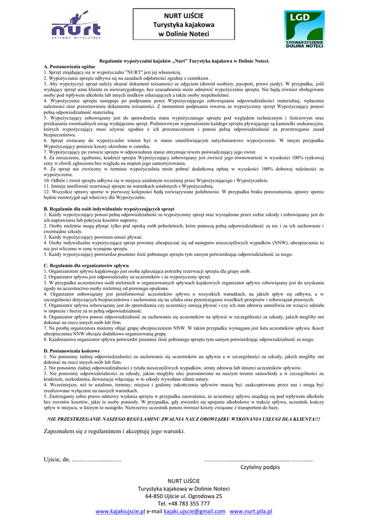 NURT UJŚCIE Turystyka kajakowa w Dolinie Noteci Regulamin wypożyczalni kajaków „Nurt” Turystyka kajakowa w Dolinie Noteci. A. Postanowienia ogólne 1. Sprzęt znajdujący się w wypożyczalni "NURT" jest jej własnością. 2. Wypożyczanie sprzętu odbywa się na zasadach odpłatności zgodnie z cennikiem . 3. Aby wypożyczyć sprzęt należy okazać dokument tożsamości ze zdjęciem (dowód osobisty, paszport, prawo jazdy). W przypadku, jeśli wydający sprzęt uzna klienta za niewiarygodnego, bez uzasadnienia może odmówić wypożyczenia sprzętu. Nie będą również obsługiwane osoby pod wpływem alkoholu lub innych środków odurzających a także osoby niepełnoletnie. 4. Wypożyczenie sprzętu następuje po podpisaniu przez Wypożyczającego zobowiązania odpowiedzialności materialnej, wpłaceniu należności oraz pozostawieniu dokumentu tożsamości. Z momentem podpisania rewersu za wypożyczony sprzęt Wypożyczający ponosi pełną odpowiedzialność materialną. 5. Wypożyczający zobowiązany jest do sprawdzenia stanu wypożyczanego sprzętu pod względem technicznym i ilościowym oraz przekazania ewentualnych uwag wydającemu sprzęt. Podstawowym wyposażeniem każdego sprzętu pływającego są kamizelki asekuracyjne, których wypożyczający musi używać zgodnie z ich przeznaczeniem i ponosi pełną odpowiedzialność za przestrzeganie zasad bezpieczeństwa. 6. Sprzęt zwracany do wypożyczalni winien być w stanie umożliwiającym natychmiastowe wypożyczenie. W innym przypadku Wypożyczający poniesie koszty określone w cenniku. 7. Wypożyczający po zwrocie sprzętu w odpowiednim stanie otrzymuje rewers poświadczający jego zwrot. 8. Za zniszczenie, zgubienie, kradzież sprzętu Wypożyczający zobowiązany jest zwrócić jego równowartość w wysokości 100% rynkowej ceny w chwili zgłoszenia bez względu na stopień jego zamortyzowania. 9. Za sprzęt nie zwrócony w terminie wypożyczalnia może pobrać dodatkową opłatę w wysokości 100% dobowej należności za wypożyczenie. 10. Odbiór i zwrot sprzętu odbywa się w miejscu ustalonym wcześniej przez Wypożyczającego i Wypożyczalnie. 11. Istnieje możliwość rezerwacji sprzętu na warunkach ustalonych z Wypożyczalnią. 12. Wszystkie sprawy sporne w pierwszej kolejności będą rozwiązywane polubownie. W przypadku braku porozumienia, sprawy sporne będzie rozstrzygał sąd właściwy dla Wypożyczalni. B. Regulamin dla osób indywidualnie wypożyczających sprzęt 1. Każdy wypożyczający ponosi pełną odpowiedzialność za wypożyczony sprzęt oraz wyrządzone przez siebie szkody i zobowiązany jest do ich naprawienia lub pokrycia kosztów naprawy. 2. Osoby nieletnie mogą płynąć tylko pod opieką osób pełnoletnich, które ponoszą pełną odpowiedzialność za nie i za ich zachowanie i ewentualne szkody. 3. Każdy wypożyczający powinien umieć pływać. 4. Osoby indywidualne wypożyczające sprzęt powinny ubezpieczać się od następstw nieszczęśliwych wypadków (NNW), ubezpieczenie to nie jest wliczone w cenę wynajmu sprzętu. 5. Każdy wypożyczający potwierdza pisemnie ilość pobranego sprzętu tym samym potwierdzając odpowiedzialność za niego. C. Regulamin dla organizatorów spływu 1. Organizatorem spływu kajakowego jest osoba zgłaszająca potrzebę rezerwacji sprzętu dla grupy osób. 2. Organizator spływu jest odpowiedzialny za uczestników i za wypożyczony sprzęt. 3. W przypadku uczestnictwa osób nieletnich w organizowanych spływach kajakowych organizator spływu zobowiązany jest do uzyskania zgody na uczestnictwo osoby nieletniej od prawnego opiekuna. 4. Organizator zobowiązany jest poinformować uczestników spływu o wszystkich warunkach, na jakich spływ się odbywa, a w szczególności dotyczących bezpieczeństwa i zachowania się na szlaku oraz przestrzegania wszelkich przepisów i zobowiązań prawnych. 5. Organizator spływu zobowiązany jest do sprawdzenia czy uczestnicy umieją pływać i czy ich stan zdrowia umożliwia im wzięcie udziału w imprezie i bierze za to pełną odpowiedzialność. 6. Organizator spływu ponosi odpowiedzialność za zachowanie się uczestników na spływie w szczególności za szkody, jakich mogliby oni dokonać na rzecz innych osób lub firm. 7. Na prośbę organizatora możemy objąć grupę ubezpieczeniem NNW. W takim przypadku wymagana jest lista uczestników spływu. Koszt ubezpieczenia NNW obciąża dodatkowo organizowaną grupę. 8. Każdorazowo organizator spływu potwierdzi pisemnie ilość pobranego sprzętu tym samym potwierdzając odpowiedzialność za niego. D. Postanowienia końcowe 1. Nie ponosimy żadnej odpowiedzialności za zachowanie się uczestników na spływie a w szczególności za szkody, jakich mogliby oni dokonać na rzecz innych osób lub firm. 2. Nie ponosimy żadnej odpowiedzialności z tytułu nieszczęśliwych wypadków, utraty zdrowia lub śmierci uczestników spływów. 3. Nie ponosimy odpowiedzialności za szkody, jakim mogłyby ulec pozostawione na naszym terenie samochody a w szczególności za kradzieże, uszkodzenia, dewastacje włączając w to szkody wywołane siłami natury. 4. Wcześniejsze, niż to ustalono, terminy, miejsca i godziny zakończenia spływów muszą być zaakceptowane przez nas i mogą być zrealizowane wyłącznie na naszych warunkach. 5. Zastrzegamy sobie prawo odmowy wydania sprzętu w przypadku zauważenia, że uczestnicy spływu znajdują się pod wpływem alkoholu bez zwrotów kosztów, jakie te osoby poniosły. W przypadku, gdy stwierdzi się upojenie alkoholowe w trakcie spływu, uczestnik kończy spływ w miejscu, w którym to nastąpiło. Nietrzeźwy uczestnik ponosi również koszty związane z transportem do bazy. NIE PRZESTRZEGANIE NASZEGO REGULAMINU ZWALNIA NAS Z OBOWIĄZKU WYKONANIA USŁUGI DLA KLIENTA!!! Zapoznałem się z regulaminem i akceptuję jego warunki. Ujście, dn. ................................ ........................................