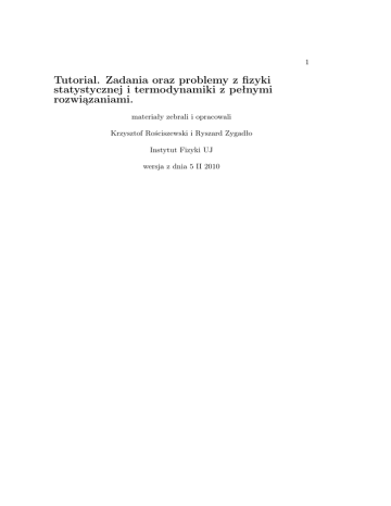 1 Tutorial. Zadania oraz problemy z fizyki statystycznej i termodynamiki z pełnymi rozwiązaniami. materiały zebrali i opracowali Krzysztof Rościszewski i Ryszard Zygadło Instytut Fizyki UJ wersja z dnia 5 II 2010 2 Wstęp Niniejszy zbiór zadań jest adresowany do studentów nauk przyrodniczych głównie do fizyków i chemików (na ogół 3 rok studiów). Jest to wersja surowa zawierająca na pewno liczne błędy i nieścisłości. (Zauważone błędy oraz ewentualne uwagi proszę zgłaszać na adres [email protected]). Co więcej nie jest to wersja kompletna. Rozdział fizyka statystyczna jest zbyt mały (niedokończony) a ponadto brakuje rozdziału zawierającego takie hasła jak: rachunek prawdopodobieństwa, procesy stochastyczne, procesy Markowa, równania Master i równania Fokkera-Plancka. Mamy nadzieję, że jeśli czas pozwoli a zwłaszcza jeśliby nasi koledzy włączyli się do prac edytorskich to opracowane materiały (w kolejnych latach) zostaną poszerzone. Na razie to co jest w tutorialu i tak powinno dla studentów być dosyć przydatne (oraz oszczędzić im sporo czasu). W wersji obecnej skrypt NIE JEST opracowaniem w pełni oryginalnym. Podane w nim zadania i problemy oraz ich rozwiązania w większości były znane (w tej czy innej formie) od wielu lat. W szczególności używane są przez wielu naszych kolegów z Instytutu Fizyki UJ na ćwiczeniach do wykładu z fizyki statystycznej i termodynamiki fenomenologicznej. Tak więc jesteśmy edytorami i jedynie forma dydaktycznej prezentacji jest (w pewnej części) nowa. Zdecydowaliśmy się na opracowanie tutorialu jako kompilacji materiałów do nauki, zebranych w jednym miejscu i podanych w taki sposób aby nawet początkujący i zupełnie przeciętny student nie miał problemów z ich zrozumieniem i przyswojeniem. Podane są zadania i problemy o różnym stopniu trudności - od trywialnie łatwych do całkiem trudnych. Forma wydania: skrypt internetowy (plik pdf). Wydanie książkowe, ze sztywnymi kartkami i z okładką byłoby oczywiście o wiele przyjemniejsze ale zdobycie kilku tysięcy zł na mało-nakładową tradycyjną publikację (plus duży nakład czasu na biurokrację z tym związaną) jest na naszych uczelniach przedsięwzięciem na ogół niezbyt zachęcającym. Pierwowzorem do niniejszego tutorialu były skrypty uczelniane: 3 4 H. Arodź, K. Rościszewski, Zbiór zadań z termodynamiki i fizyki statystycznej dla studiów zaocznych, Skrypt UJ nr. 275, Kraków 1977; Fizyka Statystyczna i termodynamika fenomenologiczna dla studiów zaocznych, Skrypt UJ nr. 353, Kraków 1980. W uzupełnieniu do podanych powyżej referencji, zamieszczamy spis różnych podręczników, które mogą okazać się przydatne zarówno przy rozwiązywaniu zadań jak i w dalszej samodzielnej nauce. 1 R. Kubo, Thermodynamics, An advanced course with problems and solutions, North-Holland Publ., Amsterdam 1978. 2 R. Kubo, Statistical Mechanics, An advanced course with problems and solutions, Nort-Holland Publ., Amsterdam 1965. 3 A. Isihara, Statistical Physics, Academic Press, New York 1971. 4 A. Anselm, Podstawy Fizyki Statystycznej i Termodynamiki, PWN, Warszawa 1984 (tłumaczenie z języka rosyjskiego). 5 K. Huang, Podstawy Fizyki Statystycznej, Wydawnictwo Naukowe PWN, Warszawa 2006 (tłumaczenie z języka angielskiego). 6 K. Huang, Mechanika Statystyczna, PWN, Warszawa 1978 (tłumaczenie z języka angielskiego). 7 L. E. Reichl, A Modern Course in Statistical Physics, University of Texas Press, Austin 1980 (istnieją nowsze bardziej rozbudowane wydania). 8 J. Werle, Termodynamiki Fenomenologiczna, PWN, Warszawa 1957. 9 R. Feynman, Statistical mechanics, A set of lectures, W. A. Benjamin, Inc., Massachusetts, 1972. 10 M. Toda, R. Kubo, N. Saito, Fizyka Statystyczna I, Mechanika statystyczna stanów równowagowych, PWN, Warszawa 1991; R. Kubo, M. Toda, N. Hashitsume, Fizyka Statystyczna II, mechanika statystyczna stanów nierównowagowych, PWN, Warszawa 1991; (tłumaczenia z języka angielskiego). 11 D. N. Zubariew, Termodynamika Statystyczna, PWN , Warszawa 1974 (tłumaczenie z języka rosyjskiego). 12 Ju. Rumer, M. Rywkin, Tiermodinamika, statisticzeskaja fizika i kinetika, Nauka, Moskwa 1977 (w języku rosyjskim). Zadania z termodynamiki fenomenologicznej. T.1. Obliczyć pracę wykonaną przy kwazistatycznym sprężaniu 1 mola gazu doskonałego od objętości V1 do ojętości V2 dla przypadków: /a/ procesu izochorycznego; /b/ procesu izobarycznego; /c/ procesu izotermicznego; /d/ procesu adiabatycznego T.2. Sklasyfikować wyrażenie różniczkowe DQ = n CV dT + p dV i znaleźć czynnik całkujący przy założeniu , że mamy do czynienia z n molami gazu doskonałego. Przyjmujemy, że CV to pojemność cieplna molowa przy stałej objętości i że CV nie zależy od V . Scałkować wyrażenie różniczkowe po wprowadzeniu czynnika całkującego przy dodatkowym założeniu, że CV to stała. Uwagi: Za pomocą dużej litery D oznaczamy formy różniczkowe zwane formami Pfaffa, tzn. takie, które zależą jedynie od parametrów układu. P Przykładowo: DQ = i Yi (x1 , x2 , ...)dxi gdzie x1 , x2 , ... są parametrami układu termodynamicznego. Ciepła oraz wykonaną pracę dla różnych procesów infininitezymalnych można zapisywać formami Pfaffa w przypadku procesów kwazistatycznych (to znaczy gdy układ w każdej chwili znajduje się w stanie równowagi termodynamicznej). Natomiast w przypadku procesów nierównowagowych ogólne formy różniczkowe zależą nie tylko od parametrów układów ale i od parametrów zewnętrznych opisujących otoczenie układu. (Z takimi ogólnymi formami często nie daje się pracować). Forma Pfaffa w szczególnym przypadku może być różniczką zupełną. Warunkiem koniecznym i wystarczającym na to jest aby dla każdej pary wskaźników i, j zachodziła równość ∂Yi /∂xj = ∂Yj /∂xi . Inny szczególny przypadek to tzw. formy całkowalne. Całkowalność oznacza istnienie jakiejś P 