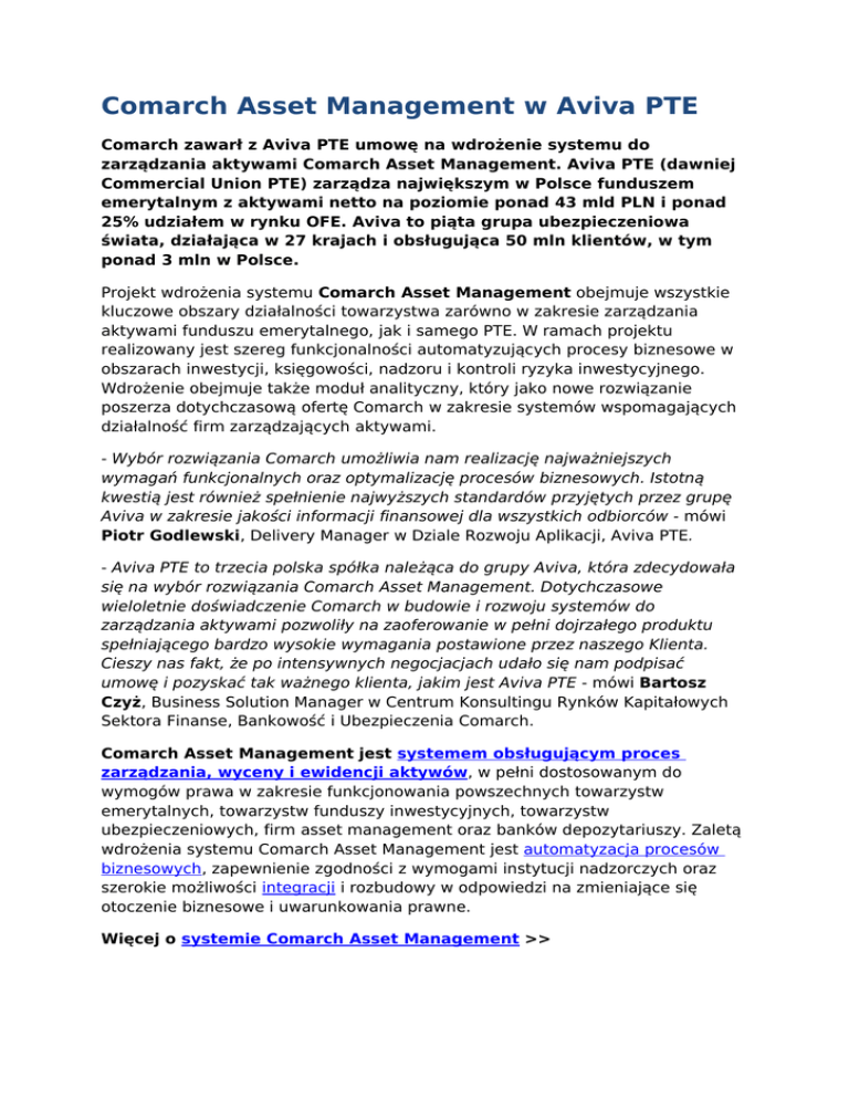Comarch Asset Management w Aviva PTE Comarch zawarł z Aviva PTE umowę na wdrożenie systemu do zarządzania aktywami Comarch Asset Management. Aviva PTE (dawniej Commercial Union PTE) zarządza największym w Polsce funduszem emerytalnym z aktywami netto na poziomie ponad 43 mld PLN i ponad 25% udziałem w rynku OFE. Aviva to piąta grupa ubezpieczeniowa świata, działająca w 27 krajach i obsługująca 50 mln klientów, w tym ponad 3 mln w Polsce. Projekt wdrożenia systemu Comarch Asset Management obejmuje wszystkie kluczowe obszary działalności towarzystwa zarówno w zakresie zarządzania aktywami funduszu emerytalnego, jak i samego PTE. W ramach projektu realizowany jest szereg funkcjonalności automatyzujących procesy biznesowe w obszarach inwestycji, księgowości, nadzoru i kontroli ryzyka inwestycyjnego. Wdrożenie obejmuje także moduł analityczny, który jako nowe rozwiązanie poszerza dotychczasową ofertę Comarch w zakresie systemów wspomagających działalność firm zarządzających aktywami. - Wybór rozwiązania Comarch umożliwia nam realizację najważniejszych wymagań funkcjonalnych oraz optymalizację procesów biznesowych. Istotną kwestią jest również spełnienie najwyższych standardów przyjętych przez grupę Aviva w zakresie jakości informacji finansowej dla wszystkich odbiorców - mówi Piotr Godlewski, Delivery Manager w Dziale Rozwoju Aplikacji, Aviva PTE. - Aviva PTE to trzecia polska spółka należąca do grupy Aviva, która zdecydowała się na wybór rozwiązania Comarch Asset Management. Dotychczasowe wieloletnie doświadczenie Comarch w budowie i rozwoju systemów do zarządzania aktywami pozwoliły na zaoferowanie w pełni dojrzałego produktu spełniającego bardzo wysokie wymagania postawione przez naszego Klienta. Cieszy nas fakt, że po intensywnych negocjacjach udało się nam podpisać umowę i pozyskać tak ważnego klienta, jakim jest Aviva PTE - mówi Bartosz Czyż, Business Solution Manager w Centrum Konsultingu Rynków Kapitałowych Sektora Finanse, Bankowość i Ubezpieczenia Comarch. Comarch Asset Management jest systemem obsługującym proces zarządzania, wyceny i ewidencji aktywów, w pełni dostosowanym do wymogów prawa w zakresie funkcjonowania powszechnych towarzystw emerytalnych, towarzystw funduszy inwestycyjnych, towarzystw ubezpieczeniowych, firm asset management oraz banków depozytariuszy. Zaletą wdrożenia systemu Comarch Asset Management jest automatyzacja procesów biznesowych, zapewnienie zgodności z wymogami instytucji nadzorczych oraz szerokie możliwości integracji i rozbudowy w odpowiedzi na zmieniające się otoczenie biznesowe i uwarunkowania prawne. Więcej o systemie Comarch Asset Management >>