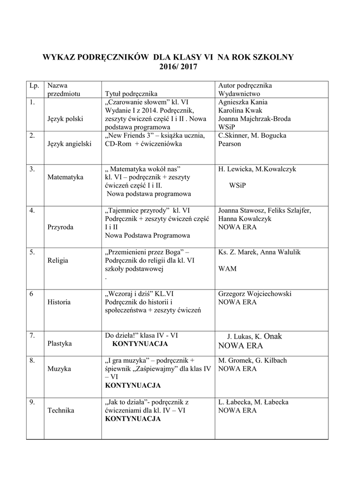 WYKAZ PODRĘCZNIKÓW DLA KLASY VI NA ROK SZKOLNY 2016/ 2017 Lp. Nazwa przedmiotu 1. Język polski 2. Język angielski 3. Matematyka 4. Przyroda 5. Religia 6 Historia 7. Plastyka Tytuł podręcznika „Czarowanie słowem” kl. VI Wydanie I z 2014. Podręcznik, zeszyty ćwiczeń część I i II . Nowa podstawa programowa „New Friends 3” – książka ucznia, CD-Rom + ćwiczeniówka Autor podręcznika Wydawnictwo Agnieszka Kania Karolina Kwak Joanna Majchrzak-Broda WSiP C.Skinner, M. Bogucka Pearson „ Matematyka wokół nas” kl. VI – podręcznik + zeszyty ćwiczeń część I i II. Nowa podstawa programowa H. Lewicka, M.Kowalczyk „Tajemnice przyrody” kl. VI Podręcznik + zeszyty ćwiczeń część I i II Nowa Podstawa Programowa Joanna Stawosz, Feliks Szlajfer, Hanna Kowalczyk NOWA ERA „Przemienieni przez Boga” – Podręcznik do religii dla kl. VI szkoły podstawowej . Ks. Z. Marek, Anna Walulik „Wczoraj i dziś” KL.VI Podręcznik do historii i społeczeństwa + zeszyty ćwiczeń Grzegorz Wojciechowski NOWA ERA Do dzieła!” klasa IV - VI KONTYNUACJA WSiP WAM J. Lukas, K. Onak NOWA ERA Muzyka „I gra muzyka” – podręcznik + M. Gromek, G. Kilbach śpiewnik „Zaśpiewajmy” dla klas IV NOWA ERA – VI KONTYNUACJA Technika „Jak to działa”- podręcznik z ćwiczeniami dla kl. IV – VI KONTYNUACJA 8. 9. L. Łabecka, M. Łabecka NOWA ERA