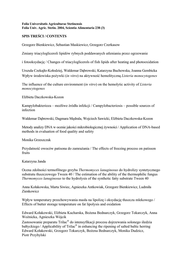 Folia Universitatis Agriculturae Stetinensis Folia Univ. Agric. Stetin. 2004, Scientia Alimentaria 238 (3) SPIS TREŚCI / CONTENTS Grzegorz Bienkiewicz, Sebastian Maskiewicz, Grzegorz Czerkasow Zmiany triacylogliceroli lipidów rybnych poddawanych utlenianiu przez ogrzewanie i fotooksydację / Changes of triacyloglicerols of fish lipids after heating and photooxidation Urszula Czekajło-Kołodziej, Waldemar Dąbrowski, Katarzyna Buchowska, Joanna Gembicka Wpływ środowiska pożywki (in vitro) na aktywność hemolityczną Listeria monocytogenes The influence of the culture environment (in vitro) on the hemolytic activity of Listeria monocytogenes Elżbieta Daczkowska-Kozon Kampylobakterioza – możliwe źródła infekcji / Campylobacteriosis – possible sources of infection Waldemar Dąbrowski, Dagmara Mędrala, Wojciech Sawicki, Elżbieta Daczkowska-Kozon Metody analizy DNA w ocenie jakości mikrobiologicznej żywności / Application of DNA-based methods in evaluation of food quality and safety Monika Grzeszczuk Przydatność owoców patisona do zamrażania / The effects of freezing process on patisson fruits Katarzyna Janda Ocena zdolności termofilnego grzyba Thermomyces lanuginosus do hydrolizy syntetycznego substratu tłuszczowego Tween 40 / The estimation of the ability of the thermophilic fungus Thermomyces lanuginosus to the hydrolysis of the synthetic fatty substrate Tween 40 Anna Kołakowska, Marta Siwiec, Agnieszka Antkowiak, Grzegorz Bienkiewicz, Ludmiła Zienkowicz Wpływ temperatury przechowywania masła na lipolizę i oksydację tłuszczu mlekowego / Effects of butter storage temperature on fat lipolysis and oxidation Edward Kołakowski, Elżbieta Kucharska, Bożena Bednarczyk, Grzegorz Tokarczyk, Anna Woźnicka, Agnieszka Wójcik Zastosowanie preparatu Trilac® do intensyfikacji procesu dojrzewania solonego śledzia bałtyckiego / Applicability of Trilac® in enhancing the ripening of salted baltic herring Edward Kołakowski, Grzegorz Tokarczyk, Bożena Bednarczyk, Monika Dudzicz, Piotr Przybylski Wstępne badania nad przydatnością lotnych zasad do oceny stopnia świeżości śledzi solonych metodą zalewową / Preliminary studies on applicability of volatile bases to evaluation of freshness of brine-salted herring Anna Koronkiewicz, Elżbieta Daczkowska-Kozon, Kamila Markiewicz, Agnieszka Wojciechowska, Ewelina Żmuda, Waldemar Dąbrowski Zwierzyna łowna jako nośnik patogenów jelitowych / Game animals as carriers of enteric pathogens Barbara Oryl Porównanie tekstury wybranych mięśni bydła ras mięsno-mlecznych i mięsnych / The texture’s comparison of chosen cattle’s muscles of meat-milk and meat breeds Joanna Sadowska Ocena wpływu różnych rodzajów suplementacji paszy witaminami na zmiany masy ciała i składu chemicznego tkanki mięśniowej szczura / Estimation of the influence of different kinds of vitamin supplementation of fodder on body weight growth and chemical composition of muscles in rat Wojciech Sawicki, Elżbieta Daczkowska-Kozon, Waldemar Dąbrowski Wykrywanie różnych gatunków mięsa jako składnika żywności przetworzonej przy zastosowaniu technik PCR / Detection of different kinds of meat in processed food using polymerase chain reaction (PCR) Teresa Seidler, Adrian Szyszka Wartość odżywcza racji pokarmowych wegetarian z rejonu Szczecina / Nutritive value of food rations of vegetarians from Szczecin area Katarzyna Skupień, Barbara Jakubowska Porównanie parametrów chemicznych świeżych i mrożonych owoców wybranych odmian truskawek / Comparison of chemical composition of fresh and frozen fruit of selected strawberry cultivars Małgorzata Sobczak, Kazimierz Lachowicz, Joanna Żochowska, Arkadiusz Żych, Marek Kotowicz Porównanie metod parafinowej i mrożenia w przygotowywaniu preparatów histologicznych do analizy struktury tkanki mięśniowej / Comparison of the paraffine and frozen methods of histological sections preparation to evaluate structural elements of the muscle tissue Marek Szczygielski, Anna Kejsa, Elżbieta Urbańska-Kowalska Oznaczanie witamin A i E w produktach o szczególnym znaczeniu żywieniowym / Determination of vitamins A AND E in some nutritionally vital food products Marek Wianecki, Agnieszka Dudzis, Jolanta Krawczuk Wpływ wybranych dodatków białkowych na cechy fizyczne makaronów / Influence of some protein additives on physical properties of pasta Barbara Wójcik-Stopczyńska, Monika Grzeszczuk, Barbara Jakubowska Badanie zmian jakości sałatek warzywnych nisko przetworzonych podczas ich przechowywania / Estimation of quality changes of minimally processed vegetable salads during their storage Joanna Żochowska, Kazimierz Lachowicz, Leszek Gajowieck Małgorzata Sobczak, Arkadiusz Żych, Marek Kotowicz Wydajność łowna, udział elementów zasadniczych oraz wyciek cieplny i pH mięsa dzików o różnej masie / The dressing percentage and percentage of primary cuts in carcasses, thermal drip losses and pH of wild boars meat of different weight –––––––––––––––––––––––––––––––––––––––––––––––––––––––––––––––––––––––– Folia Univ. Agric. Stetin. 2004, Scientia Alimentaria 238(3): 5-12 Grzegorz Bienkiewicz, Sebastian Maskiewicz, Grzegorz Czerkasow Zmiany triacylogliceroli lipidów rybnych poddawanych utlenianiu przez ogrzewanie i fotooksydację Changes of triacyloglicerols of fish lipids after heating and photooxidation Katedra Towaroznawstwa i Oceny Jakości, Akademia Rolnicza ul. Papieża Pawła VI nr 3, 71-459 Szczecin, e-mail: [email protected] Abstract. The triacylglycerol’s (TAG) structure has influence on physical properties and the oxidation stability of lipids. There are conducted a number of investigation, which aim to improve the nourishment’s properties of lipids by TAG structure modification. The objective of this study was to investigate the in