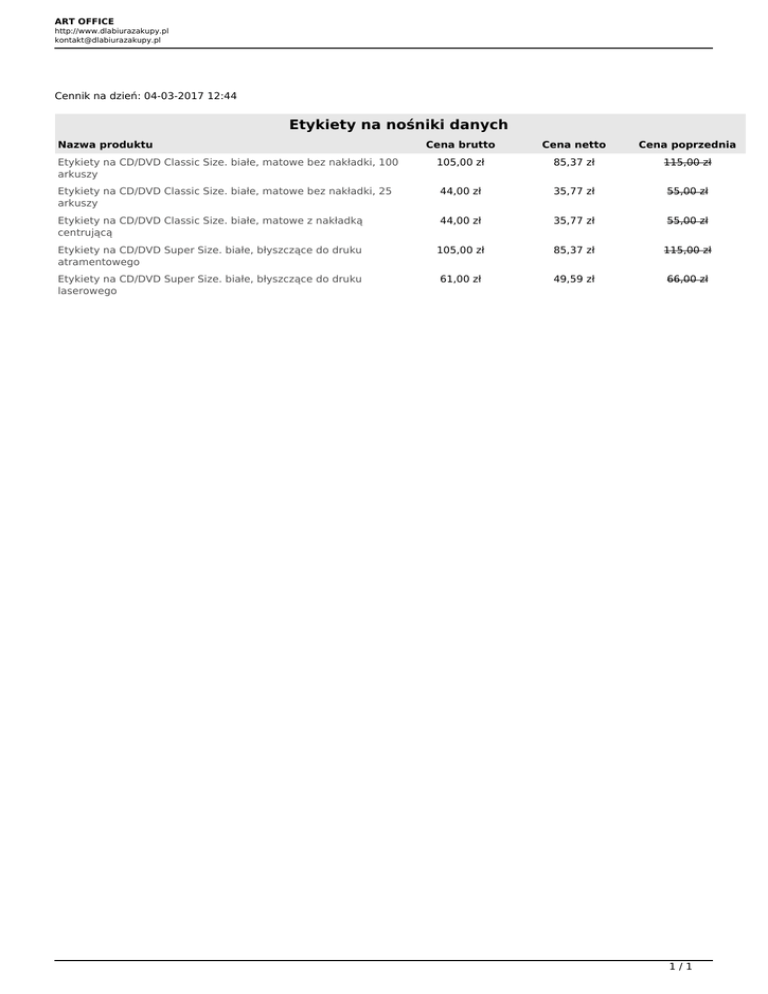 ART OFFICE http://www.dlabiurazakupy.pl [email protected] Cennik na dzień: 04-03-2017 12:44 Etykiety na nośniki danych Nazwa produktu Cena brutto Cena netto Cena poprzednia 105,00 zł 85,37 zł 115,00 zł Etykiety na CD/DVD Classic Size. białe, matowe bez nakładki, 25 arkuszy 44,00 zł 35,77 zł 55,00 zł Etykiety na CD/DVD Classic Size. białe, matowe z nakładką centrującą 44,00 zł 35,77 zł 55,00 zł Etykiety na CD/DVD Super Size. białe, błyszczące do druku atramentowego 105,00 zł 85,37 zł 115,00 zł Etykiety na CD/DVD Super Size. białe, błyszczące do druku laserowego 61,00 zł 49,59 zł 66,00 zł Etykiety na CD/DVD Classic Size. białe, matowe bez nakładki, 100 arkuszy 1/1 Powered by TCPDF (www.tcpdf.org)