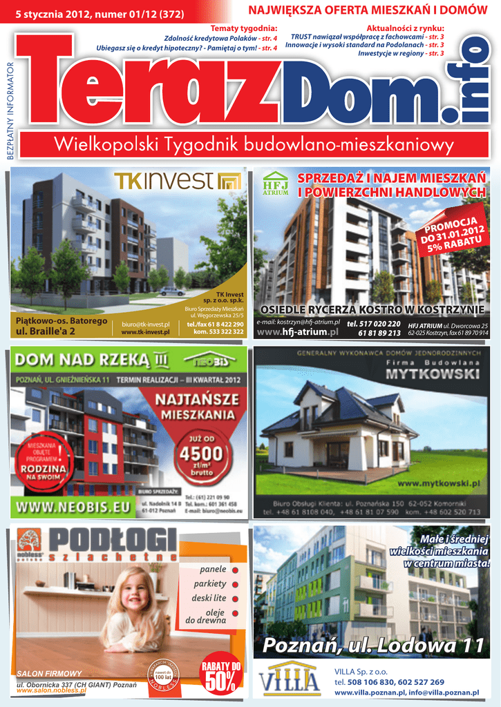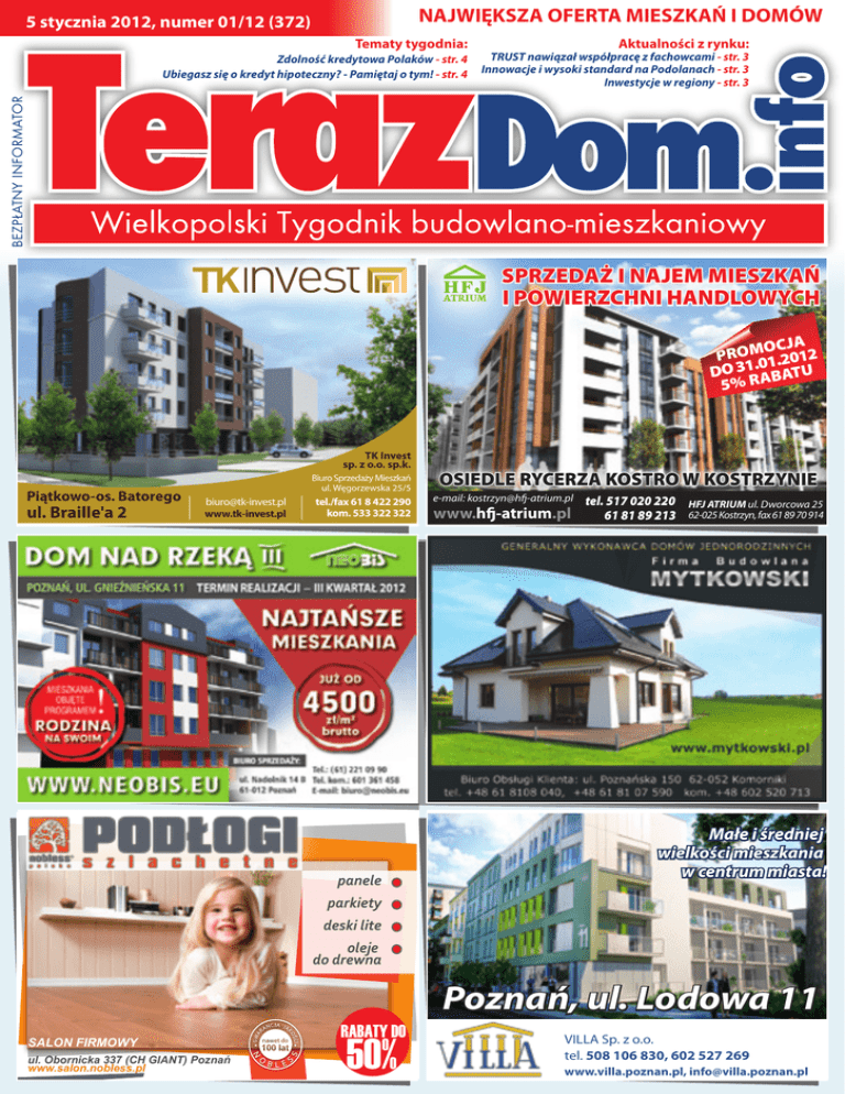 NAJWIĘKSZA OFERTA MIESZKAŃ I DOMÓW 5 stycznia 2012, numer 01/12 (372) Tematy tygodnia: Aktualności z rynku: TRUST nawiązał współpracę z fachowcami - str. 3 Innowacje i wysoki standard na Podolanach - str. 3 Inwestycje w regiony - str. 3 BEZPŁATNY INFORMATOR Zdolność kredytowa Polaków - str. 4 Ubiegasz się o kredyt hipoteczny? - Pamiętaj o tym! - str. 4 SPRZEDAŻ I NAJEM MIESZKAŃ I POWIERZCHNI HANDLOWYCH OCJA PROM 1.2012 .0 DO 31 ABATU 5% R TK Invest sp. z o.o. sp.k. Piątkowo-os. Batorego ul. Braille'a 2 Biuro Sprzedaży Mieszkań ul. Węgorzewska 25/5 [email protected] www.tk-invest.pl tel./fax 61 8 422 290 kom. 533 322 322 panele OSIEDLE RYCERZA KOSTRO W KOSTRZYNIE e-mail: [email protected] www.hfj-atrium.pl tel. 517 020 220 61 81 89 213 HFJ ATRIUM ul. Dworcowa 25 62-025 Kostrzyn, fax 61 89 70 914 Małe i średniej wielkości mieszkania w centrum miasta! parkiety deski lite oleje do drewna Poznań, ul. Lodowa 11 SALON FIRMOWY ul. Obornicka 337 (CH GIANT) Poznań www.salon.nobless.pl VILLA Sp. z o.o. tel. 508 106 830, 602 527 269 www.villa.poznan.pl, [email protected] ELEKTROWNIE WIATROWE POMPY CIEPŁA PANELE SŁONECZNE KOLEKTORY SŁONECZNE tel. 501 664 300 tel. 693 286 349 Biuro: Drużyna, ul. Widokowa 10 www.canbudenergia.pl Osiedle pod Kórnikiem Czmoń Termin realizacji: styczeń 2012r. ul. Gen. Kutrzeby 16g/124 tel. 663 394 891 , 61 624 25 61 2 Powołaj się na NAS! Mieszkania z ogrodem w cenie. www.invea.net.pl ! aktualności z rynku Trust nawiązał współpracę z fachowcami du na koszty zakupu gruntu. Liczne tereny zielone oraz dobrze rozbudowana infrastruktura to największe atuty dzielnicy Podolany. Zawarta umowa dotyczy świadczenia usług z zakresu doradztwa kredytowego dla Klientów zainteresowanych kupnem mieszkania lub domu u dewelopera. Klienci poznańskiego dewelopera Trust S.A. zainteresowani zakupem mieszkania lub domu będą mogli skorzystać z profesjonalnej pomocy kredytowej ekspertów Domu Kredytowego Notus. Specjaliści pomogą zaleźć najbardziej odpowiedni bank, dostosowany do potrzeb i oczekiwań kredytobiorcy, ale również w łatwy i prosty sposób pozwolą przebrnąć przez całą procedurę kredytową. ,,Postanowiliśmy nawiązać współpracę z profesjonalną firmą, która w odpowiedni sposób zadba o naszych Klientów i w znacznym stopniu ułatwi im zakup mieszkania. Nasz nowy kontrahent to niezależny doradca, który porówna oferty, wskaże zalety i wady poszczególnych produktów. Klienci mogą liczyć również na pomoc w wyborze i wynegocjowaniu najkorzystniejszej oferty. Zainteresowani zakupem mieszkania będą mogli zapoznać się z ofertą ponad dwudziestu banków, co pozwoli im zaoszczędzić czas, który musieliby poświęcić na przeanalizowanie poszczególnych propozycji kredytowych.” Innowacje i wysoki standard na Podolanach Rozpoczęła się budowa kolejnego etapu inwestycji na poznańskich Podolanach. Do końca 2012 roku mieszkańcy odbiorą klucze do 87 mieszkań, w dwóch 4-piętrowych budynkach mieszkalnych z windami. Pryzma Developer proponuje mieszkania wykończone w standardzie ,,pod klucz”. Niewątpliwie jest to dużym udogodnieniem dla przyszłych właścicieli. Odbierając klucze do mieszkania, praktycznie można zaraz się wprowadzać. Cały problem związany z wykończeniem spada na dewelopera. Do wyboru jest kilka wariantów wykończenia, więc na pewno każdy znajdzie coś odpowiedniego dla siebie. Bardzo pomocna w podjęciu decyzji jest możliwość obejrzenia mieszkań pokazowych. Elewacja jak i wnętrza budynków wykonane są z najlepszej jakości materiałów. Do wykończenia wykorzystywane są elementy z kamienia naturalnego (marmur, granit, trawertyn, onyks). Mieszkania wyposażone są w system ogrzewania wodno-podłogowego. Podłogi, ze względu na zastosowaną technologię cieplną, wykonane są z płyt kamiennych oraz klejonej deski dębowej. Kuchnia wyposażona jest w sprzęt AGD a sypialnia w szafę wnękową z drzwiami przesuwnymi. Wszystkie mieszkania mają rolety w standardzie. Dodatkowo w każdym lokalu znajduje się łącze światłowodowe z szerokopasmowym dostępem do Internetu. Powstający na Podolanach kompleks mieszkaniowy nie jest ogrzewany prądem, gazem czy węglem, ale ciepłem ziemi. Zastosowany system grzewczy oparty jest w całości na odnawialnych źródłach energii. Dzięki takiemu rozwiązaniu koszty ogrzewania są niższe od cen proponowanych przez miejskiego monopolistę. Dla mieszkańców oznacza to przede wszystkim niższe rachunki. Na osiedlu zaprojektowano dużą ilość terenów zielonych, które w przypadku standardowych inwestycji deweloperskich są często pomijane ze wzglę- W bezpośrednim sąsiedztwie osiedla znajdują się obiekty sportowo-rekreacyjne, galeria handlowa oraz szkoła. Na terenie inwestycji działa przedszkole. W pobliżu znajdują się także dwie galerie handlowe: Plaza, Pestka oraz Pływalnia Octopus. Ponadto niedaleko jest do terenów rekreacyjnych jezior Rusałka i Strzeszynek. Wygodny dojazd do ścisłego centrum zapewni zarówno komunikacja miejska jak i dobrze rozwinięta infrastruktura drogowa. Dzielnica Podolany to bardzo atrakcyjne miejsce na mapie Poznania, ale najlepiej przekonać się samemu, co sprawiło, że Osiedle Podolany stało się już domem dla setek osób. Inwestycje w regiony Atrakcyjność inwestycyjna województw wiąże się bezpośrednio z walorami, które sprzyjają dalszemu ich rozwojowi. Na mapie Polski coraz wyraźniej widać konkretne regiony, które przyciągają biznesmenów oraz nowych mieszkańców. obwodnicy autostradowej, przebudowa portu lotniczego czy dworca kolejowego to bowiem oznaki wyraźnych zmian, korzystnych dla obecnych, ale i przyszłych mieszkańców stolicy Dolnego Śląska. Zainteresowanie zagranicznych inwestorów polskim rynkiem może przy tym świadczyć o ich wierze w możliwości korzystnego lokowania kapitału na naszym „podwórku”. Ma to niebagatelne znaczenie, zwłaszcza w dobie 