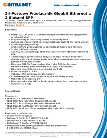 24-Portowy Przełącznik Gigabit Ethernet z 2 Slotami SFP 24 Porty 10/100/1000 Mb/s RJ45 + 2 Sloty SFP, IEEE 802.3az (Energy Efficient Ethernet), Rackowy 19", Metalowy Part No.: 561044 Features: Porty 10/100/1000 z automatycznym wykrywaniem optymalnej prędkości sieci Wyposażony w dwa sloty (SFP) na moduły GBIC Autokrosowanie MDIX na wszystkich portach RJ-45 (auto uplink) Auto-negocjacja NWay Architektura przełączania w technologii Store and forward Tryby full/half duplex Zgodny ze specyfikacją IEEE 802.3az (Energy Efficient Ethernet EEE) Technologia ograniczania zużycia energii "Green Ethernet" deaktywuje nieużywane porty oraz dostosowuje poziom mocy na podstawie długości kabli Obsługa 802.3x flow control dla trybu full duplex oraz collision-based backpressure dla trybu half duplex Obsługa ramek Jumbo o wielkości do 9 kB Bufor pamięci 512 kB Tablica MAC adresów do 8K wpisów Konstrukcja bez wentylatora zapewnia cichą pracę Uchwyty montażowe 19" Obsługa adresów MAC z funkcją auto-learning oraz auto-aging Gwarancja 3 lata Specyfikacja: Standardy • IEEE 802.3 (10Base-T Ethernet) • IEEE 802.3ab (Skrętka Gigabit Ethernet) • IEEE 802.3az (Energy Efficient Ethernet EEE) • IEEE 802.3u (100Base-TX Fast Ethernet) • IEEE 802.3x (kontrola przepływu, dla trybu full duplex) Parametry techniczne • Media transmisyjne: - 10Base-T Cat3, 4, 5 UTP/STP RJ-45 - 100Base-TX Cat5 UTP/STP RJ-45 - 1000Base-T Cat5e UTP/STP RJ-45 • Przepustowość przesyłania/filtrowania pakietów: - 1 488 000 p/s (1000 Mb/s) O pełną ofertę produktów Intellinet pytaj lokalnego resellera lub odwiedź stronę www.intellinet-network.com. Wszystkie nazwy handlowe i towarów występujące w niniejszej publikacji są znakami towarowymi zastrzeżonymi lub nazwami zastrzeżonymi odpowiednich firm odnośnych właścicieli i zostały zamieszczone wyłącznie celem identyfikacji. Dystrybucja i reprodukcja powyższych dokumentów, wykorzystanie zawartości jest zabronione. - 148 800 p/s (100 Mb/s) - 14 880 p/s (10 Mb/s) • Bufor pamięci: 512 kB • Tablica MAC adresów: 8K wpisów • Przepustowość magistrali: 52 Gb/s • Architektura przełączania: store and forward • 24 Porty RJ-45 Gigabit Ethernet • 2 Sloty SFP na moduły GBIC • Certyfikaty: FCC Class A, CE Diody sygnalizacyjne • Zasilanie • Przepustowość dla każdego portu: 1000 Mb/s • Link/Aktywność dla każdego portu Zasilanie • Zasilacz wewnętrzny, 100 - 240 V AC, 50/60 Hz • Pobór mocy: 20 W (maksymalnie) Parametry fizyczne: • Metalowa obudowa, 19" rackowa, 1 U • Wymiary: 440 (L) x 208 (W) x 44 (H) mm • Waga: 3 kg • Temperatura pracy: 0 - 40°C • Wilgotność pracy: 10 - 90% RH, nieskondensowana • Temperatura przechowywania: -10 - 70°C Zawartość opakowania • Przełącznik Rackowy Ethernet Gigabit • Kabel zasilający • Uchwyty mocujące 19" • Instrukcja użytkownika O pełną ofertę produktów Intellinet pytaj lokalnego resellera lub odwiedź stronę www.intellinet-network.com. Wszystkie nazwy handlowe i towarów występujące w niniejszej publikacji są znakami towarowymi zastrzeżonymi lub nazwami zastrzeżonymi odpowiednich firm odnośnych właścicieli i zostały zamieszczone wyłącznie celem identyfikacji. Dystrybucja i reprodukcja powyższych dokumentów, wykorzystanie zawartości jest zabronione. O pełną ofertę produktów Intellinet pytaj lokalnego resellera lub odwiedź stronę www.intellinet-network.com. Wszystkie nazwy handlowe i towarów występujące w niniejszej publikacji są znakami towarowymi zastrzeżonymi lub nazwami zastrzeżonymi odpowiednich firm odnośnych właścicieli i zostały zamieszczone wyłącznie celem identyfikacji. Dystrybucja i reprodukcja powyższych dokumentów, wykorzystanie zawartości jest zabronione.