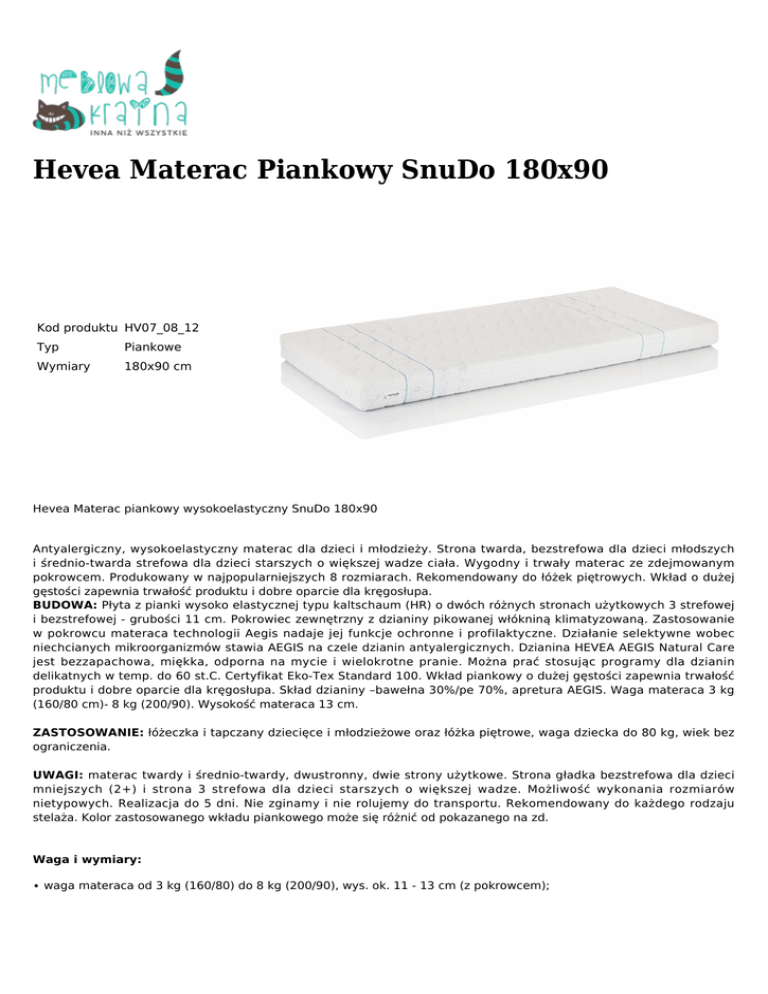 Hevea Materac Piankowy SnuDo 180x90 Kod produktu HV07_08_12 Typ Piankowe Wymiary 180x90 cm Hevea Materac piankowy wysokoelastyczny SnuDo 180x90 Antyalergiczny, wysokoelastyczny materac dla dzieci i młodzieży. Strona twarda, bezstrefowa dla dzieci młodszych i średnio-twarda strefowa dla dzieci starszych o większej wadze ciała. Wygodny i trwały materac ze zdejmowanym pokrowcem. Produkowany w najpopularniejszych 8 rozmiarach. Rekomendowany do łóżek piętrowych. Wkład o dużej gęstości zapewnia trwałość produktu i dobre oparcie dla kręgosłupa. BUDOWA: Płyta z pianki wysoko elastycznej typu kaltschaum (HR) o dwóch różnych stronach użytkowych 3 strefowej i bezstrefowej - grubości 11 cm. Pokrowiec zewnętrzny z dzianiny pikowanej włókniną klimatyzowaną. Zastosowanie w pokrowcu materaca technologii Aegis nadaje jej funkcje ochronne i profilaktyczne. Działanie selektywne wobec niechcianych mikroorganizmów stawia AEGIS na czele dzianin antyalergicznych. Dzianina HEVEA AEGIS Natural Care jest bezzapachowa, miękka, odporna na mycie i wielokrotne pranie. Można prać stosując programy dla dzianin delikatnych w temp. do 60 st.C. Certyfikat Eko-Tex Standard 100. Wkład piankowy o dużej gęstości zapewnia trwałość produktu i dobre oparcie dla kręgosłupa. Skład dzianiny –bawełna 30%/pe 70%, apretura AEGIS. Waga materaca 3 kg (160/80 cm)- 8 kg (200/90). Wysokość materaca 13 cm. ZASTOSOWANIE: łóżeczka i tapczany dziecięce i młodzieżowe oraz łóżka piętrowe, waga dziecka do 80 kg, wiek bez ograniczenia. UWAGI: materac twardy i średnio-twardy, dwustronny, dwie strony użytkowe. Strona gładka bezstrefowa dla dzieci mniejszych (2+) i strona 3 strefowa dla dzieci starszych o większej wadze. Możliwość wykonania rozmiarów nietypowych. Realizacja do 5 dni. Nie zginamy i nie rolujemy do transportu. Rekomendowany do każdego rodzaju stelaża. Kolor zastosowanego wkładu piankowego może się różnić od pokazanego na zd. Waga i wymiary: ∙ waga materaca od 3 kg (160/80) do 8 kg (200/90), wys. ok. 11 - 13 cm (z pokrowcem); ∙ dostępne rozmiary: 160/80, 180/80, 190/80, 200/80, 160/90, 180/90, 190/90, 200/90 Czas oczekiwania: 1-5 dni roboczych. Rodzaj pokrowca: Aegis Natural Care. Twardość: H3 (twardy). Gwarancja: 24 miesiące.