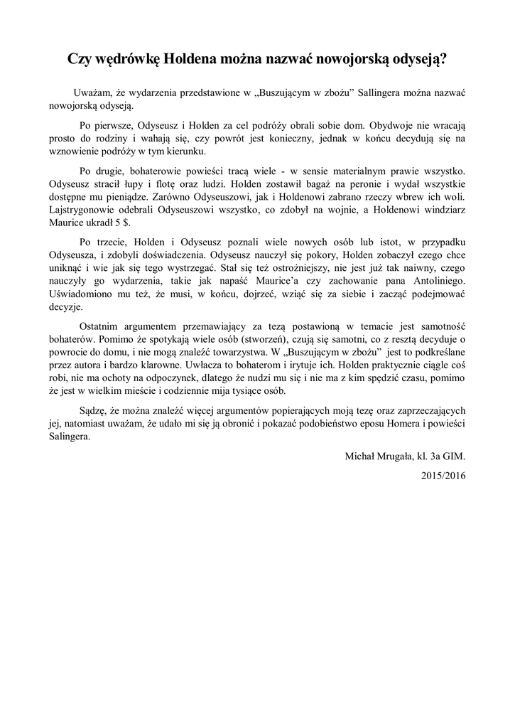 Czy wędrówkę Holdena można nazwać nowojorską odyseją? Uważam, że wydarzenia przedstawione w „Buszującym w zbożu” Sallingera można nazwać nowojorską odyseją. Po pierwsze, Odyseusz i Holden za cel podróży obrali sobie dom. Obydwoje nie wracają prosto do rodziny i wahają się, czy powrót jest konieczny, jednak w końcu decydują się na wznowienie podróży w tym kierunku. Po drugie, bohaterowie powieści tracą wiele - w sensie materialnym prawie wszystko. Odyseusz stracił łupy i flotę oraz ludzi. Holden zostawił bagaż na peronie i wydał wszystkie dostępne mu pieniądze. Zarówno Odyseuszowi, jak i Holdenowi zabrano rzeczy wbrew ich woli. Lajstrygonowie odebrali Odyseuszowi wszystko, co zdobył na wojnie, a Holdenowi windziarz Maurice ukradł 5 $. Po trzecie, Holden i Odyseusz poznali wiele nowych osób lub istot, w przypadku Odyseusza, i zdobyli doświadczenia. Odyseusz nauczył się pokory, Holden zobaczył czego chce uniknąć i wie jak się tego wystrzegać. Stał się też ostrożniejszy, nie jest już tak naiwny, czego nauczyły go wydarzenia, takie jak napaść Maurice’a czy zachowanie pana Antoliniego. Uświadomiono mu też, że musi, w końcu, dojrzeć, wziąć się za siebie i zacząć podejmować decyzje. Ostatnim argumentem przemawiający za tezą postawioną w temacie jest samotność bohaterów. Pomimo że spotykają wiele osób (stworzeń), czują się samotni, co z resztą decyduje o powrocie do domu, i nie mogą znaleźć towarzystwa. W „Buszującym w zbożu” jest to podkreślane przez autora i bardzo klarowne. Uwłacza to bohaterom i irytuje ich. Holden praktycznie ciągle coś robi, nie ma ochoty na odpoczynek, dlatego że nudzi mu się i nie ma z kim spędzić czasu, pomimo że jest w wielkim mieście i codziennie mija tysiące osób. Sądzę, że można znaleźć więcej argumentów popierających moją tezę oraz zaprzeczających jej, natomiast uważam, że udało mi się ją obronić i pokazać podobieństwo eposu Homera i powieści Salingera. Michał Mrugała, kl. 3a GIM. 2015/2016