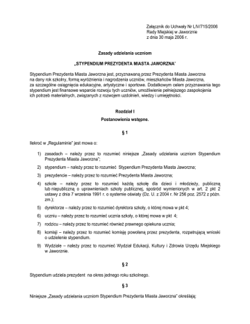 Załącznik do Uchwały Nr LIV/715/2006 Rady Miejskiej w Jaworznie z dnia 30 maja 2006 r. Zasady udzielania uczniom „STYPENDIUM PREZYDENTA MIASTA JAWORZNA” Stypendium Prezydenta Miasta Jaworzna jest, przyznawaną przez Prezydenta Miasta Jaworzna na dany rok szkolny, formą wyróŜnienia i nagrodzenia uczniów, mieszkańców Miasta Jaworzna, za szczególne osiągnięcia edukacyjne, artystyczne i sportowe. Dodatkowym celem przyznawania tego stypendium jest finansowe wsparcie rozwoju tych uczniów, umoŜliwienie pełniejszego zaspokojenia ich potrzeb materialnych, związanych z rozwojem uzdolnień, wiedzy i umiejętności. Rozdział I Postanowienia wstępne. §1 Ilekroć w „Regulaminie” jest mowa o: 1) zasadach – naleŜy przez to rozumieć niniejsze „Zasady udzielania uczniom Stypendium Prezydenta Miasta Jaworzna”; 2) stypendium – naleŜy przez to rozumieć Stypendium Prezydenta Miasta Jaworzna; 3) prezydencie – naleŜy przez to rozumieć Prezydenta Miasta Jaworzna; 4) szkole – naleŜy przez to rozumieć kaŜdą szkołę dla dzieci i młodzieŜy, publiczną lub niepubliczną o uprawnieniach szkoły publicznej, spośród wymienionych w art. 2 pkt 2 ustawy z dnia 7 września 1991 r. o systemie oświaty (Dz. U. z 2004 r. Nr 256 poz. 2572 z późn. zm.); 5) dyrektorze – naleŜy przez to rozumieć dyrektora szkoły, o której mowa w pkt 4; 6) uczniu – naleŜy przez to rozumieć ucznia szkoły, o której mowa w pkt 4; 7) rodzicu – naleŜy przez to rozumieć równieŜ prawnego opiekuna ucznia; 8) komisji – naleŜy przez to rozumieć komisję powołaną przez prezydenta, rozpatrującą wnioski o udzielenie stypendium. 9) Wydziale – naleŜy przez to rozumieć Wydział Edukacji, Kultury i Zdrowia Urzędu Miejskiego w Jaworznie. §2 Stypendium udziela prezydent na okres jednego roku szkolnego. §3 Niniejsze „Zasady udzielania uczniom Stypendium Prezydenta Miasta Jaworzna” określają: 1) kryteria udzielania stypendium, 2) tryb jego udzielania, 3) wysokość i warunki jego wypłacania. Rozdział II Kryterium udzielania stypendium. §4 Stypendium moŜe być przyznane uczniowi, mającemu wybitne osiągnięcia edukacyjne, artystyczne lub sportowe, w szczególności: 1) laureatowi międzynarodowej olimpiady lub laureatowi i finaliście olimpiady przedmiotowej o zasięgu ogólnopolskim lub turnieju; 2) laureatowi i finaliście konkursów przedmiotowych lub tematycznie innych o znaczącej randze; 3) laureatowi konkursu na pracę naukową, organizowanego przez instytucję naukową lub stowarzyszenie naukowe; 4) uczniowi uczestniczącemu w zajęciach przewidzianych tokiem studiów na podstawie przepisów w sprawie zasad i warunków uczestniczenia wybitnie uzdolnionych uczniów w zajęciach przewidzianych tokiem studiów na kierunkach zgodnych z uzdolnieniami oraz zasad zaliczania tych zajęć; 5) uczniowi uzyskującemu wysokie wyniki w nauce wyraŜone średnią ocen końcoworocznych na poziomie co najmniej 5,3 oraz wzorowym zachowaniem; 6) uczniowi uzyskującemu wysokie wyniki we współzawodnictwie sportowym indywidualnym lub zespołowym, na szczeblu regionalnym, krajowym lub międzynarodowym; 7) uczniowi, który zdobył, w dziedzinie sztuki, nagrody, wyróŜnienia i czołowe miejsca w konkursach, festiwalach, wystawach i przeglądach o znaczącej randze. §5 1. O przyznanie stypendium uczeń moŜe ubiegać się nie wcześniej niŜ po ukończeniu przez niego pierwszego roku nauki w danym typie szkoły, z zastrzeŜeniem ust. 2 i ust. 3. 2. Stypendium nie udziela się uczniom klas I - III szkoły podstawowej. 3. Stypendium nie udziela się uczniom, którzy w danym roku szkolnym ukończyli jedną ze szkół dla młodzieŜy, spośród wymienionych w art. 9 ust. 1 pkt 3 lit a – f ustawy z dnia 7 września 1991 r. o systemie oświaty (jednolity tekst: Dz. U. z 2004 r. Nr 256 poz. 2572 z późn. zm.), z zastrzeŜeniem ust. 4. 4. Postanowienie ust. 3 nie dotyczy absolwentów zasadniczych szkół zawodowych, pod warunkiem dostarczenia przez nich do Wydziału, w terminie do dnia 6 września danego roku, zaświadczenia o podjęciu nauki w liceum uzupełniającym dla młodzieŜy lub technikum uzupełniającym dla młodzieŜy. Rozdział III Tryb przyznawania stypendium. §6 1. Z wnioskiem o udzielenie uczniowi stypendium mogą wystąpić: 1) dyrektor szkoły, do której uczęszcza uczeń, 2) prezes klubu sportowego 3) dyrektor Miejskiego Centrum Kultury i Sportu w Jaworznie, 4) co najmniej jeden z rodziców, 5) sam pełnoletni uczeń. 2. Wniosek o stypendium winien być złoŜony na formularzu, będącym załącznikiem do zasad. 3. Do wniosku o stypendium powinny być dołączone następujące dokumenty: a) potwierdzona za zgodność przez szkołę kserokopia świadectwa ucznia za dany rok szkolny, b) opinia rady pedagogicznej szkoły (zespołu szkół) do której uczęszcza uczeń, c) inne dokumenty lub ich, potwierdzone za zgodność, kserokopie uzasadniające wniosek w szczególności dotyczące osiągnięć ucznia. 4. Wnioski o udzielenie stypendium naleŜy składać w kancelarii Urzędu Miejskiego w Jaworznie, ul. Grunwaldzka 33, w terminie do 31 sierpnia danego roku. §7 1. Wnioski o udzielenie stypendium rozpatruje komisja, w skład której wchodzą: 1) zastępca prezydenta odpowiedzialny za sprawy oświaty i wychowania lub upowaŜniona przez prezydenta osoba, 2) przedstawiciel Komisji ds. Edukacji Rady Miejskiej w Jaworznie, 3) przedstawiciel Komisji ds. Kultury, Sportu i Turystyki Rady Miejskiej w Jaworznie, 4) przedstawiciel Delegatury Kuratorium Oświaty w Sosnowcu, 5) naczelnik Wydziału lub upowaŜniony przez niego pracownik Wydziału. 2. Osobowy skład komisji powołuje prezydent w drodze zarządzenia, 3. Przewodniczący komisji moŜe zaprosić do udziału w pracach komisji, z głosem doradczym, osoby zawodowo związane z edukacją, sztuką lub sportem. 4. Wnioski o udzielenie stypendium komisja rozpatruje w terminie do dnia 10 września danego roku, następnie, w terminie